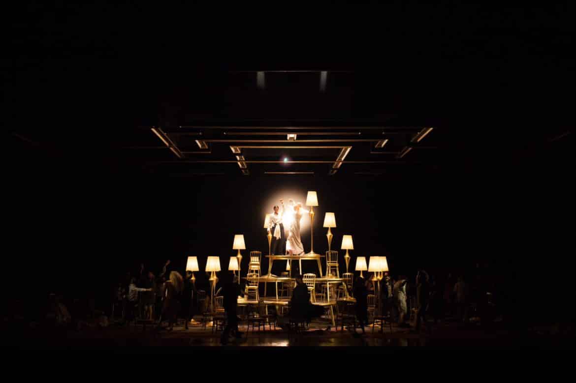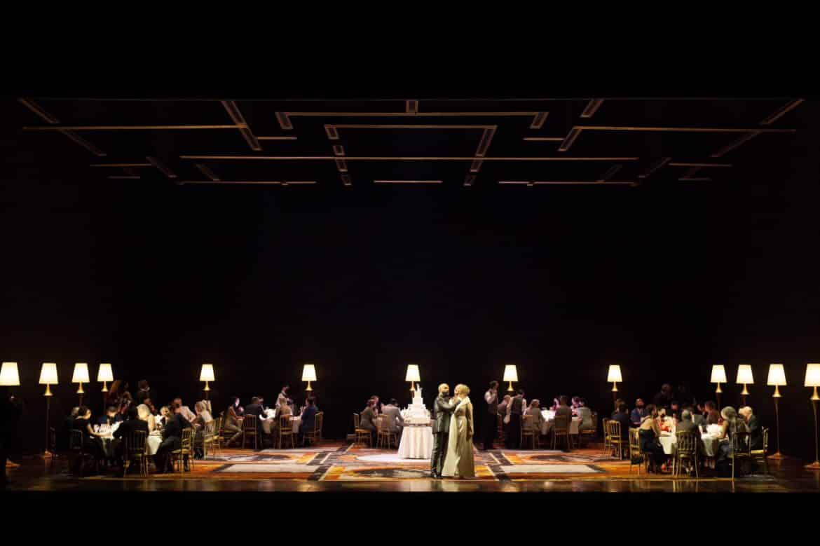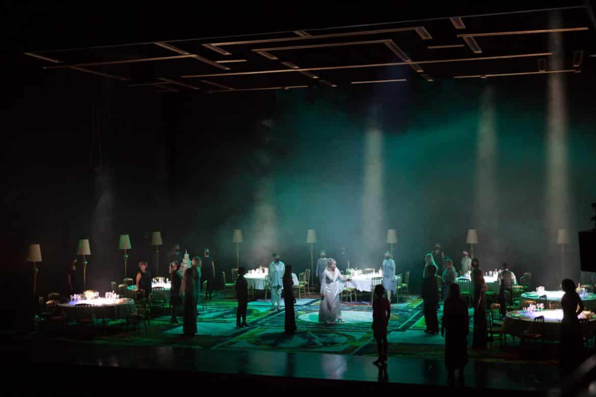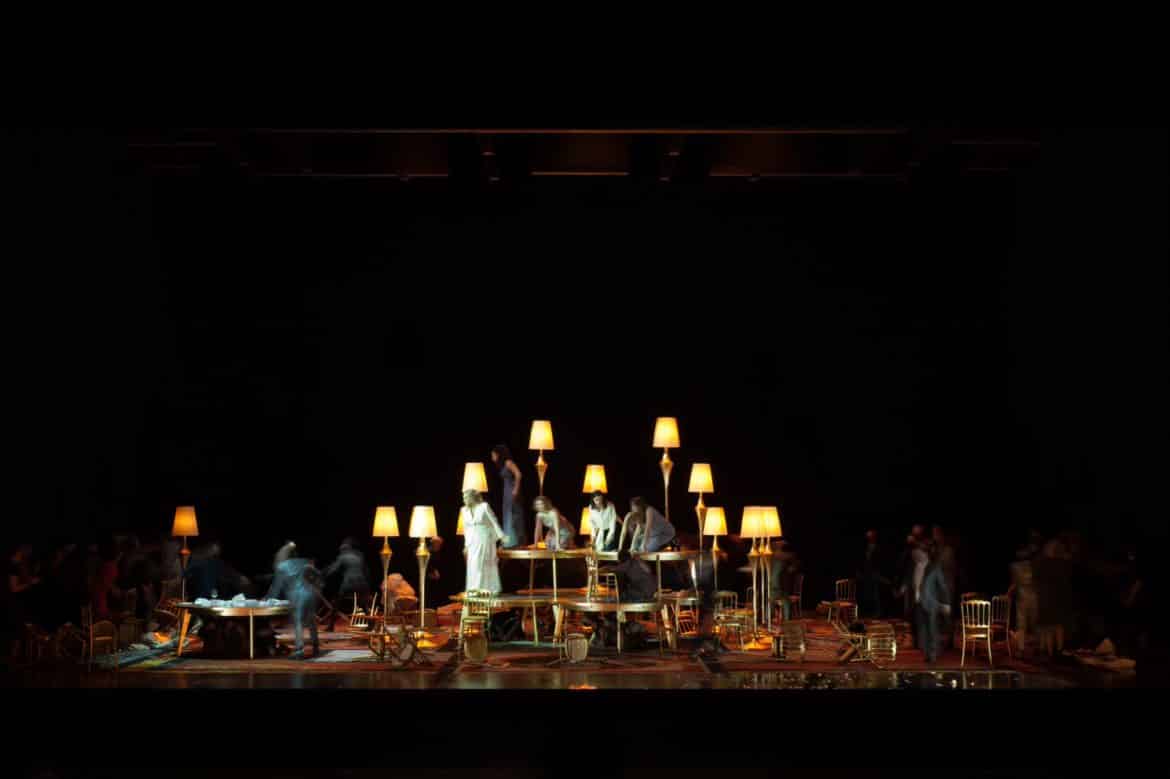Les lumières calibrées par Urs Schönebaum façonnent les mirages des diverses portes de la demeure, dont la seule qui compte est celle qui est frappée d’interdit. Le dispositif scénographique – et lumineux – modèle des effets de dédoublement spéculaires, sans appuyer le propos outre les vertus plastiques, avant de découvrir un ordonnancement symétrique de tables rondes aux allures de dîner de gala, jalonné de lampadaire coniques aux standards de l’élégance impersonnelle. Le sens de la composition picturale se retrouve dans la rébellion des épouses au deuxième acte : le mobilier du repas de noces est empilé pour faire un pinacle à Ariane, autour de laquelle se rassemblent ses comparses dans un triomphe digne de l’art pompier plus ou moins contemporain de l’époque de la création de l’opéra, qui ne manque pas néanmoins de faire écho à l’énergie des luttes du féminisme et de ses néo-avatars d’aujourd’hui – dont la harangue au début de la captation par deux membres d’un collectif revendiquant l’occupation de l’Opéra résume les stéréotypes les plus inclusifs. Le troisième acte s’ouvre également sur un large cadre vide évoquant un miroir de salle d’ablutions. C’est vers les coulisses qu’Ariane et la Nourrice repartiront, laissant les femmes s’avancer vers le devant de la scène, sans trop souligner la paradoxale et mélancolique poésie de ce finale.