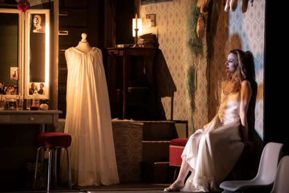 Au lever de rideau, on découvre que le Duc est le directeur d’une troupe de ballet dont les danseuses sont toutes déjà passées, ou passeront une nuit, par le lit. Dans un décor de coulisse où rien ne manque (coin régie, écrans de contrôle, portants surchargés de tutus, etc.) déambulent l’habilleuse Giovanna, le régisseur Sparafucile, le père d’une ballerine enceinte des œuvres du Duc (Monterone) et un professeur de danse à la silhouette claudicante. Dans la transposition de Richard Brunel et de la dramaturge Catherine Ailloud-Nicolas, Rigoletto n’est effectivement pas bossu mais boiteux : on imagine qu’il fut autrefois un grand danseur mais qu’un accident a brisé net sa carrière. Parmi les secrets qui le hantent, Rigoletto vit en permanence avec le fantôme de son épouse disparue, ancienne danseuse qui a peut-être elle aussi subi le harcèlement du Duc, et avec l’impérieux besoin de protéger sa fille qu’il garde recluse dans une loge minuscule, ne lui autorisant un peu de liberté qu’à la nuit tombée, après le spectacle, lorsque les coulisses du théâtre sont rendues à la pénombre et au silence.