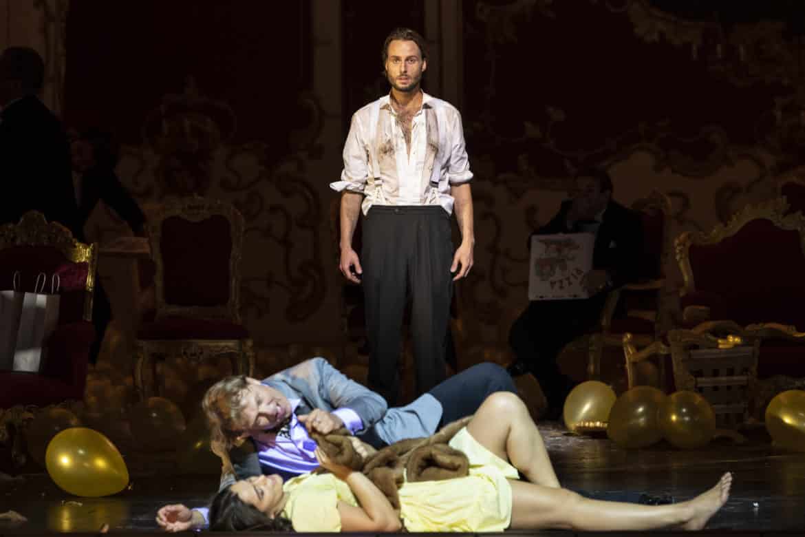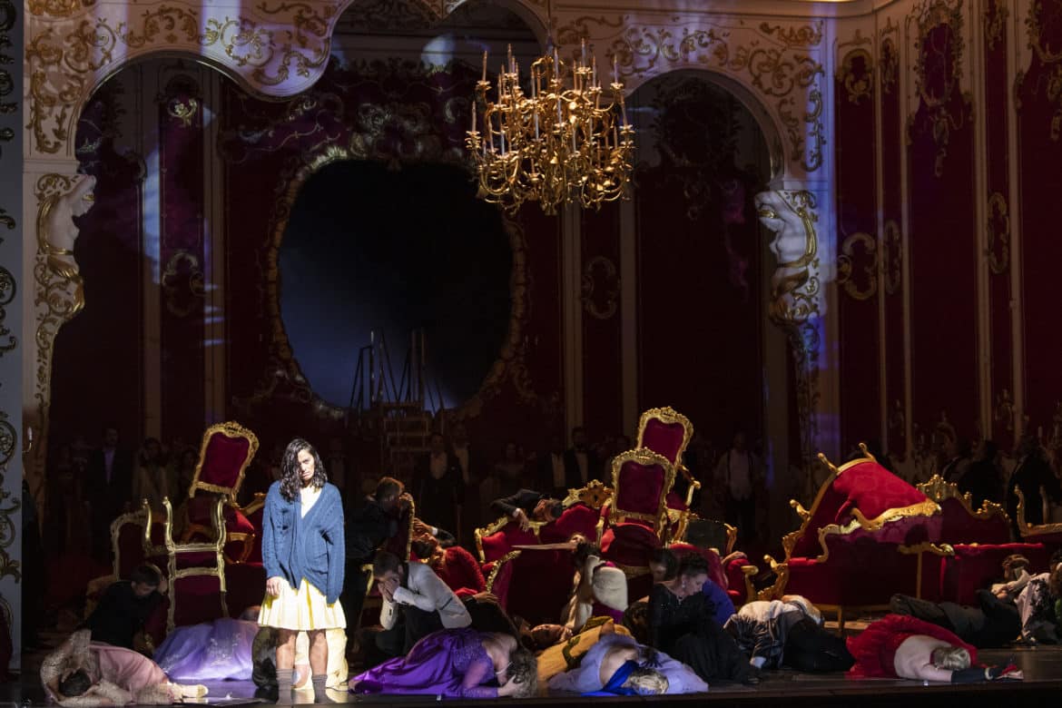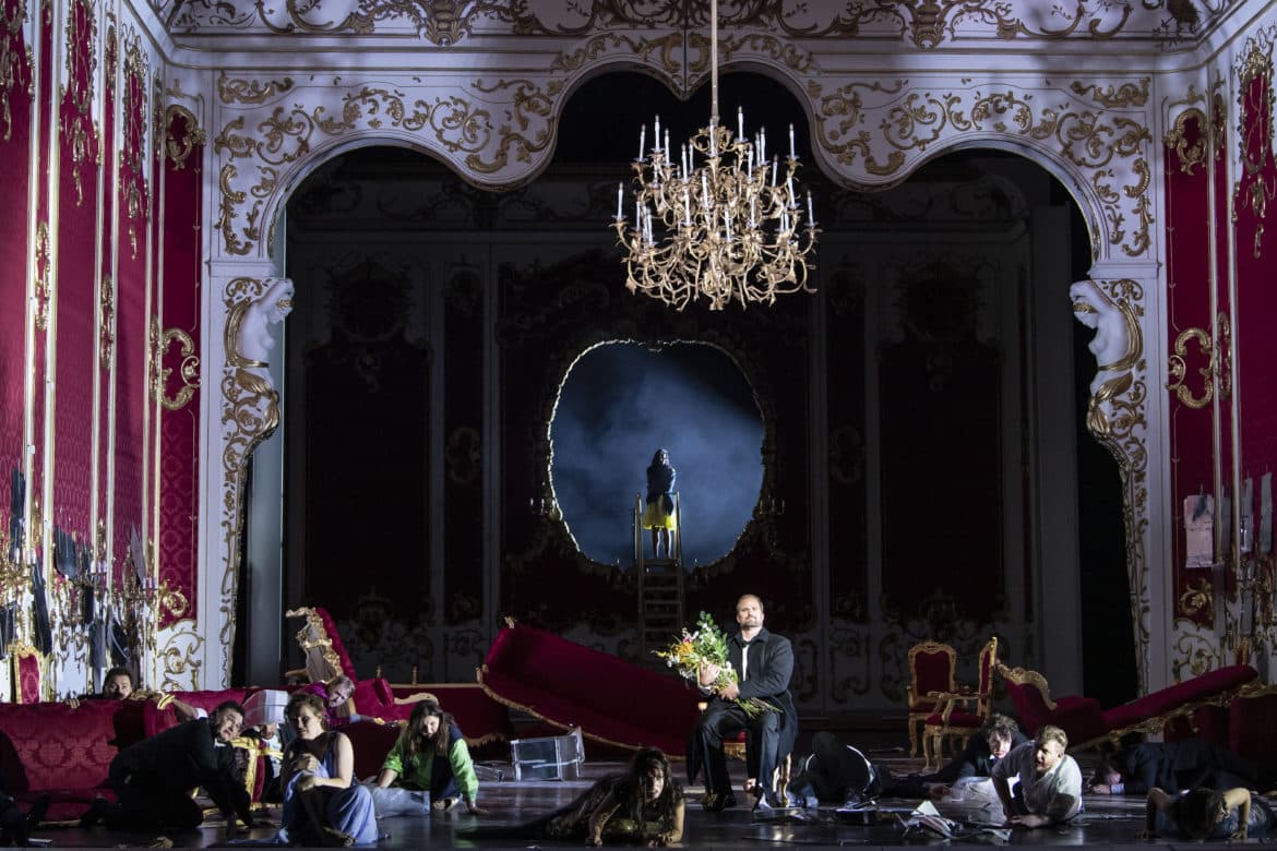 L’aspect ouvertement idéologique de l’opéra est remis en question par la lecture de Calixto Bieito qui, avec la dramaturgie de Beate Breidenbach et la scénographie de Rebecca Ringst, convoque en première partie l’atmosphère surréaliste de El ángel exterminador, le film de Luis Buñuel de 1962 dans lequel les invités d’une soirée d’après-théâtre ne peuvent quitter la maison de leurs hôtes. Ici, les nobles de Saint-Pétersbourg, invités à un bal à la veille du Nouvel An 1810, dans les élégants vêtements contemporains d’Ingo Krügler, ont un ennemi invisible, inconnu, incertain. Après Napoléon et Hitler, quelle est la menace aujourd’hui ? Peut-être sont-ils eux-mêmes l’abîme qu’ils doivent redouter ? Peut-être doivent-ils craindre l’énigme que constitue leur propre humanité ?…
