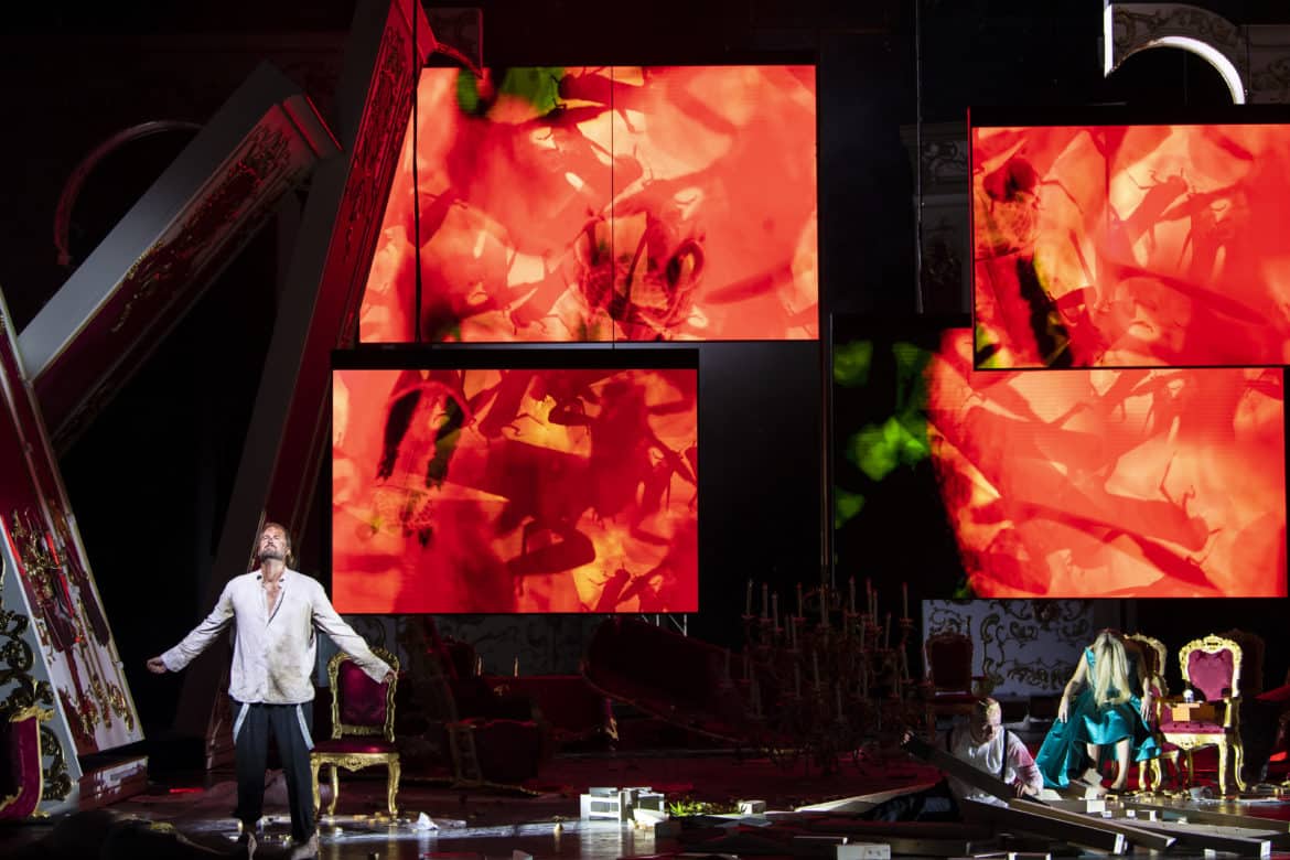 Dans la mise en scène de Bieito – le metteur en scène se produit pour la première fois au théâtre de Genève –, la scène reproduit fidèlement le boudoir de Maria Aleksandrovna, née Maria de Hesse-Darmstadt, épouse de l’empereur Alexandre II, avec ses stucs dorés, les fauteuils et canapés en velours rouge, les cariatides aux seins opulents, le grand miroir ovale sur le mur du fond, qui est ici un écran sur lequel sont projetées les images vidéo de Sarah Derendinger et permet ensuite d’apercevoir des ruines fumantes à l’extérieur. Comme dans le film de Buñuel, les aristocrates passent leur temps en conversations oiseuses, inconscients du monde extérieur où plane une sombre menace, et le fait que les meubles empilés suite aux disputes opposant les personnages les uns aux autres se transforment en barricades (comme l’annonce le colonel Denisov à la fin du septième tableau : « Un courrier de Vilno : Napoléon a déployé des troupes à la frontière. Ça ressemble à une guerre ») apparaît presque le fruit du hasard.