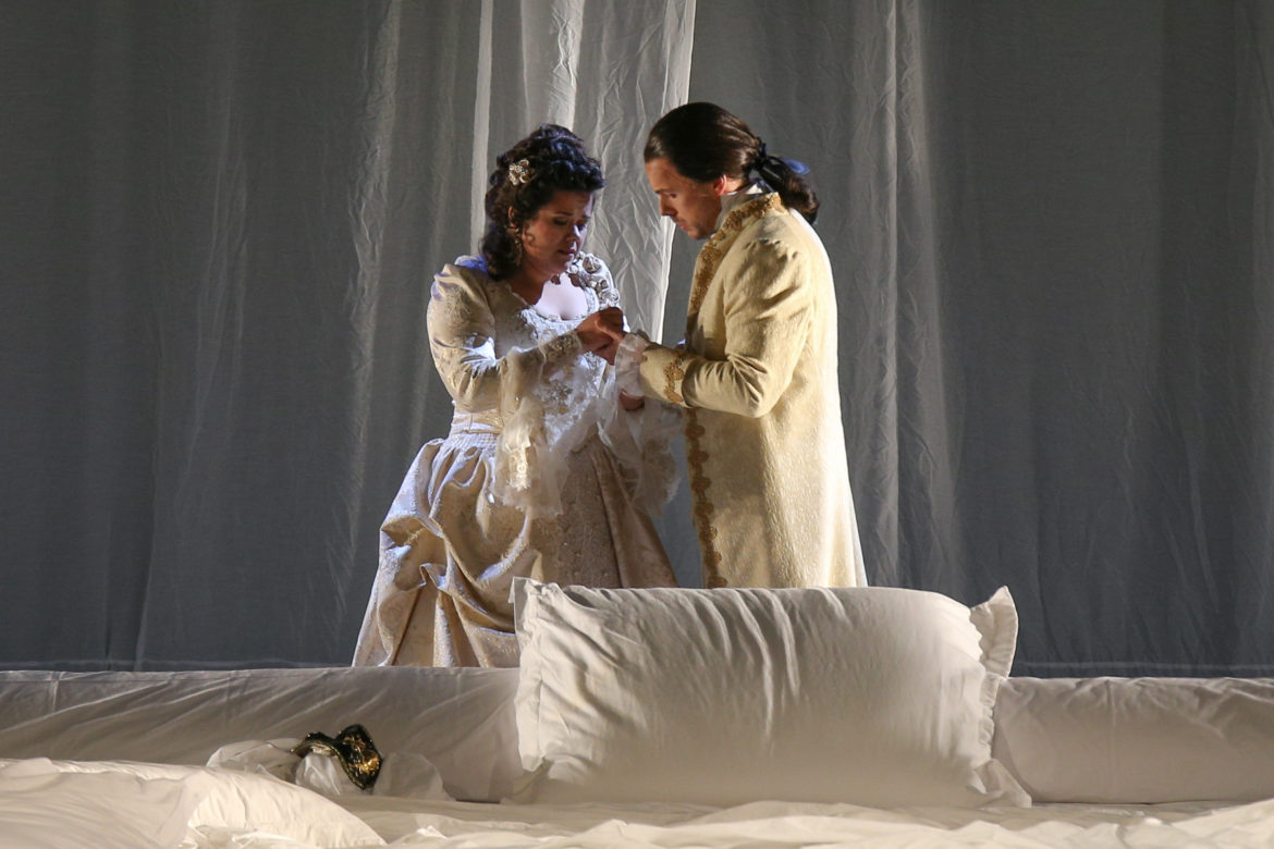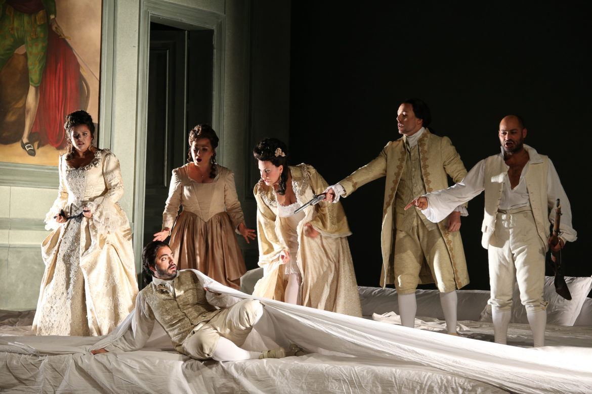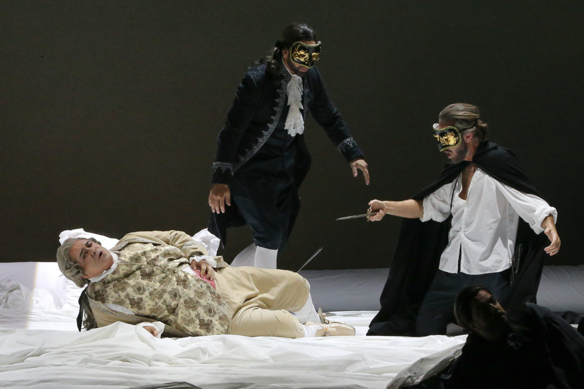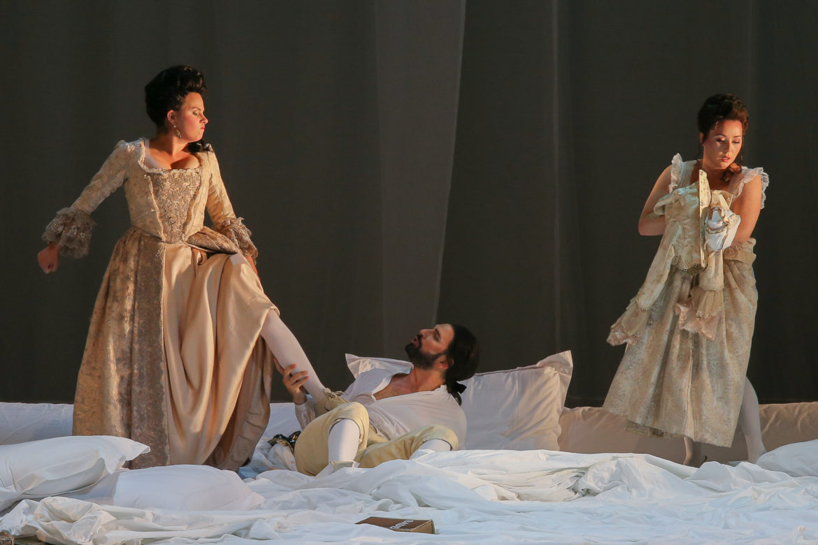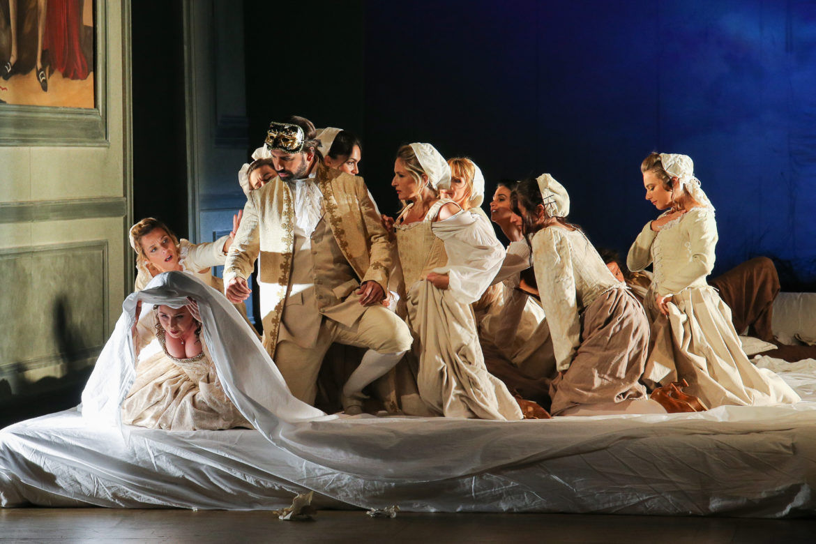 Alors que le public a pris place sous les fresques raffinées de l’Opéra aux accords de La Marche pour la cérémonie des Turcs de Lully, le feu apparaît sur la scène, projeté sur un voile. Cet élément symbolique est une indication tacite des flammes du désir qui s’exprimera avec violence tout au long de la pièce, mais elles suggèrent aussi les flammes de la damnation qui va s’abattre sur Don Juan. Alors que le décor campé est plutôt ancien, l’on est surpris d’entendre des revendications sociales très actuelles exprimées à travers des voix timbrées où la stabilité vocale renchérit la fermeté des propos. En effet, « Non voglio più servir » est répété maintes fois par Leporello (Pablo Ruiz) et la dénonciation de la domesticité inopportune est atténuée par un rythme badin et des notes rebondies. Un grand drap étalé sur la scène évoque à la fois l’alcôve et la toile du peintre, de nombreuses scènes reproduisent de manière très esthétique des tableaux de maître. Le choix du drap, élément immuable du décor, est loin d’être anodin. En effet, il évoque le lit, l’endroit où, selon Heredia tout se produit, la naissance, l’amour, la mort.