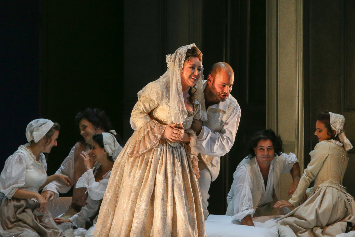 Elvira, interprétée par la brillante Marie-Eve Munger est éplorée, celui qui lui a donné la vie est mort. Les sanglots qu’elle ne peut réprimer s’immiscent dans son chant. En effet l’on entend contre toute attente une respiration au milieu de la « Vi-ta » qui, loin d’être malencontreuse, témoigne d’un point de vue méta-textuel d’une vie brisée : l’on perçoit l’évocation de la mort à travers sa prononciation entrecoupée du mot « Vie ». Grâce à un usage de la vidéo tout à fait équilibré, selon la méthode de prédilection de Paulo Correia, le décor classique se meut. Ces lumières qui font bouger les contours de la scène attestent les tourments de l’âme qui tiraillent les personnages et ne cessent de croître. Le stade esthétique dans lequel le personnage de Don Giovanni est enferré selon l’analyse élaborée par Kierkegaard est savamment rendu sur plusieurs plans du décor, l’aspect artistique est très soigné, l’on apprécie le raffinement des scènes et des poses et l’on déplore que Don Giovanni ne se résolve pas à atteindre le stade éthique. Le vibrato subtil d’Elvira dénote le drame et agit en contraste avec le chant guilleret du baryton Don Giovanni, interprété par Guido Loconsolo. Il chante avec une assurance  pareille à son personnage, sa voix homogène dans les aigus comme dans les graves et l’aplomb avec lequel il entonne ses mélodies participent de l’incarnation de Don Juan. À travers ses modulations vocales, le chanteur n’entend pas représenter un individu mais un type. Les aigus du baryton, loin d’être métalliques sont particulièrement doux et agréables à l’oreille. Le chœur, disposé dans les loges côté jardin et côté cour de la scène réalise un effet stéréo qui plonge le public dans une ambiance toute particulière. Le baryton-basse Daniel Giulianini, qui joue Masetto, montre beaucoup d’aisance vocale, il chante sans faiblir, avec beaucoup de coffre. Lorsqu’il chante allongé avec une puissance non altérée, l’on perçoit l’étendue de sa technique. L’interprétation du fameux duo La ci darem la mano est quelque peu surprenante. Il semble effectué au ralenti et chanté avec de la réserve. L’accent est mis sur les nuances piano. Il semble que les chanteurs s’économisent. C’est en fait une version minimaliste de la page qui rebat les cartes de la hiérarchie musicale des morceaux et bouleverse le caractère fétiche de la musique que les auditeurs ont tendance à adopter, et que dénonce Adorno dans son opuscule éponyme. Les paysans apparaissent sur scène dans une vision à la fois orgiaque et bucolique, et insensiblement, adoptent des poses qui sont non sans rappeler La liberté guidant le peuple de Delacroix. Par ailleurs, à un autre moment du spectacle, alors que les chanteurs cherchent à débusquer « le traître » avec leurs fusils, l’on peut reconnaître une évocation du Tres de Mayo de Goya. Zerlina interprétée par Khatouna Gadelia chante avec beaucoup de vigueur et d’entrain ; Donna Anna interprétée par Anaïs Constans chante avec des modulations justes et précises. Alasdair Kent quant à lui interprète Don Ottavio avec beaucoup d’élégance, sa tessiture de ténor est claire et parfaitement timbrée. Enfin, le Commandeur hante la scène à la fin du spectacle avec des projections démultipliées de ses avatars. Cela renvoie au tableau de Magritte Les hommes qui tombent. L’individualité du Commandeur est supprimée par la multiplication de ses figures mais sa voix les rassemble toutes avec un ton implacable, un coffre tonitruant, une couleur chaude et dramatique qui donne des frissons. Il est magnifiquement interprété par Ramaz Chikviladze.