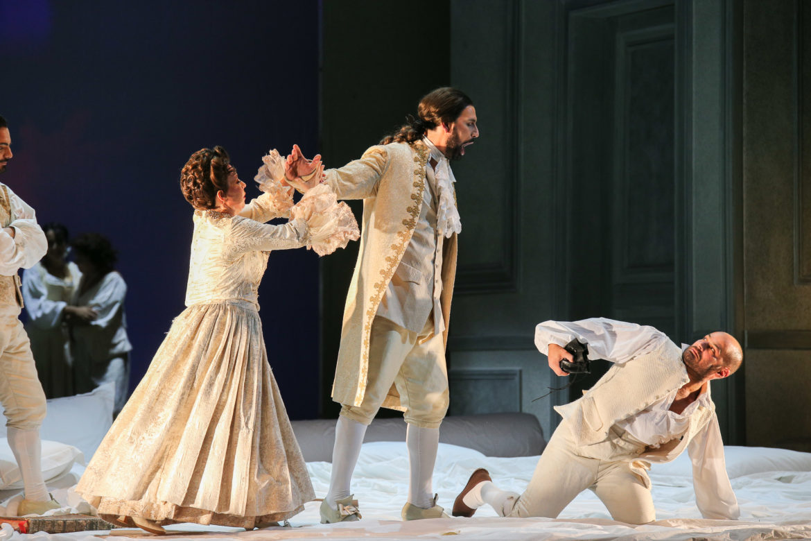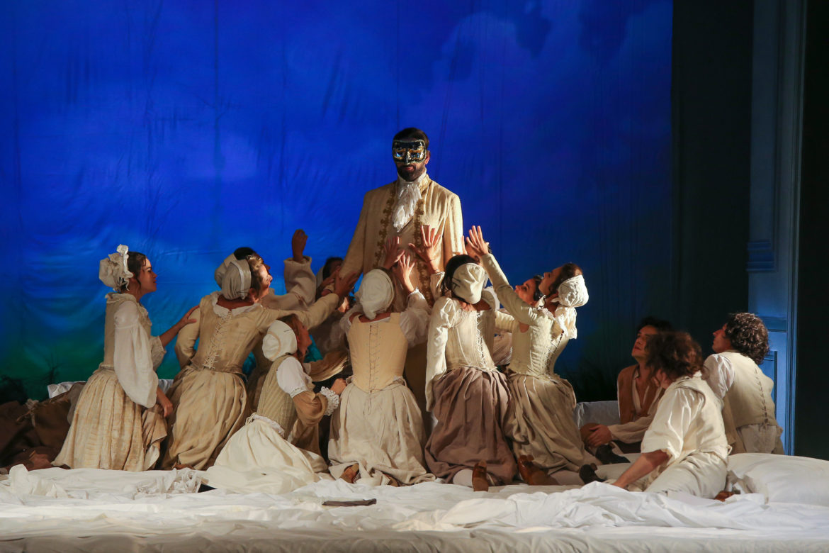Dans une mise en scène remarquable de Daniel Benoin et revêtus de costumes d’époque admirablement confectionnés par Nathalie Bérard-Benoin, les chanteurs évoluent sur scène, évoquant tour à tour Les liaisons dangereuses et les tableaux de Magritte, dirigés par le chef attentif et tout sourire Jordan de Souza.