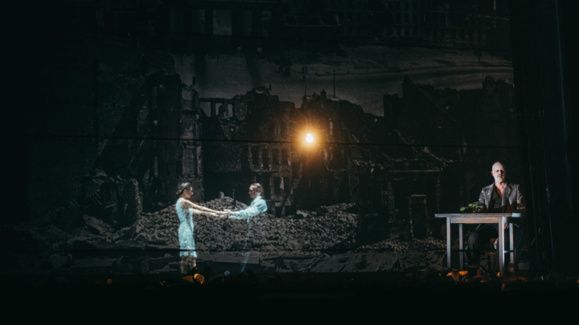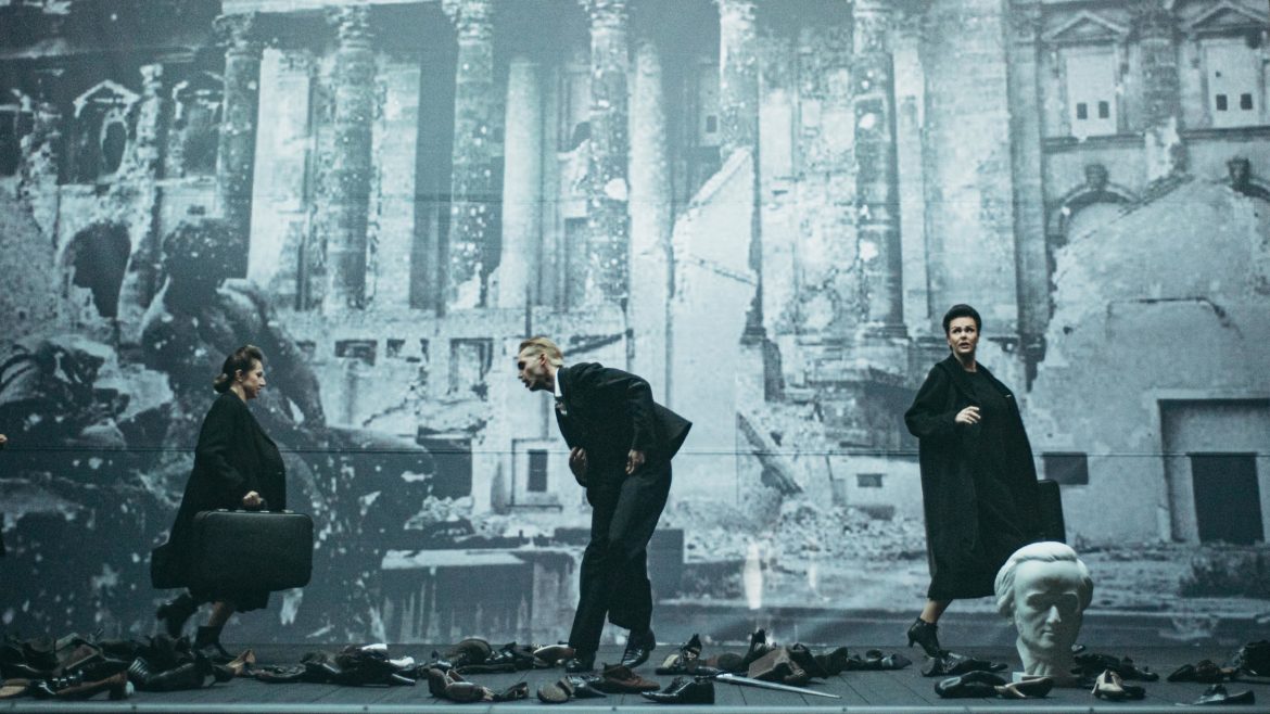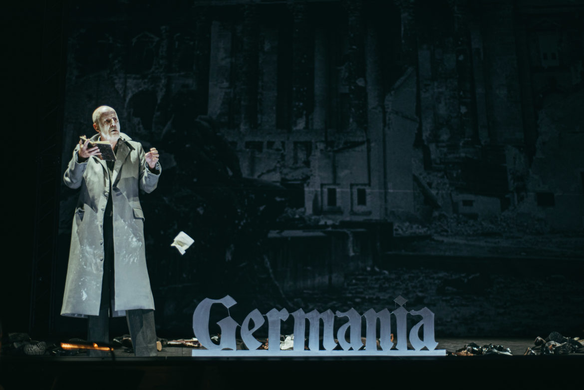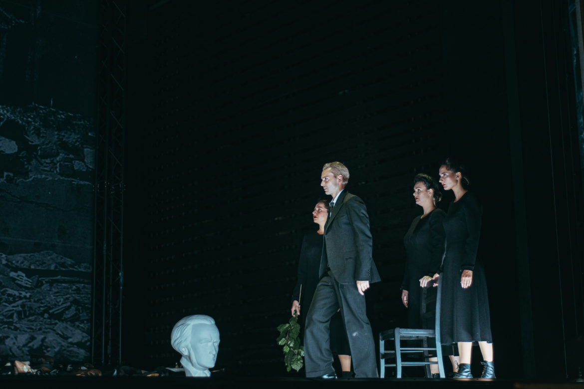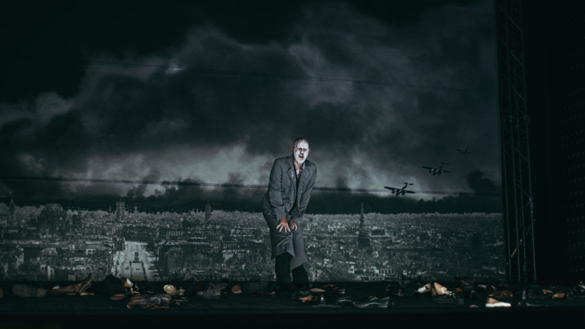 Olivier Py signe, sur son propre texte, une mise en scène essentiellement illustrative et narrative. Un choix surprenant de sa part mais bienvenu ici, contrepoint idéal à une musique et à un livret qui ne font pas forcément de leur sens du récit leur première qualité. Quelques valises, un buste, des chaussures, un très bel Ange de l’Histoire, trois femmes suffisent à raconter beaucoup. Il y a aussi cette magnifique scénographie très cinématographique de Pierre-André Weitz et ce très beau noir et blanc de Bertrand Killy aux lumières. Le film de Spielberg La Liste de Schindler pourrait n’être pas loin mais nous n’y sommes pas et le spectacle laisse ainsi toute la place à l’imaginaire du spectateur.