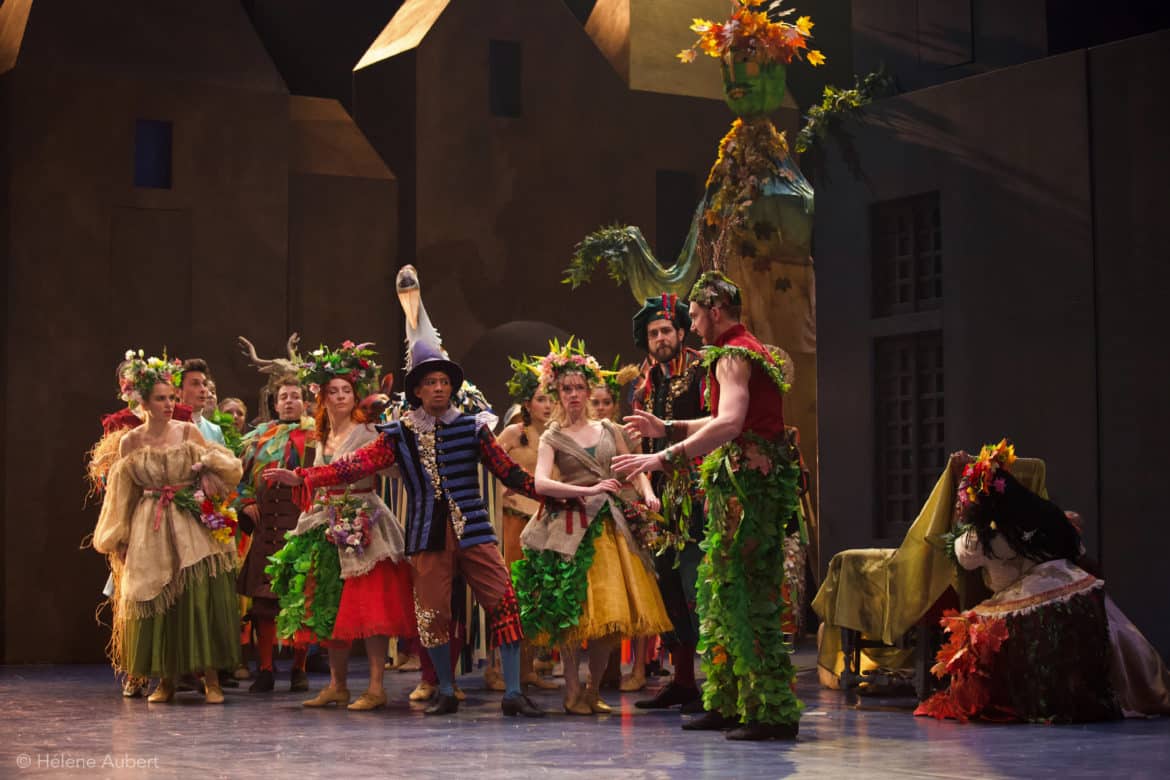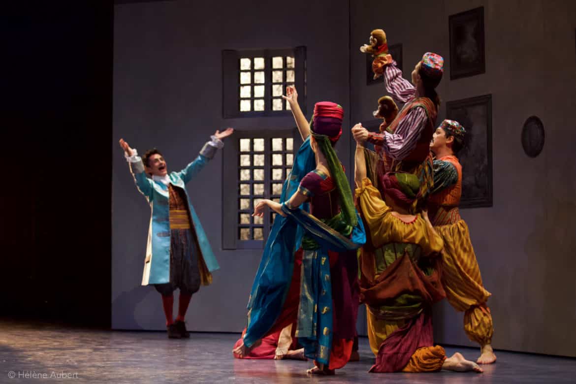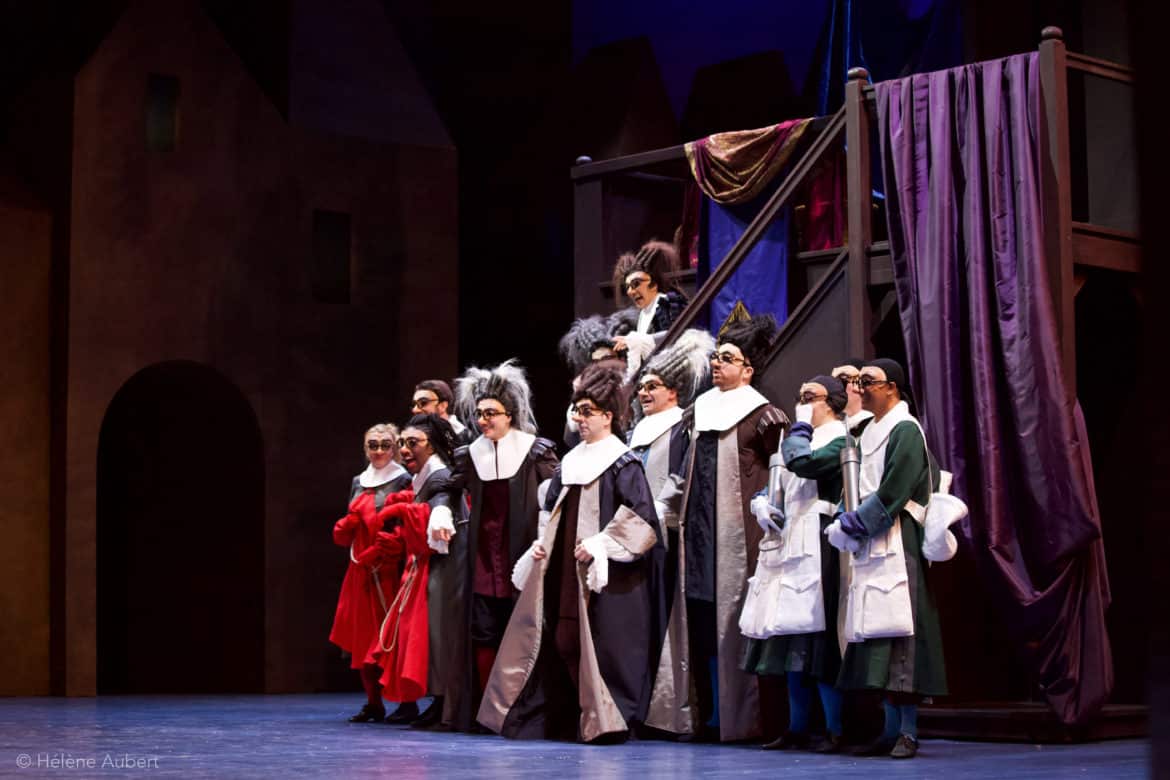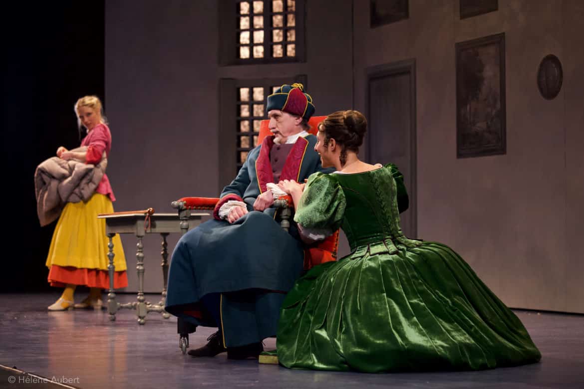 Pour faire dialoguer texte et musique, le choix de Vincent Tavernier comme metteur en scène est particulièrement bienvenu : réalisant aussi bien des spectacles de théâtre que d’opéra, amoureux de Molière, Vincent Tavernier joue judicieusement la carte de la comédie pure, sans alourdir le propos par des références à notre présent (les liens avec l’actualité s’établissent d’eux-mêmes, nul besoin de les surligner à gros traits !), sans renoncer à certains aspects « farcesques » de la comédie, mais sans les grossir exagérément non plus : bref, un travail précis, fidèle à l’esprit de l’œuvre, et conférant au spectacle une belle fluidité et un sens du rythme très appréciable : qui songerait, au terme de la soirée, qu’elle a duré près de 3h30 ?… Vincent Tavernier est secondé par une chorégraphe imaginative (Marie-Geneviève Massé), une scénographe habile : Claire Niquet (les décors sont sobres et simples, le spectacle devant pouvoir s’adapter à des scènes aux dimensions variées au cours de sa tournée), un costumier talentueux : Erick Plaza-Cochet (quelle fantaisie dans les superbes costumes du Carnaval !), et par une équipe de comédiens formidables : Pierre-Guy Cluzeau est un Argan exempt de cabotinage et d’exagérations, ce qui ne diminue en rien la force comique du personnage, particulièrement irrésistible lorsqu’il prend les intonations d’un enfant plaintif et geignard avec sa femme. Béline, précisément, est incarnée par une Jeanne Bonenfant jouant au mieux l’hypocrisie cruelle et intéressée. Marie Loisel est une Toinette espiègle, volontaire, et qui apporte à sa façon de dire le texte un brin de modernité tout à fait bienvenu. Les deux tourtereaux (Juliette Malfray et Olivier Bérhault) sont adorables de fraîcheur, Laurent Prévôt donne une belle épaisseur au rôle un peu secondaire de Béralde (notamment grâce à un timbre de voix très intéressant), et les Diafoirus père et fils (Quentin-Maya Boyé et Benoît Dallongeville) déclenchent les rires à chacune de leurs interventions !