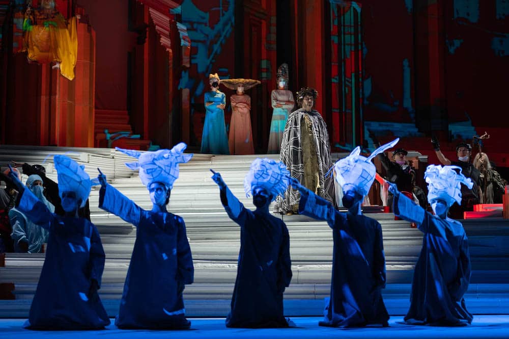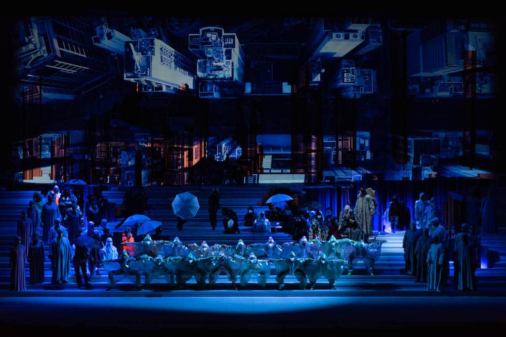 L’idée de confier à un artiste chinois la mise en scène d’un opéra se déroulant en Chine n’est pas si étrange : on se souvient que la Turandot de Zhang Ymou se déroulait dans la Cité interdite de Pékin. Mais cette fois, il ne s’agit pas d’un réalisateur (bien qu’il soit également cinéaste), mais d’un artiste aux multiples facettes : Ai Weiwei, performeur, documentariste, sculpteur, architecte (il a conçu le stade national de Pékin), poète et activiste politique qui a payé sa dissidence et sa rébellion contre le régime par la prison. Ce n’est pas la première fois qu’il se mesure à Turandot : il y a 35 ans, il était figurant (l’assistant du bourreau…) dans quelques-unes des 202 représentations du spectacle de Zeffirelli à New York, mais c’est la première, « et la dernière fois », tient-il à préciser, qu’il participe à la mise en scène d’un opéra. Cette production était prévue il y a deux ans, mais la pandémie a retardé sa mise en place jusqu’à aujourd’hui. Après la Covid et la guerre en Ukraine, cependant, le spectacle ne pouvait plus rester le même, déclare le metteur en scène, qui concentre sa lecture sur la scénographie et les interventions vidéo en négligeant la mise en scène – les personnages principaux n’ont pas de rôle d’acteur défini, le chœur est immobile, les seules interventions originales sont celles des mouvements d’un mime de l’artiste chinois Chiang Ching et les mouvements rythmiques d’un groupe de jeunes. « Il s’agit d’un opéra plongé dans le monde contemporain, au sein des luttes culturelles et politiques actuelles », explique l’artiste, « Turandot est la force et le pouvoir, Calaf un réfugié politique ». La scène est transformée en planisphère – ce qui n’est pas du tout évident pour les spectateurs dans les gradins – les contours des continents étant sculptés dans un grand escalier. Le chœur, presque omniprésent, prend place dans ces trous, pour moitié dans des costumes « traditionnels » (conçus par Ai Weiwei lui-même), ou dans des uniformes militaires modernes. Sous l’éclairage de Peter van Praet, des ruines stylisées s’élèvent, rappelant celles de la ville qui accueille la représentation, tandis que des images de la Chine d’aujourd’hui, avec ses gratte-ciel et ses autoroutes, sont projetées en toile de fond, ainsi que des charges de police harcelant des jeunes réclamant la liberté à Hong Kong, des réfugiés pataugeant dans des rivières pour fuir leur pays déchiré par la guerre, et des migrants dans des clôtures de barbelés. Et puis, il y a les combinaisons anti-contamination portées par les médecins de Wuhan, la ville d’où est originaire le virus Corona…