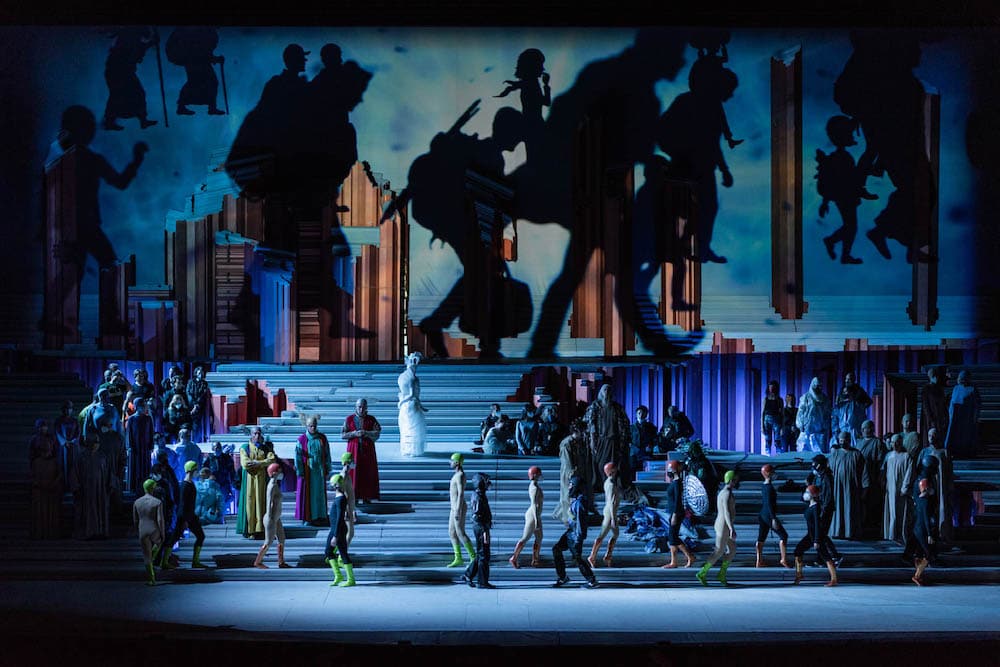 Le Teatro dell’Opera de Rome est teinté des couleurs du drapeau ukrainien, celles d’un ciel clair et de champs de blé dorés. La façade est éclairée par des lumières bleues et jaunes tandis qu’à l’intérieur, les deux responsables de production sont une cheffe d’orchestre née dans le pays tourmenté et un réalisateur chinois dissident qui a fait l’expérience directe de la répression culturelle dans son pays. L’interprète principal est également née en Ukraine. Sur la scène c’est une histoire de violence et de cruauté immotivées, d’abnégation suprême pour son prochain et de foule manipulable. Si quelqu’un avait encore des doutes sur la modernité de l’opéra…