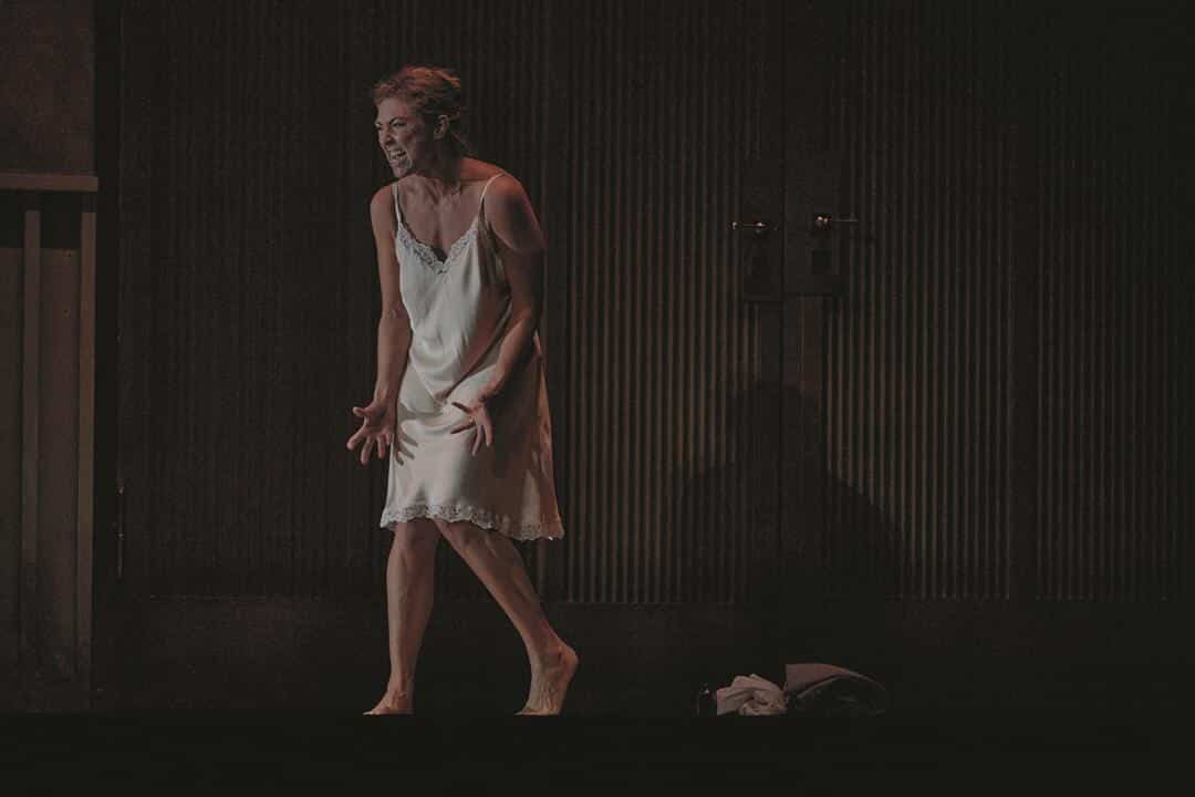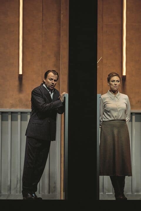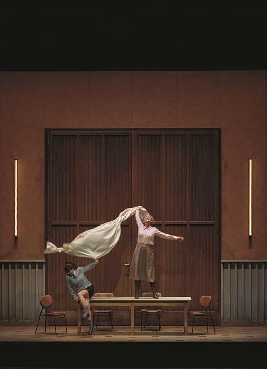 Le metteuse en scène néerlandaise Jetske Mijnssen opte pour une lecture hyper-minimaliste : les villageois n’apparaissent même pas sur scène mais chantent en coulisses. La scène donne une impression d’enfermement étouffant, avec un intérieur conçu par Julia Katharina Berndt composé de trois pièces identiques, presque interchangeables, sans fenêtres, avec des portes communicantes et sur le mur du fond, une double porte ouvrant sur un néant brumeux. Oubliez la nuit d’été, l’écoulement de la rivière : une triste prison renferme en son sein les personnages, et même si les trois pièces défilent devant nos yeux, c’est toujours la même ambiance qui réapparaît : la table méticuleusement préparée avec une nappe que Kat’a, dans un moment d’insouciance, transforme en voile blanc. Même les costumes des années 1950 de Dieuweke van Reij ne permettent pas d’échapper aux brimades de Dikoj envers son neveu ou de Marfa Ignatjewna envers la belle-fille. Dans la dramaturgie de Simon Berger, tout est condensé en ces trois petites pièces : on voit ainsi Kudriaš faire la leçon au jeune Kuligin sur la table, la folle nuit du vieux Dikoj et de Marfa se consumer de façon grotesque sous la table de l’autre pièce, tandis que dans celle d’à côté, Kát’a commence à succomber à la tentation du « péché ». Dans le finale, la femme ne se jette pas dans la Volga mais s’empoisonne et meurt affalée sur le sol avec Boris, qui n’est pas parti. La vieille Kabanová ne remercie pas ses compagnons de village, qui ne sont pas présents comme mentionné, mais s’adresse directement au public, avec un effet tout aussi glaçant. Puis elle apparaît dans l’autre pièce et semble s’effondrer de douleur. Elle apparaît ainsi elle aussi comme une femme malheureuse suscitant la compassion de la metteuse en scène…