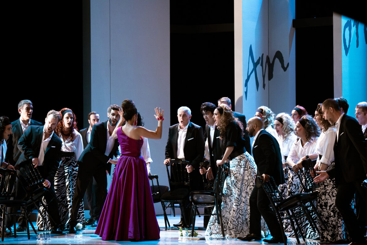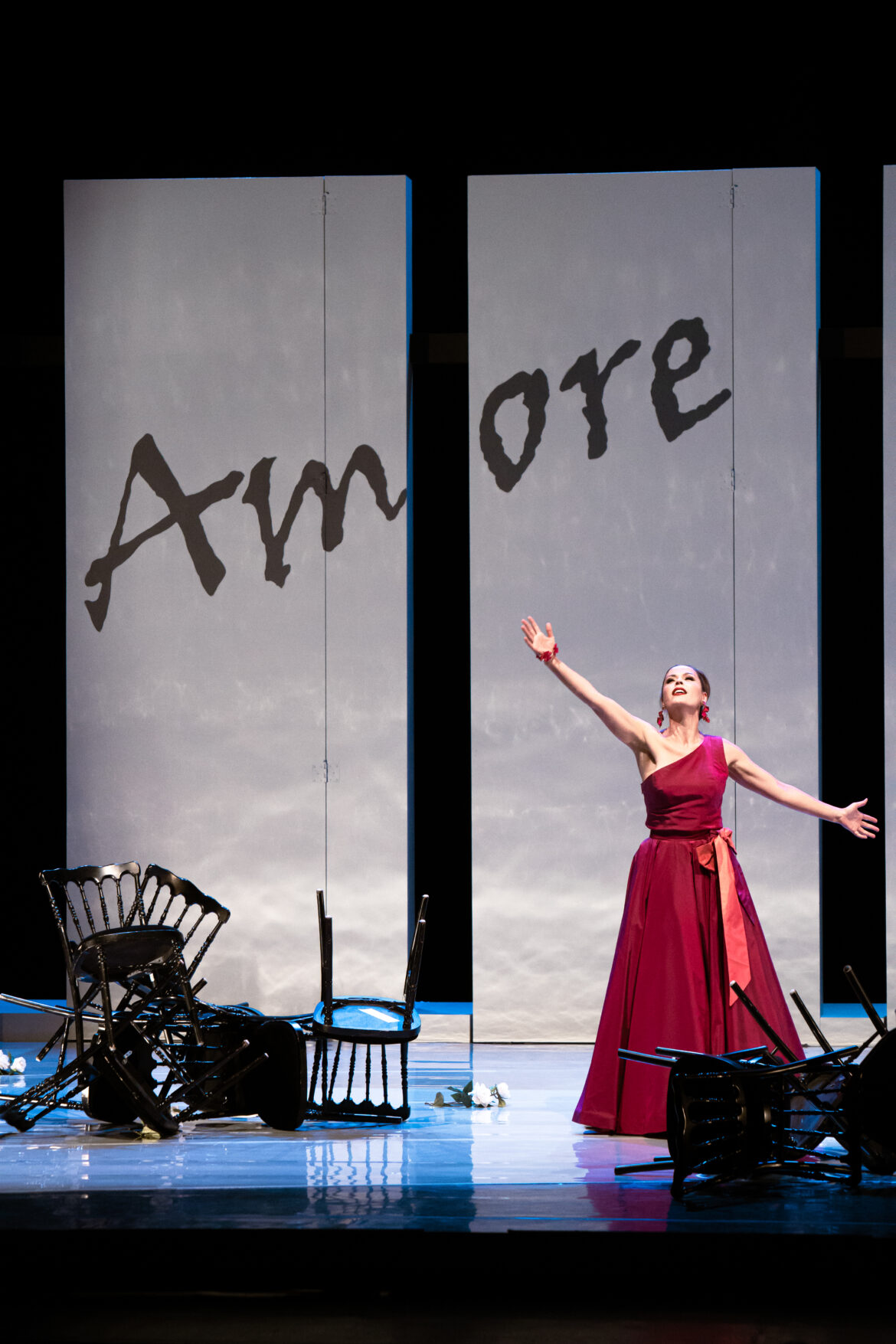 Confier la mise en scène à Pierre Thirion-Vallet est la première des bonnes idées de cette production. A contrario des transpositions hasardeuses et des modernisations inutilement provocantes, cet artiste polymorphe aux mille carrières aborde Traviata avec modestie et la ramène à l’essence même du drame verdien en insistant sur les pulsions contradictoires et complémentaires d’éros et thanatos. Ce clin d’œil au premier titre auquel Giuseppe Verdi pensa pour Traviata – Amore e morte – est la pierre de touche sur laquelle Pierre Thirion-Vallet construit toute sa dramaturgie au point de l’inscrire en lettres majuscules sur les panneaux mobiles qui constituent le décor unique de ce spectacle humble et élégant.