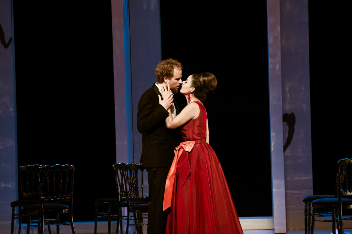 Sur le plateau, aucun chanteur n’éclipse les autres comme cela peut arriver quelquefois lorsqu’un théâtre essaye de construire une distribution cohérente autour d’une immense star internationale. Dans le rôle de Violetta Valery qu’elle a déjà abordé il y a dix ans au Teatro della Concordia de Turin, Erminie Blondel peut faire valoir un timbre de soprano clair et agile dans les vocalises, qualités indispensables pour se jouer des chausse-trappes de la grande scène du premier acte « E strano… Ah, fors’è lui… Follie ! Follie !… Sempre libera ». Si quelques coloratures paraissent un peu raides en début de représentation, la voix gagne en assurance dès le début du deuxième acte et compose une dévoyée fragile et touchante. Erminie Blondel ne se contente effectivement pas de chanter Traviata : elle s’y engage toute entière et se consume dans un rôle qu’elle a à cœur de défendre avec la sincérité de ses talents de tragédienne. Au dernier acte, l’émotion du chant de la jeune soprano franco-américaine est même si juste qu’on n’arrive plus à dissocier la chanteuse de l’interprète dramatique. Il est souvent possible de juger la qualité d’une Traviata à l’engagement et à la sincérité qu’elle investit dans la lecture du courrier « Teneste la promessa » ; sur la base de ce critère, Erminie Blondel est indubitablement une Traviata qui compte et qu’il faut suivre.