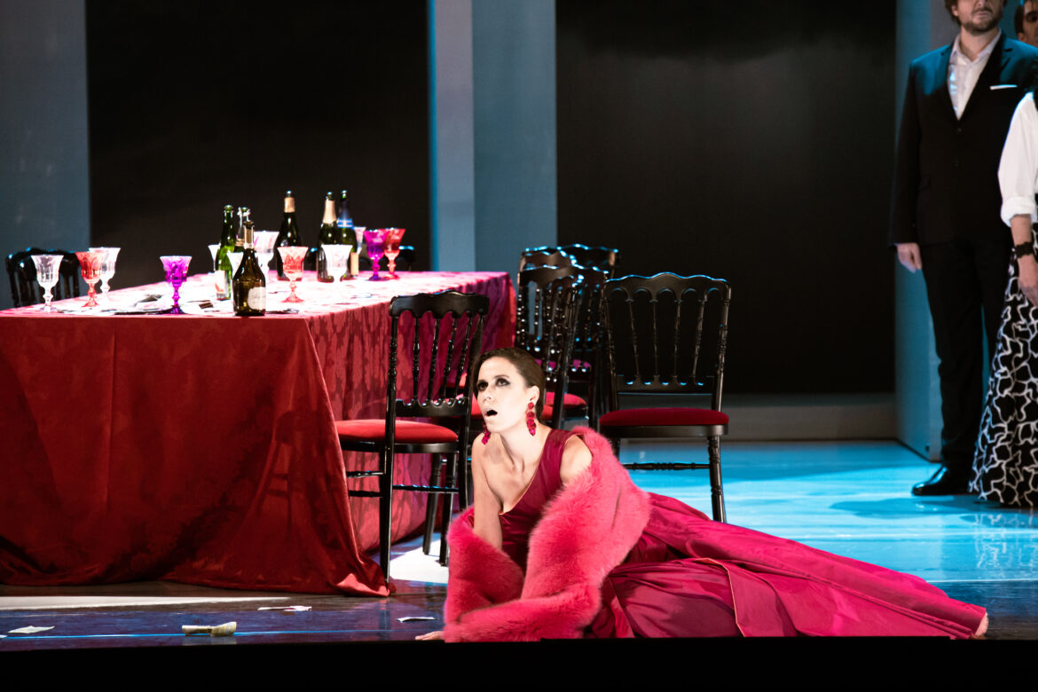 La dernière fulgurance de la mise en scène de Pierre Thirion-Vallet est d’avoir imaginé un double muet interprété par Constance San Marco qui accompagne Violetta d’un bout à l’autre de son destin. Comme l’amour et la mort sont indissolublement liés, Violetta-la-courtisane (en robe rouge sang) et Violetta-la-phtisique (en pyjamas rayés) ne sont jamais loin l’une de l’autre. Le spectacle commence par la lente déambulation du spectre de la mort dans le salon de Violetta encore désert où les deux femmes se retrouvent un instant face à face et se conclut par la même image inversée : lorsqu’elle trouve la force de quitter son grabat, Violetta cherche à retenir l’image de sa beauté évanouie mais s’effondre au pied de son double vêtu d’écarlate. L’image saisit aux tripes et hante longtemps la mémoire du spectateur.