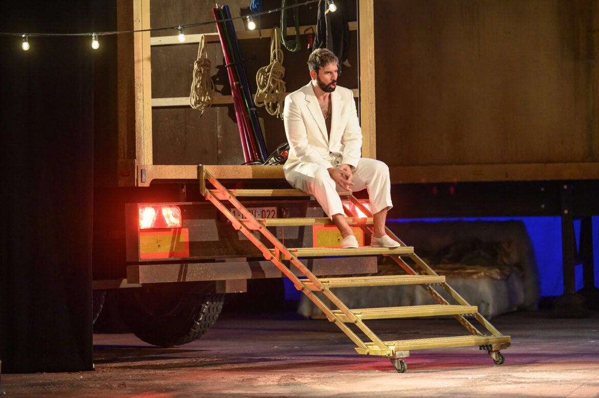 Annulée en 2021 pour cause de pandémie, cette nouvelle production du Turco in Italia marque aussi l’entrée de l’œuvre au répertoire de l’Opéra Royal de Wallonie. La mise en scène de Fabrice Murgia fait le choix du cinéma et, disons-le d’emblée, c’est une option cohérente et qui fonctionne plutôt bien. C’est ainsi que Prosdocimo de poète se transforme en réalisateur et qu’il est présent dès avant le lever du rideau en guise de technicien, dans une caravane où, par ailleurs, est assis également un véritable opérateur à la console. La première scène, fort réussie, plonge le spectateur dans une atmosphère féerique à la Songe d’une nuit d’été. Bariolés, les costumes sont aussi très chatoyants. Avouons que, dans la plupart des cas, nous ne sommes pas très amateurs des projections en direct de moments isolés de l’action ; en général, cela ne fait que distraire le spectateur et le décalage persistant entre le chant et l’image donne le plus souvent une impression regrettable de play back. Cela dit, le parti pris cinématographique de cette production en justifie partiellement l’usage et il faut reconnaître que le metteur en scène y a recours modérément et de manière très peu envahissante. Le public peut alors découvrir l’identité des chanteurs de cette représentation, leurs photos à la pose de stars hollywoodiennes permettant de les faire défiler comme dans un générique. L’arrivée de Selim, escorté de marins, est un clin d’œil à Et vogue le navire (E la nave va) de Fellini. On décharge un grand lit, recouvert de fourrures et de draps en soie ; nous sommes prévenus : c’est pour séduire Fiorilla que débarque cette vedette faisant la une des magazines people. L’intérieur de la demeure de l’héroïne, pour le café, devient en réalité une sorte de taverne turque où tout est à carreaux (les nappes, bien sûr, mais aussi les assises des chaises, les rideaux, le tissu aux murs et les portes-fenêtres) et où trône même un beau gyros.