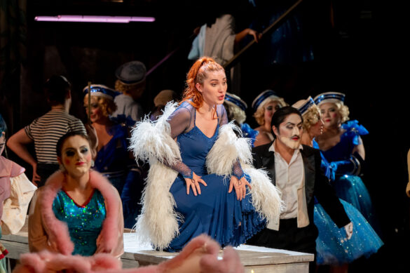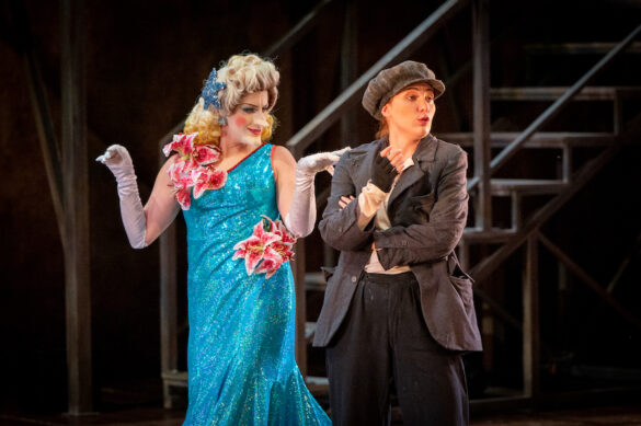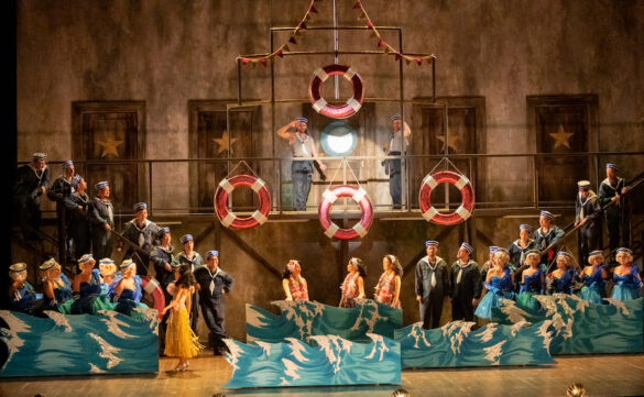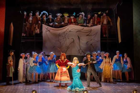 Comment, alors, mettre en scène ce désordre dramaturgique deux cents ans plus tard ? La voie choisie par le metteur en scène, scénographe et costumier Gianluca Falaschi et son équipe – Andrea Pizzalis pour les mouvements chorégraphiques, Emanule Agliati pour les lumières et Mattia Palma pour la dramaturgie – est de traiter le titre de Donizetti comme s’il s’agissait d’une œuvre de Gilbert & Sullivan, un autre Pirates of Penzance, en adoptant le kitsch visuel des anciennes productions de la compagnie d’opéra D’Oyly Carte, avec ses décors en papier mâché coloré, ses costumes criards et ses choristes et figurants qui volent la vedette aux premiers rôles, ou encore comme le théâtre de variétés italien des années 1940.
