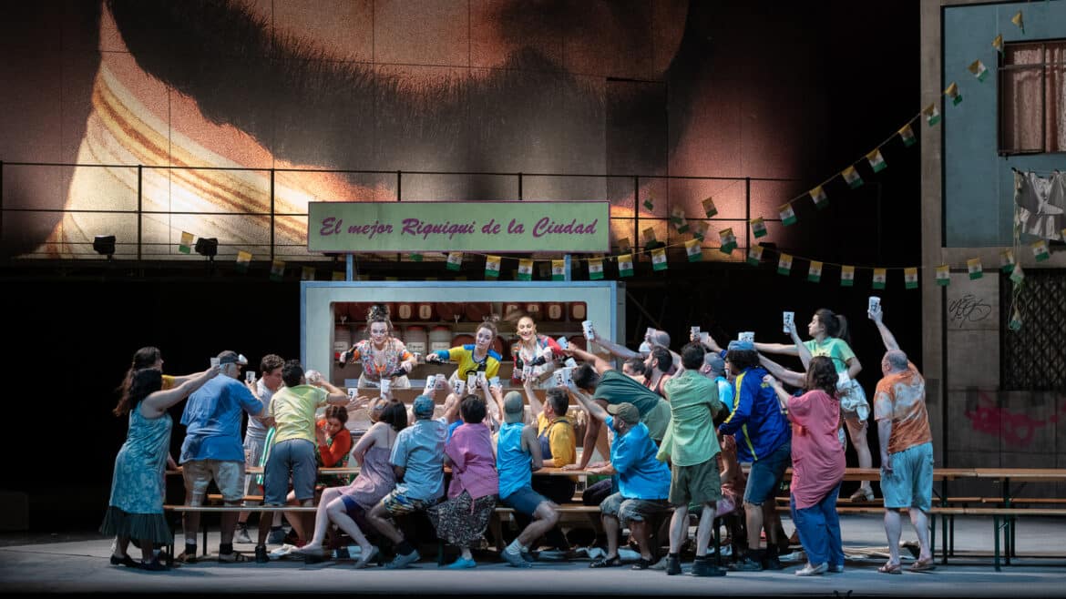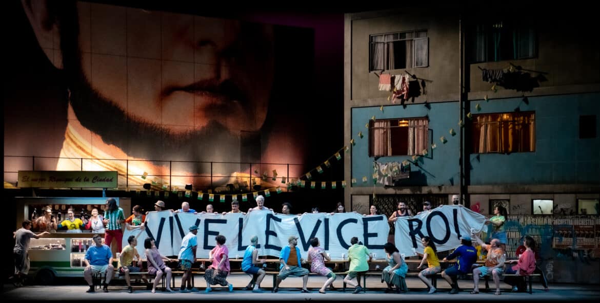 Les derniers tableaux du spectacle reviennent à un classicisme de bon aloi et à des symboles très (trop ?) appuyés. Le cachot des maris récalcitrants est une grande cage de fer, peut-être située sous le palais de Don Andrès. Les murs sont recouverts d’un grand portrait tronqué du dictateur dont on ne voit que les yeux cachés sous d’épaisses lunettes fumées… Big brother is watching you. Et lorsque la représentation s’achève sur une continence inattendue, le bon peuple de Lima danse sous le même portrait qui dominait déjà la favela du premier acte mais à présent tagué et souillé de jets de fruits pourris. L’amour a eu raison de l’inflexible dictateur et la démocratie est désormais en marche au Pérou.
