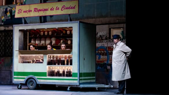 Quelques jolies idées et une attention particulière apportée à la réalisation des décors conçus par Chantal Thomas et éclairés par Michel Le Borgne viennent malgré tout susciter l’adhésion pleine et entière du spectateur. À l’enseigne du « Meilleur riquiqui de la ville », le cabaret des trois cousines est un food-truck brinquebalant autour duquel le peuple de Lima vient noyer dans l’alcool le spleen d’être gouverné par un tyran. Tee-shirts aux couleurs délavées et bermudas oversize composent un vestiaire qui dit tout de la misère dans laquelle sont tenus les Péruviens par le régime du vice-roi Don Andrès. Enveloppé d’un imperméable mastic, ce dernier déambule incognito parmi les bidonvilles de sa capitale et la garçonnière où il aime « prendre la taille aux dames » occupe le premier étage d’un vieux HLM à la façade lépreuse dont les fenêtres laissent deviner de minuscules appartements crasseux éclairés d’une lumière blafarde.
