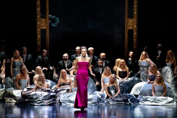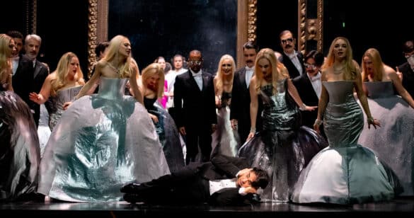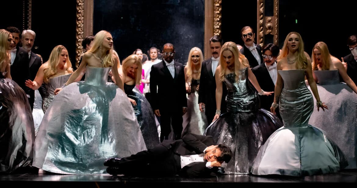 Par contraste avec les images d’extrême précarité du premier acte, la deuxième partie du spectacle nous transporte au palais de Don Andrès que la décoratrice a meublé de hautes glaces baroques au tain piqué et de banquettes profondes en velours noir. Prison dorée où le vice-roi cherche à garder captive la Périchole qu’il a arrachée à son sort de chanteuse des rues, ce décor étouffant est là encore une jolie trouvaille et une métaphore subtile du joug de la dictature sur des populations constamment placées sous surveillance. Les silhouettes qui se reflètent dans les miroirs embrumés ont l’air de fantômes et la cérémonie de la présentation de la nouvelle favorite prend dans ce salon macabre des airs de fête triste. Élégantes dans leurs crinolines lamées d’argent, toutes d’une blondeur peroxydée, les courtisanes étonnent par le chaloupé de leur démarche, leurs rires hystériques et leur diction d’influenceuse instagrameuse hors de propos. Pour suggérer la superficialité de ces femmes, Laurent Pelly aurait pu se montrer plus subtile. Brillante en revanche est l’idée du fourreau fushia qui habille Périchole à partir du deuxième acte. Par sa couleur intense et la modernité de sa coupe comparée à celles des robes des autres courtisanes, ce costume illustre parfaitement le caractère sanguin de la saltimbanque, son refus des convenances et sa ferme intention de ne se fondre dans aucun moule.