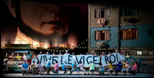 Alors qu’il y a vingt ans l’inénarrable coopération de Felicity Lott avaient offert au metteur en scène l’opportunité de creuser la question du désir féminin et de renouveler totalement notre perception de ces deux piliers du répertoire offenbachien, Laurent Pelly aborde aujourd’hui La Périchole sous l’angle rebattu de la dénonciation de la dictature. Lorsque le rideau s’ouvre sur un paysage urbain de favela sud-américaine dominé par un immense portrait du vice-roi, le spectateur est immédiatement saisi d’une impression de déjà-vu. De Hergé croquant les banlieues de Tapiocapolis dans Tintin et les Picaros à Jérôme Savary qui proposait déjà une transposition de La Périchole dans les bas-fonds d’une république bananière au théâtre de Chaillot en 1999, le topos de la dictature sud-américaine a fait son temps et semble à présent usé jusqu’à la corde.
