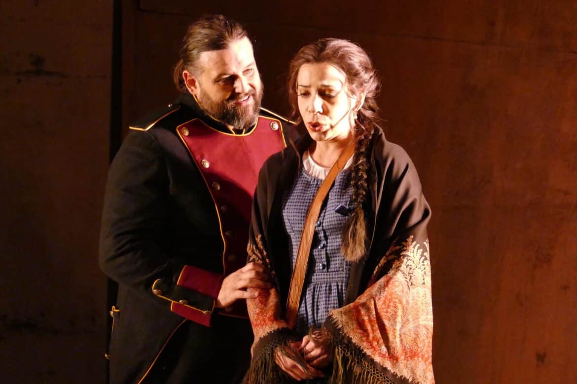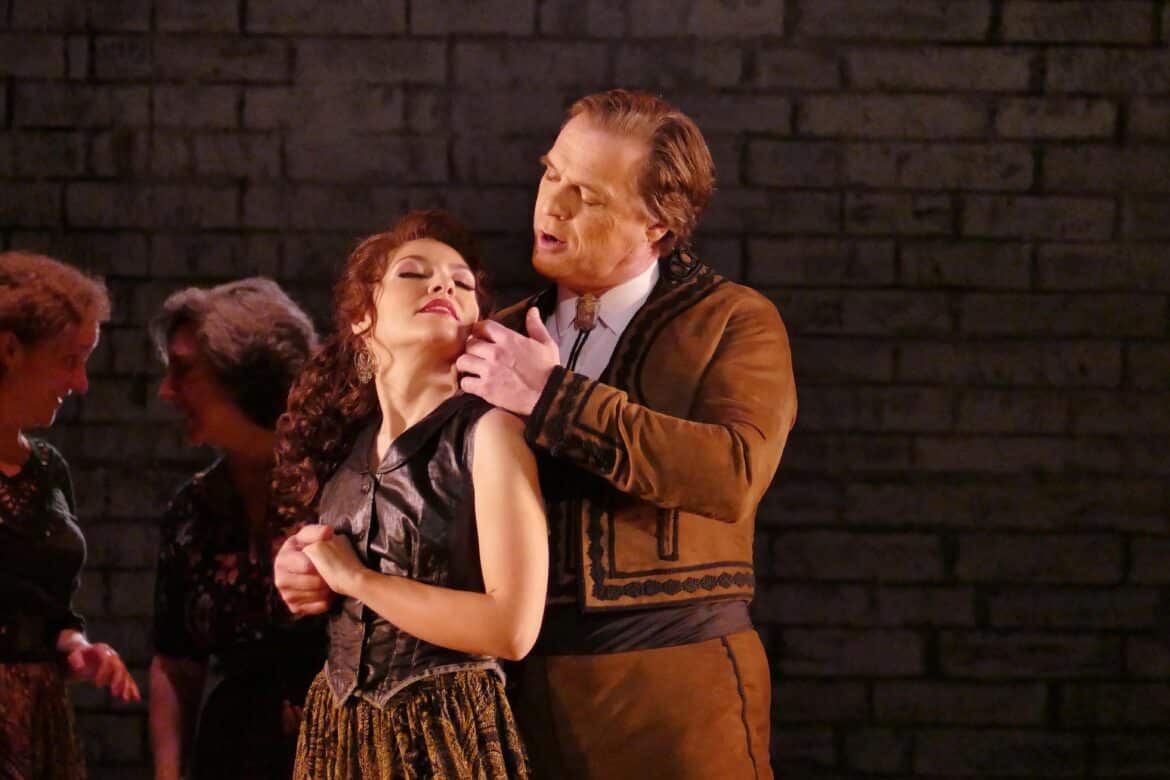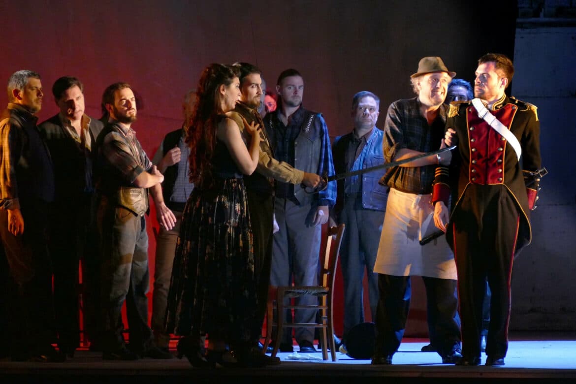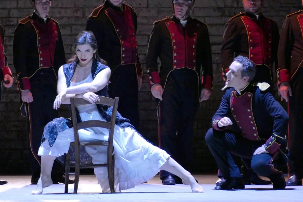 Sur le plateau, le même miracle se produit qui permet d’assister à une Carmen d’anthologie. La réussite en revient tout d’abord à Héloïse Mas que le public marseillais retrouve trois ans après l’avoir déjà applaudie dans le rôle de Boulotte dans Barbe-bleue en 2020. De Carmen, la jeune soprano française possède le déhanché chaloupé, l’œil aguicheur, la diction canaille et surtout la maitrise parfaitement idiomatique du texte. Combien de chanteuses aujourd’hui prononcent correctement « séguedille » et non « séguédille », à l’espagnol ? Héloïse Mas a précisément ce souci rigoureux de la langue et elle délivre les vers de Meilhac et Halévy avec un talent de comédienne qui fait de sa cigarière une des interprétations les mieux incarnée qu’on ait vues depuis longtemps. Mais elle est d’abord une épatante chanteuse : son timbre pulpeux de mezzo convient idéalement au personnage provocateur de Carmen qu’elle chante avec une sobriété de moyens qui repose l’oreille et lui fait saisir la moindre nuance du texte et de la mélodie. D’abord prudente dans la habanera qui marque l’entrée en scène de son personnage, Héloïse Mas prend de l’assurance dès la séguedille, assume crânement le duo du deuxième acte face à José et interprète en tragédienne l’air des cartes qu’elle ponctue de graves sonores qui glacent le sang. Le dernier duo « C’est toi ? C’est moi ! » est finalement chanté de manière incandescente, les deux protagonistes s’abandonnant ensemble avec la même ivresse au flot mélodique composé par Bizet pour conclure dramatiquement son opéra. Au rideau final, les larmes qu’Héloïse Mas ne peut retenir sont à la fois larmes de joie et de fatigue et démontrent l’engagement émotionnel que l’artiste a mis dans la préparation de ce personnage qui semble déjà lui tenir très à cœur.
