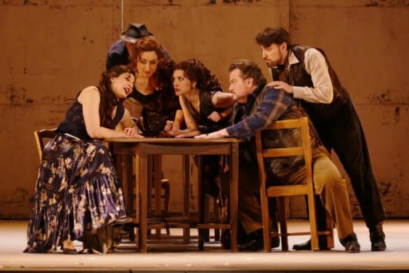 Les minutes fiévreuses qui précédent une représentation d’opéra sont propices aux conversations badines comme aux déclarations péremptoires et il suffit parfois de tendre l’oreille pour surprendre involontairement une confidence émouvante. Ce jeudi de février, un spectateur à l’accent méridional confessait à sa voisine que la première production de Carmen à laquelle il avait assisté à Marseille en 1962 était celle dont Bernard Buffet avait signé les décors et les costumes ! Se trouvait-il aujourd’hui dans la salle un enfant qui découvrait sa première Carmen ? Sans doute. Il est en revanche probable que le spectacle de cette saison 2022-2023 n’ait pas durablement imprimé sa rétine et qu’il soit incapable, dans six décennies, de s’en remémorer les noms du décorateur, ni même du metteur en scène.