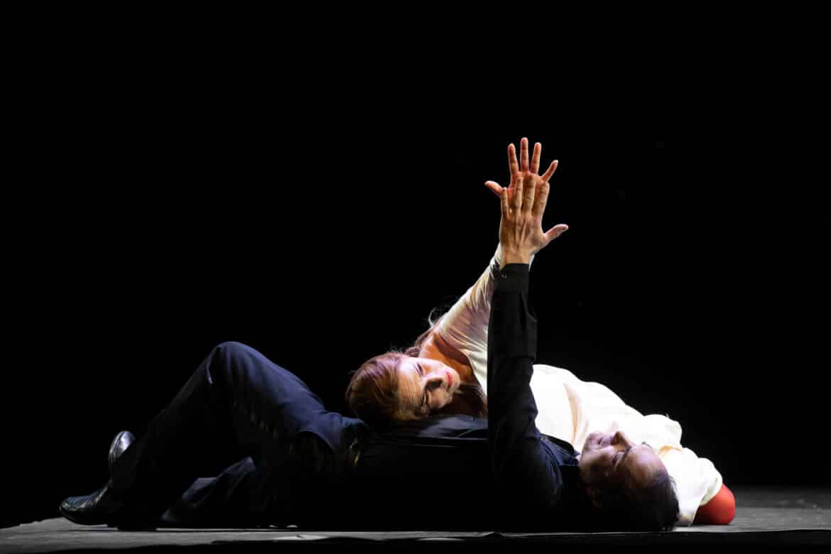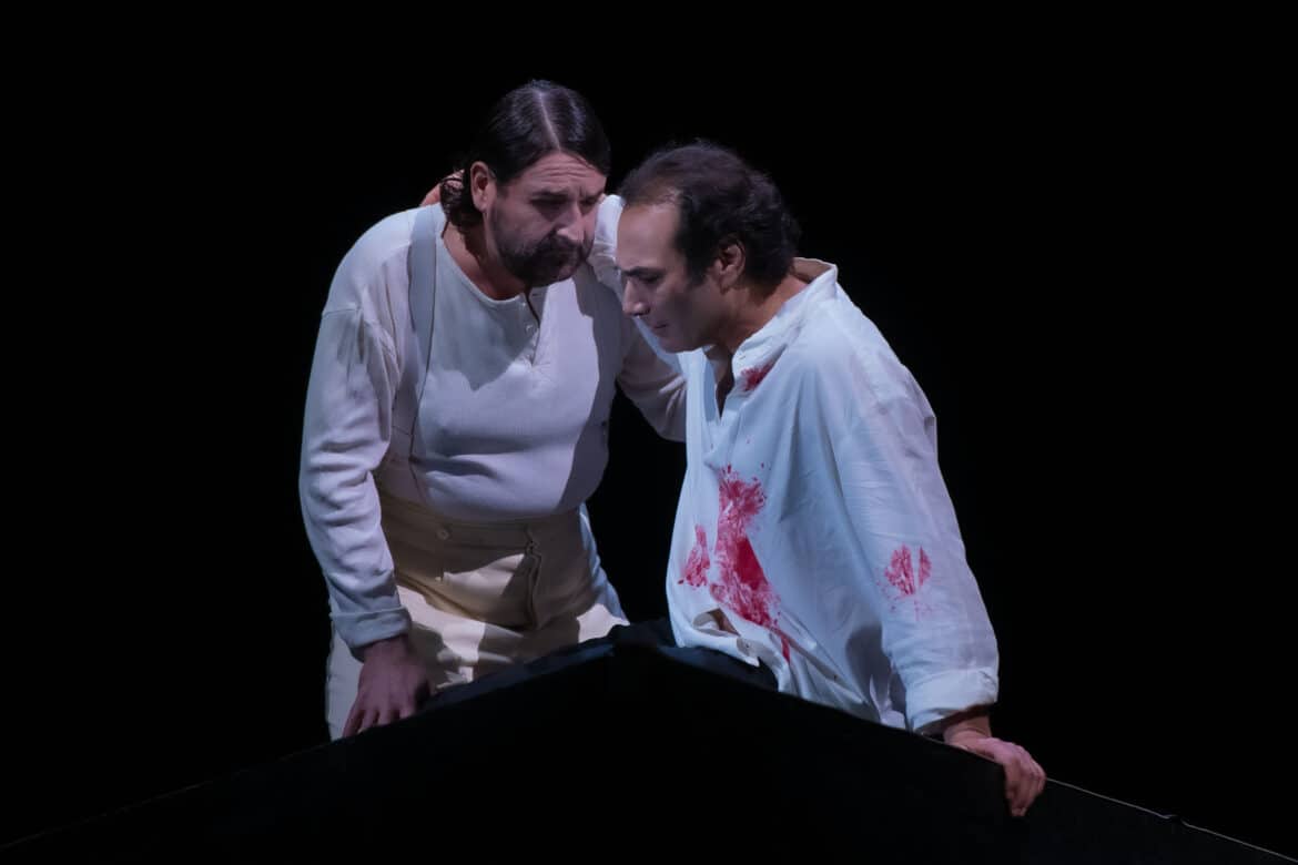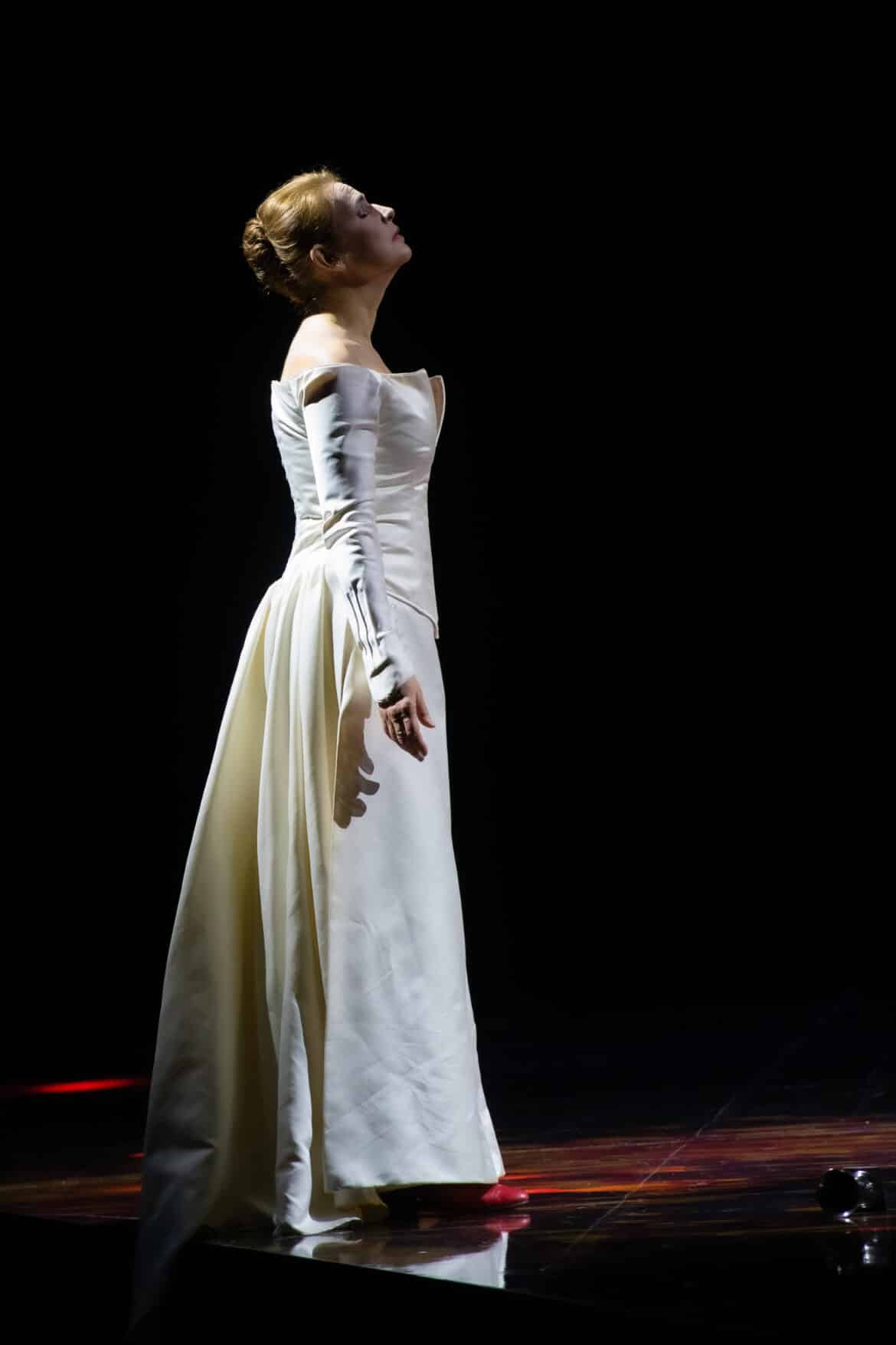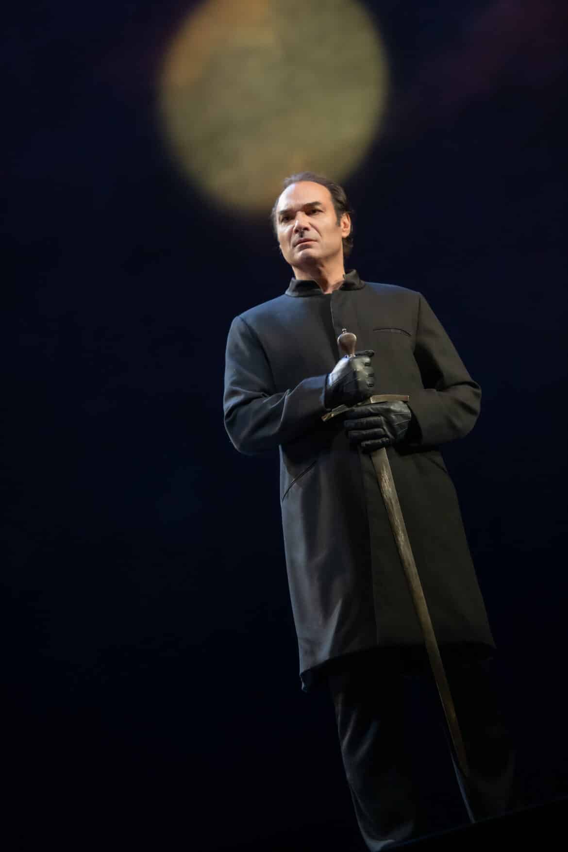 Reprise par Emilie Delbée, la mise en scène de feu Nicolas Joel (2007, Capitole) s’attache à suggérer l’intemporalité et l’infinitude du mythe tristanien. Sans opter pour l’abstraction Wielandienne (Bayreuth), à mille lieux de l’illustration vidéaste du récent Tristan und Isolde à l’Opéra Bastille, la scénographie (Andreas Reinhardt) mise sur un austère symbolisme qui revisite le récit de la lyrique germanique (Minnesang). Sur le plateau nu, où la lumière et les astres nocturnes sont subtilement tamisés – lune en ascension au 1er acte, étoiles lors de la nuit d’amour, astéroïde suspendu sur Tristan mourant – les éléments sont suggérés, tel l’océan par des pans triangulaires qui oscillent au rythme de la traversée (1er acte). Loin des gestuelles de réalité (les coupes de philtre, l’épée et la torche électrique sont les seuls accessoires), les personnages interagissent sur un large échiquier, de manière métaphorique pour les duellistes, frontalement au public … et à la baguette du chef ! Intimement traversés par le désir individuel (pantomime du philtre d’amour) et sa pulsion tyrannique, les amants accèdent au statut de figures mythiques au fil des épreuves. Les seuls attouchements se limitent à l’irrépressible extase amoureuse (2e acte) et à la solidarité indéfectible du héros blessé et de son écuyer Kurwenal (3e acte). Cet acte cathartique, de résolution dans l’au-delà de la mort, s’avère le plus bouleversant, porté par une animation qui succède au statisme précédant : le pan triangulaire surélevé où Tristan agonise deviendra la proue d’où Isolde célèbre la transfiguration, flamme rouge découpée sur le fond lumineux. Dans ces sobres dispositifs menant du crépuscule vers la lumière, les protagonistes sont avant tout incarnés par leur chant, mais aussi reliés par un code de couleurs de costume : blanc pour le couple royal (Isolde, Marke) et le fidèle Kurwenal, noir pour le vassal Tristan, bleu pour les acteurs du drame (la suivante Brangäne et Melot le félon) tandis que le rouge est réservé à l’Amour (les chausses rouges d’Isolde sous sa blanche tunique révèlent son ardeur et préfigurent la robe du Liebestod).