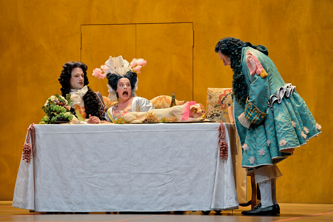 L’équilibre se trouve également dans la mise en scène, qui allie l’émotion créée par un Monsieur Jourdain rêveur, grand enfant plus touchant que ridicule dans son désir naïf d’élever sa condition, et le comique omniprésent – comique du texte bien évidemment, mais aussi du jeu des acteurs. Nous retrouvons bien ici la griffe du créateur des Deschiens ; entre autres gags irrésistibles, la servante Nicole (Pauline Tricot), véritable fée du logis et maniaque de la propreté, dont la fierté est de piéger des rats, passe son balai frénétiquement, jusqu’entre les jambes des chanteurs, et exprime sa fureur avec la vapeur d’un fer à repasser ; une bergère fait… la vaisselle, avec des gants de couleur vive ; le dîner avec Doriante et Dorimène est quant à lui complètement déjanté, Monsieur Jourdain devant assommer le porcelet, qu’il découpe et dont il exhume chapelets de saucisses, jambon sous plastique et ketchup ! Le décor unique (signé Félix Deschamps) ne nuit pas à la vivacité de l’œuvre, un jeu d’acteurs alerte (entrées et sorties des personnages par de nombreuses portes) assurant la fluidité de l’ensemble. Dans ce salon-salle à manger, le théâtre est à l’honneur, avec, mis en abyme, le petit théâtre dont nous avons parlé plus haut, mais aussi la chambre de Monsieur Jourdain qui s’avance, telle une loge d’avant-scène, au son du Te Deum de Charpentier. Mention spéciale aux splendides costumes de Vanessa Sannino et perruques de Cécile Kretschmar, ainsi qu’aux lumières de François Menou, particulièrement dans la cérémonie de Mamamouchi.