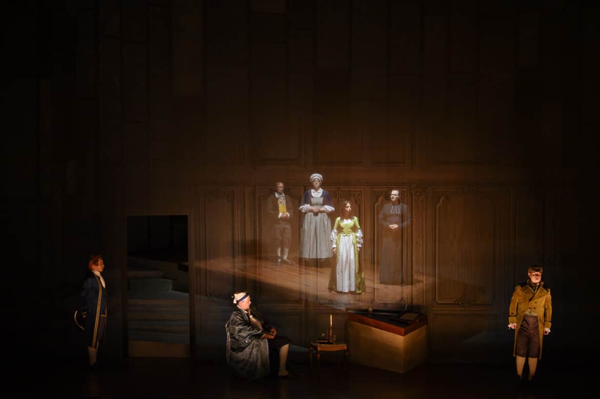 La metteuse en scène fait effectivement de Blanche un personnage fracassé par la petite et la grande Histoire : orpheline de mère, délaissée par un père qui ne s’est jamais tout à fait remis de la mort de son épouse et qui vit désormais en satrape oriental, la tête coiffée d’un vieux madras et enveloppé dans les plis d’une lourde robe d’intérieure (avant même le début de la représentation, les spectateurs qui entrent dans la salle surprennent le marquis de La Force en train de faire sa méridienne dans un fauteuil au bord du plateau, comme une métaphore de l’indifférence du vieillard pour le reste du monde), la jeune fille semble n’avoir grandi que dans l’affection exclusive de son frère aîné. Quand cette affection est-elle devenue contre-nature ? Marie Lambert ne nous le dévoile pas mais on comprend au lever de rideau que Blanche est parvenue à ce point de rupture où il lui est devenu vital d’échapper à la relation mortifère qu’elle a consenti à partager avec son frère. Pour l’y aider, elle apparait pour la première fois au début du spectacle en compagnie de l’aumônier du carmel qui demeure en retrait et fait antichambre mais c’est assez pour comprendre que Blanche ne fait pas seule le choix du retrait hors du monde : elle y est fortement incitée (contrainte ?) par ce prêtre dont l’emprise a désormais remplacé celle du chevalier de La Force.