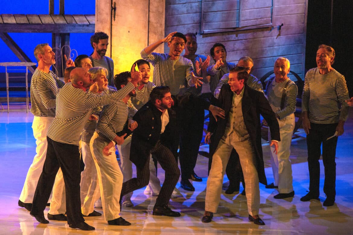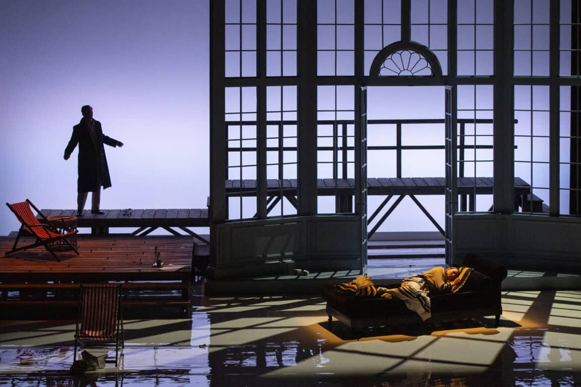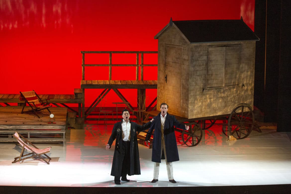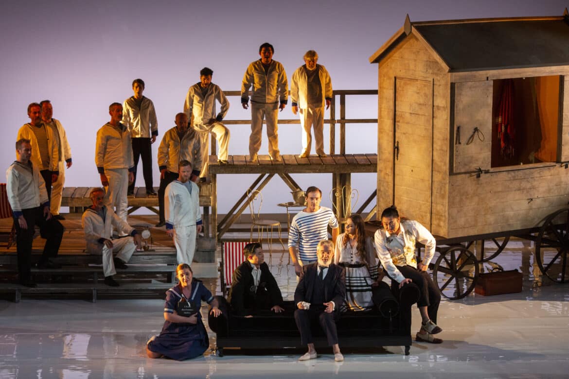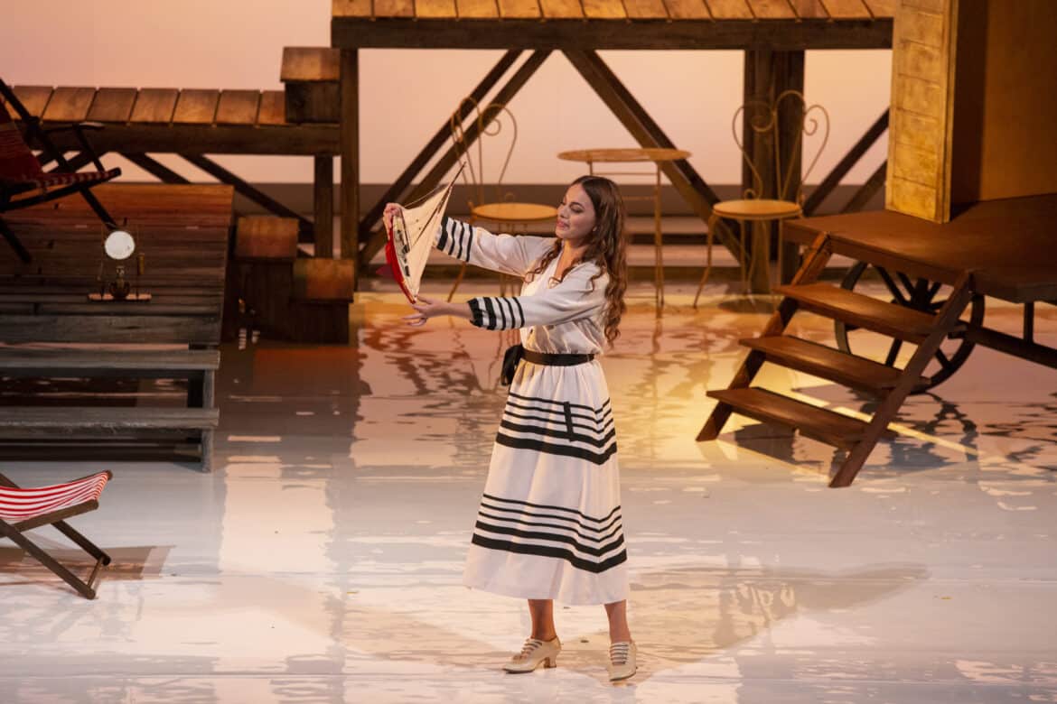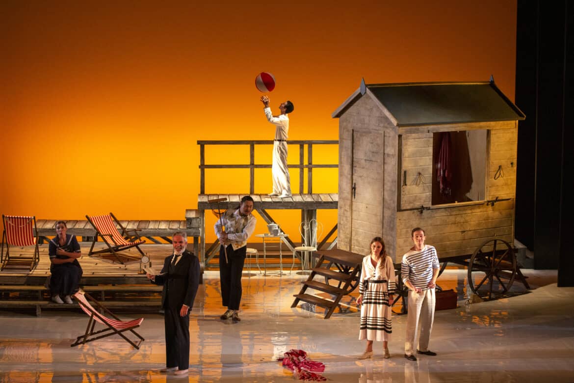 Ce Barbier de Séville commence donc là où s’achève la Mort à Venise de Luchino Visconti : sur la plage d’un grand hôtel du Lido, au bord des rivages de l’Adriatique. Durant l’ouverture jouée à rideau ouvert, on assiste sur scène à la déambulation de vacanciers vêtus de marinières à la mode des années 1910. Ayant troqué sa carrière de barbier pour un emploi de concierge dont il porte la livrée, Figaro accueille le docteur Bartolo, Rosina et Berta pour une villégiature saisonnière dans un palace à grand renforts de courbettes et de sourires forcés. Du ponton, un jeune homme élégant, vêtu d’un costume clair et coiffé négligemment d’un panama, assiste à la scène et tombe immédiatement sous le charme de cette jolie brune qui semble si mal assortie à son fiancé ; il s’agit évidemment d’Almaviva qui croque une partie de sa fortune en menant l’existence oisive d’un vacancier au long cours… Ayant remarqué ce manège, Bartolo confine Rosina dans une cabine de plage et lui interdit de s’aventurer seule sur la grève.
