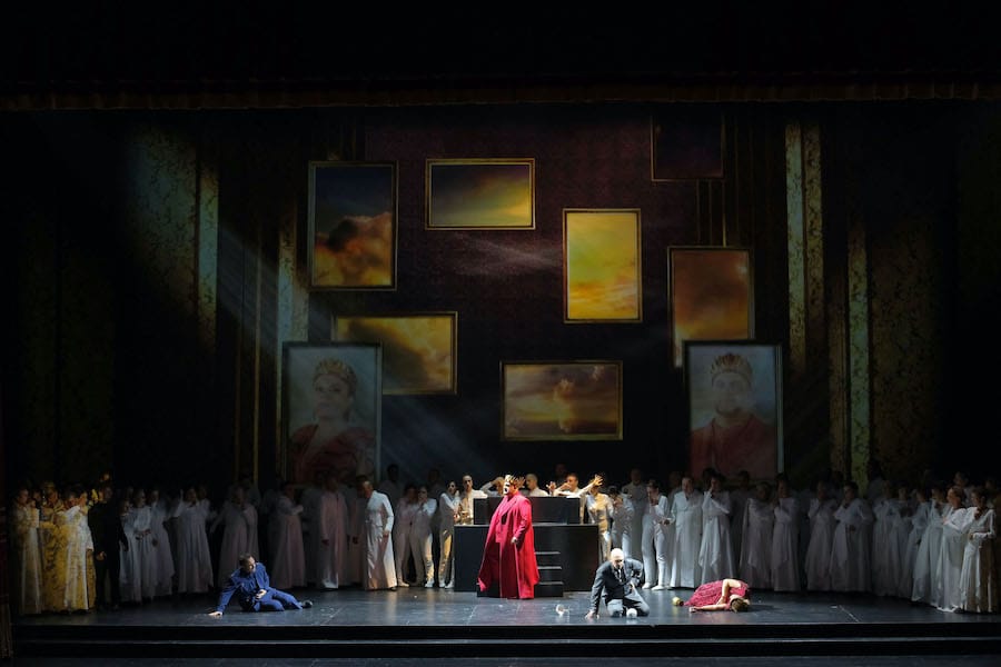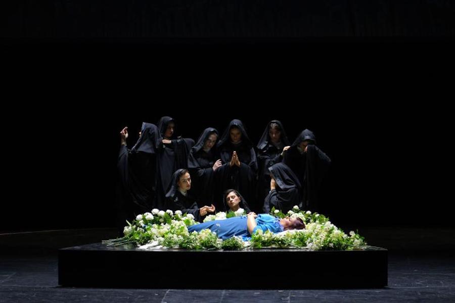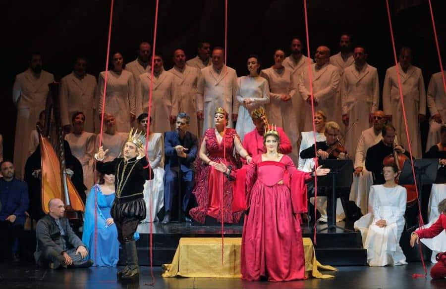Amleto est un opéra ambitieux, quelque peu chimérique – mais plein d’une énergie juvénile qui puise dans des inspirations très diverses – Verdi, Wagner, la grandiloquence du grand-opéra, mais aussi le lyrisme de Gounod – avec des résultats inédits et, à leur manière, personnels. Ceux qui ont souhaité remonter cet opéra ont dû faire face à un premier problème : le quatrième acte de la version de la Scala est absent des archives de Ricordi. La version proposée ici est fallacieuse : les trois premiers actes datent de 1871 et le quatrième de 1865. Le second problème était de trouver l’interprète titulaire idoine, mais le choix du ténor Angelo Villari pour la première et la dernière représentation (il alterne avec Samuele Simoncini dans les deux autres représentations) justifie cette reprise tant attendue grâce aux qualités vocales de l’interprète. Son rôle anticipe ceux de la Giovane Scuola (en particulier Giordano) et le chanteur, dont le répertoire comprend Ponchielli, Mascagni, Cilea et Respighi, s’attaque avec aisance à une tessiture que l’on peut qualifier de sadiquement impossible ! Villari fait preuve d’une voix franche, d’un timbre sonnant et d’une grande projection, d’une projection du mot et d’un phrasé efficace, mais contrairement à l’Hamlet introverti et distant de Pavel Černoch dans l’édition de Bregenz, le sien est viril et décisif, voire trop ; la figure presque mussolinienne et le trouble du personnage de Shakespeare, son ironie cynique, sont ici absents. En revanche, l’Ophélie de Gilda Fiume est encore plus intense, frémissante et émouvante, et elle domine parfaitement la longue scène de la folie. Elle alterne également dans les représentations avec une autre soprano, Eleonora Bellocci.
