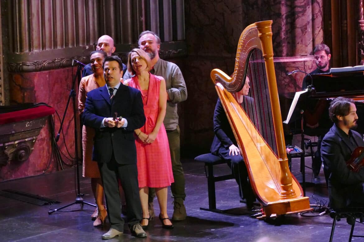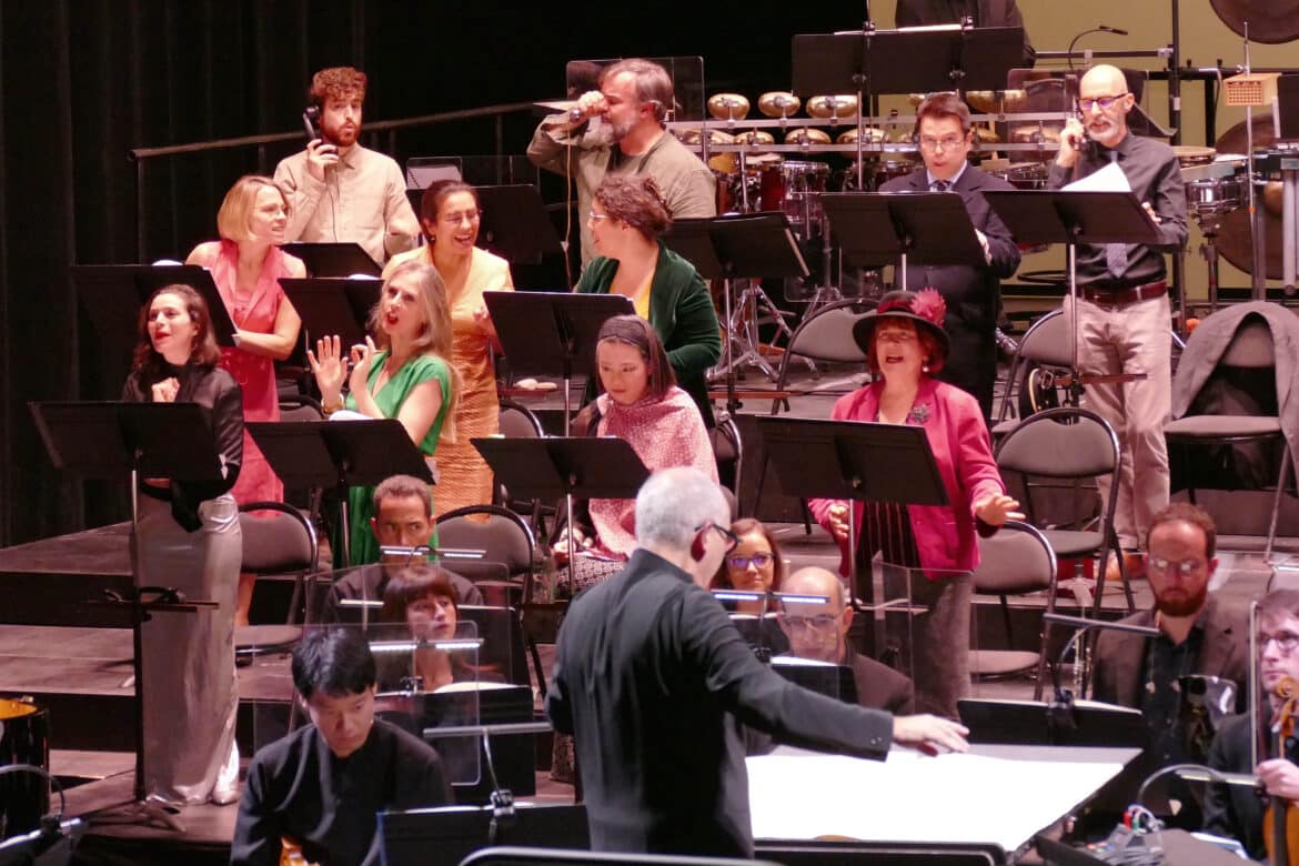 Les chœurs amateurs sont placés aux balcons de l’Opéra (ce qui pose le problème qu’on ne les voit pas du parterre et qu’on ne les entend que trop peu). De même que les ensembles, les solistes ne sont pas toujours « lyriques », souvent récitants, utilisant une vocalité variée parfois bruiteuse.
