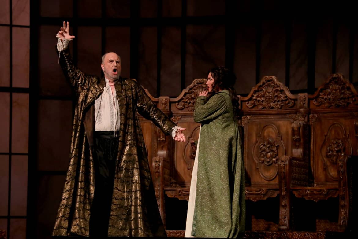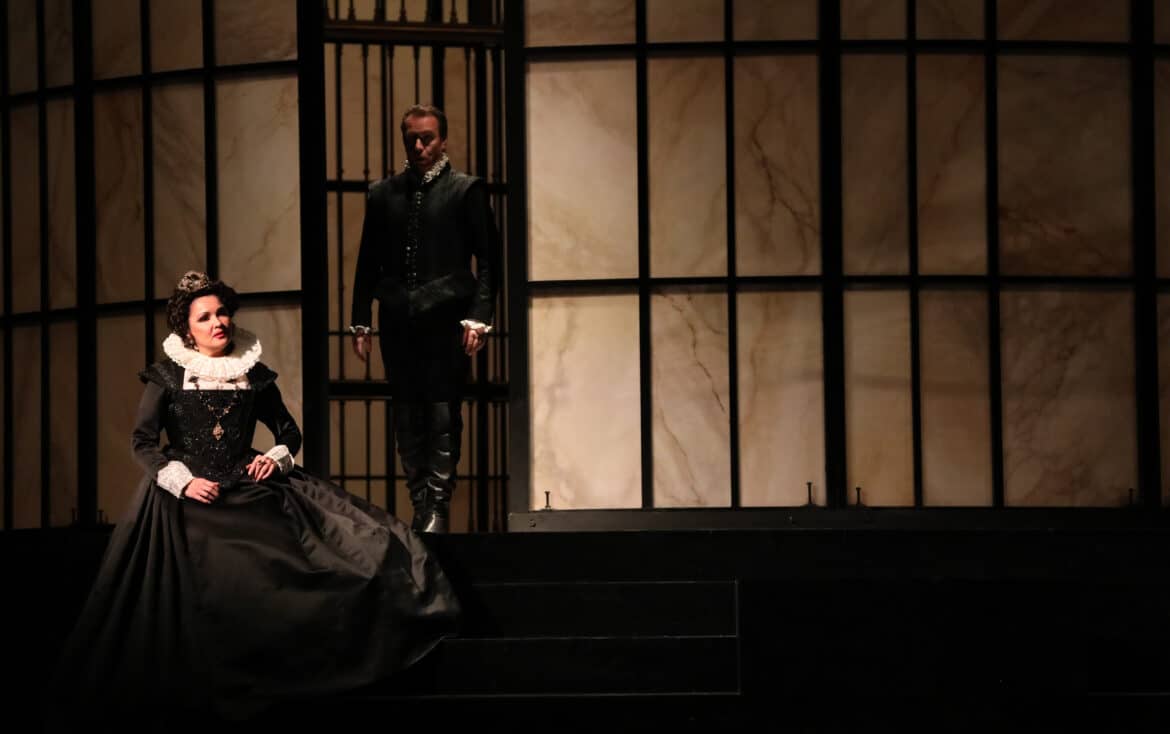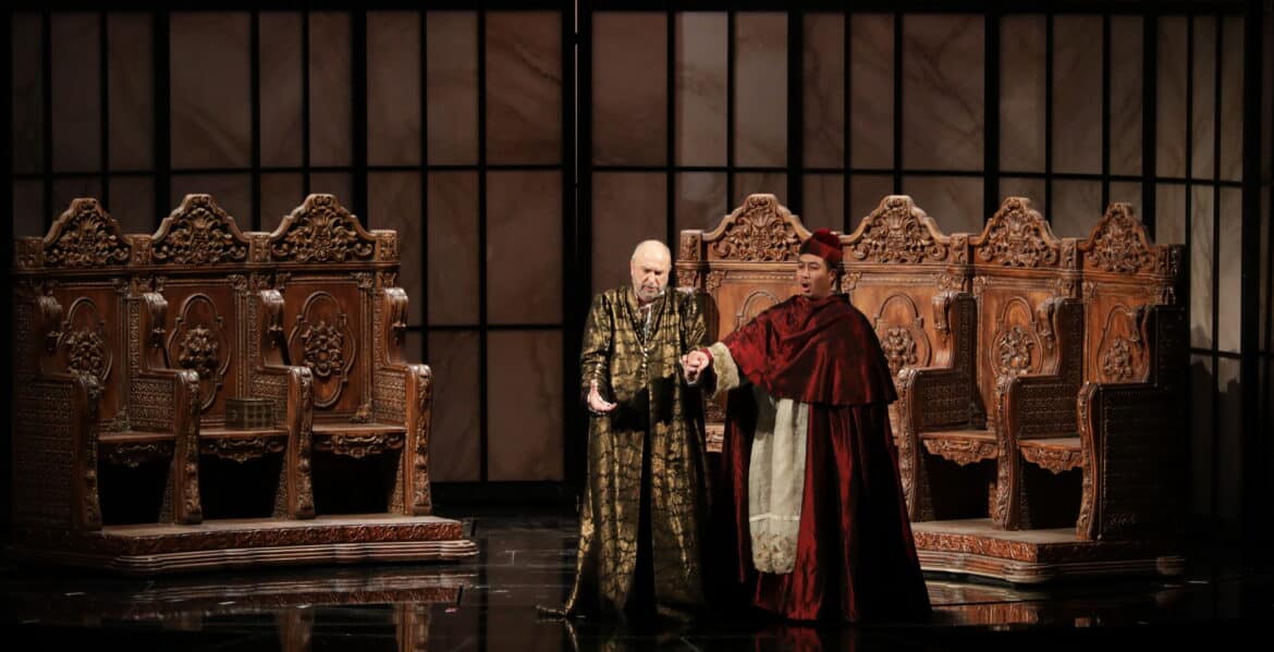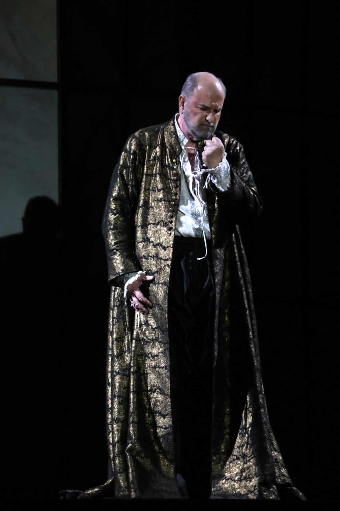 Initialement distribué uniquement en moine, Jongmin Park impressionne, dès la première scène, par son beau timbre grave. C’est dire si on l’attendait au tournant dans le Grande inquisitore qu’il a eu la bonté d’assurer pendant toutes les représentations, en remplacement d’Ain Anger, souffrant. Si le rôle le dépasse quelque peu pour le moment, il sait en mettre en relief l’autorité tyrannique devant un monarque à genoux, dans une scène d’une extrême densité, grâce aussi à la complicité qui s’instaure avec un Michele Pertusi des grands jours. Entièrement rétabli depuis le malaise qu’il avait dû faire annoncer le soir du 7 décembre, il fait preuve d’une totale maîtrise de son personnage dans le grand air de l’acte II. Seul à l’avant-scène, une remarquable gestuelle vient soutenir d’admirables effets dans le grave et une élocution sans faille, dont on retient la prononciation du « mi » dans la reprise d’« Ella giammai m’amò !… », péché véniel qui lui vaut une ovation, le recours à la synalèphe n’entachant en rien la prosodie italienne. D’ailleurs, à l’acte I, la noblesse de son incarnation fait ressentir un léger décalage stylistique avec le Rodrigo plutôt rustre de Luca Salsi. Il est vrai que nous sommes en présence d’un roi de droit divin et de son bras armé ; il s’agit néanmoins d’un Grand d’Espagne, marquis appelé à devenir duc à l’acte suivant. Malgré quelques effets par trop véristes, la mort de Posa est néanmoins touchante, menée de manière plus héroïque que sacrificielle. D’ailleurs, la question d’un certain écart dans le ressenti du personnage se pose également dès son premier duo avec le Don Carlo de Francesco Meli qui retrouve ce soir le héros qu’il avait déjà abordé sur ce plateau à l’hiver 2017. Quelque peu engorgé dans son air de présentation, il fait aussi état d’une intelligence du texte à toute épreuve et d’un superbe legato dans les transitions. Son timbre clair et sa diction contrôlée constituent un atout majeur dans les confrontations avec ses partenaires.