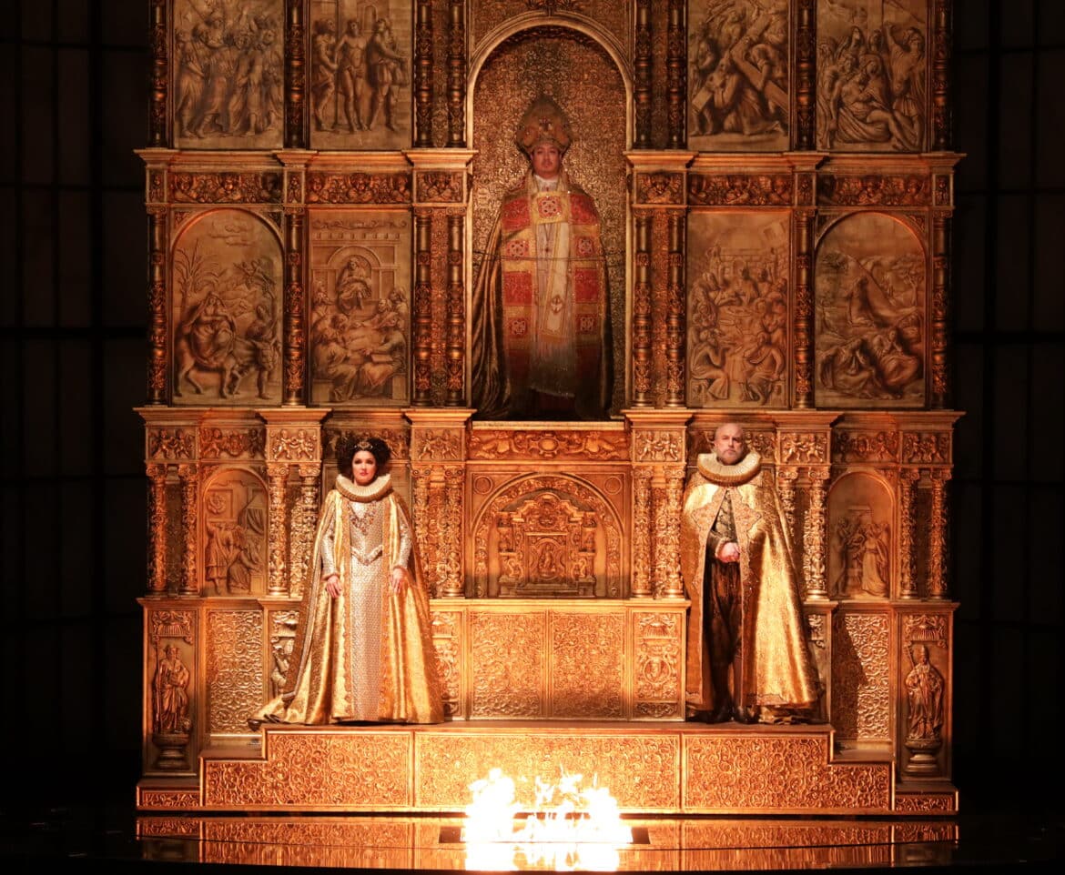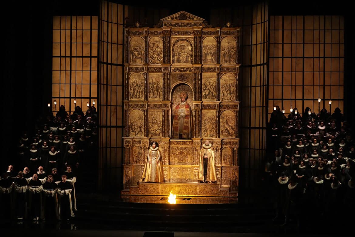 Dans le très bel ouvrage édité pour l’occasion par la maison, le réalisateur se charge de donner toutes les clés de lecture non seulement de son travail mais aussi de celui de ses collaborateurs, notamment des costumes de Franca Squarciapino et des décors de Daniel Bianco, dont la principale source d’inspiration aurait été « les tableaux de l’époque », mémoire de l’imaginaire collectif. C’est ainsi que le rideau se lève sur une grille en fer forgé devant symboliser le cloître du couvent de Saint-Just, sur le modèle de celles qui séparent l’autel et le chœur de la nef, surtout dans les églises d’Espagne. Dès le tableau du jardin, apparaît un cylindre tournant, « un espace fondamentalement abstrait », nous explique-t-on, « une tour/prison en albâtre », les grilles étant maintenant dorées. C’est sans doute le moment le plus pictural de cet univers, dans la mesure où une légère chorégraphie (Nuria Castejón) porte à la scène quatre danseuses et surtout autant de personnages de petite taille, des deux sexes, qui ne sont pas sans évoquer, malgré l’anachronisme, Les Ménines de Vélasquez. À l’acte II la verrière laisse apercevoir d’abord les sapins des jardins de la reine à Madrid, ensuite la lune, lors de la découverte de la trahison supposée, enfin le soleil, pointant à l’aube, en guise de métaphore de l’amitié renouvelée entre Carlo et Posa. La scène de l’autodafé se passe surtout dans les coulisses, un escalier où l’on voit s’affairer les préparatifs de la cérémonie, cependant que des suppliciés sont jetés dans une fosse. On ne voit donc que « pendant quelques minutes » la splendeur de la « démonstration de propagande », sous la forme d’une sorte d’autel doré géant au milieu duquel se montrent d’abord Filippo II triomphant, ensuite le Grand Inquisiteur, afin de rappeler le conflit entre les pouvoirs, temporel et spirituel. Un bûcher s’allume, d’ailleurs, à la fin, lorsque les lumières suggestives de Pascal Mérat viennent illustrer la voix descendant du ciel (Rosalinda Cid). La méditation du roi est à son tour confortée par une croix projetée sur le cylindre/tour. Pour la captivité du héros, la grille se mue en barreaux de prison. Tandis qu’au dernier acte l’on retrouve le décor du début, agrémenté d’une statue de Charles Quint en saint Pierre, devant suggérer son tombeau.