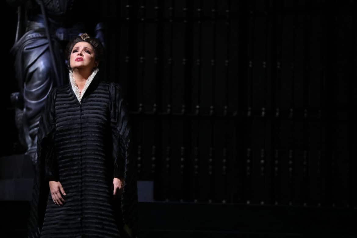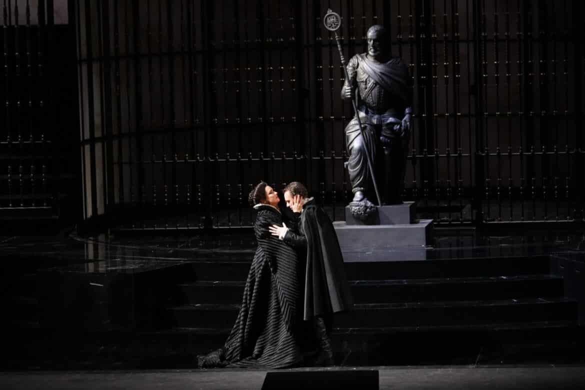 « Una canzon qui lieta risuonò » : dès ses premières répliques, l’Elisabetta d’Anna Netrebko se démarque par la beauté du timbre et par l’intensité du phrasé. Des caractéristiques qui ressortent aussitôt lors de la ballade avec Rodrigo et Eboli, puis dans sa romanza où le soin de la ligne se marie à un crescendo paradisiaque. Le bel équilibre du précédent duo avec Carlo se renouvelle dans le défi de l’acte III à l’adresse de son époux, puis dans un quatuor à son paroxysme, avant un dernier duo avec l’Infant où l’émulation entraîne le ténor vers une interprétation des plus ferventes. La grande scène de la reine, à l’acte IV, est en soi un travail d’orfèvrerie, moment méta-théâtre qu’animent les variations les plus inattendues, dont on retient tout particulièrement l’impeccable maîtrise du souffle dans le passage du souvenir. La cantatrice russo-autrichienne est désormais une invitée régulière de l’ouverture de saison du temple milanais. En ce mois du centenaire callassien, il est donc inévitable de tisser le parallèle avec la Divine à qui elle semble destinée à emboîter le pas au XXIe siècle, du moins en ces lieux. Si nous comptons sa Donna Anna de 2011, dans le Don Giovanni mis en scène par Robert Carsen, sans doute moins axé sur le vedettariat de la primadonna, Elisabetta di Valois marque la sixième Saint-Ambroise de la diva russo-autrichienne, parfois dans des rôles que son illustre devancière a incarnés dans une circonstance similaire (Lady Macbeth en 2021) ou en tout cas ici même (Maddalena di Coigny en 2017 et justement Elisabetta). Auxquels viennent s’ajouter Giovanna d’Arco en 2015 et Tosca en 2019. Ce qui revient à égaler Maria Callas en nombre de soirées inaugurales, laquelle, entre 1951 et 1960, avait offert au public scaliger la primeur de la duchesse Hélène (Les Vêpres siciliennes, en italien) en 1951, de Lady Macbeth en 1952, de Julia de La Vestale, toujours en traduction, en 1954, d’Amelia d’Un ballo in maschera en 1957, de Paolina de Poliuto en 1960, sans compter la mythique Norma de 1955. Devant une telle prestation, le public est en délire.