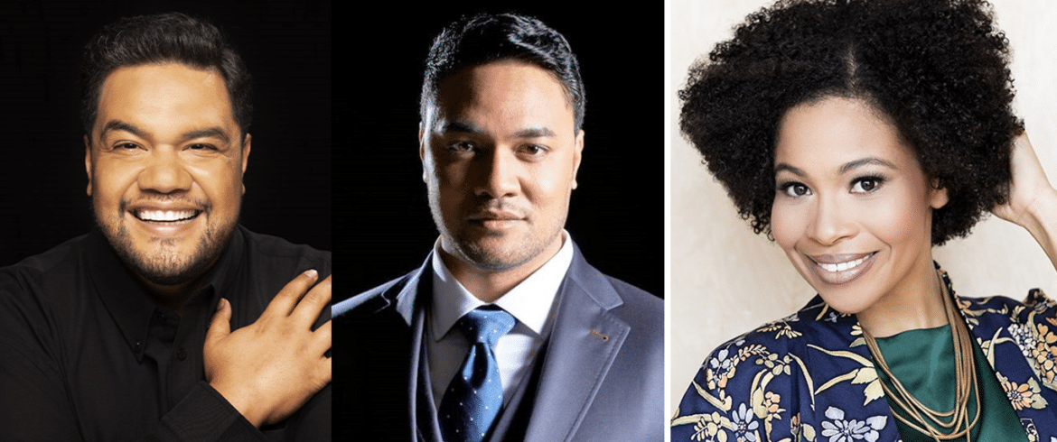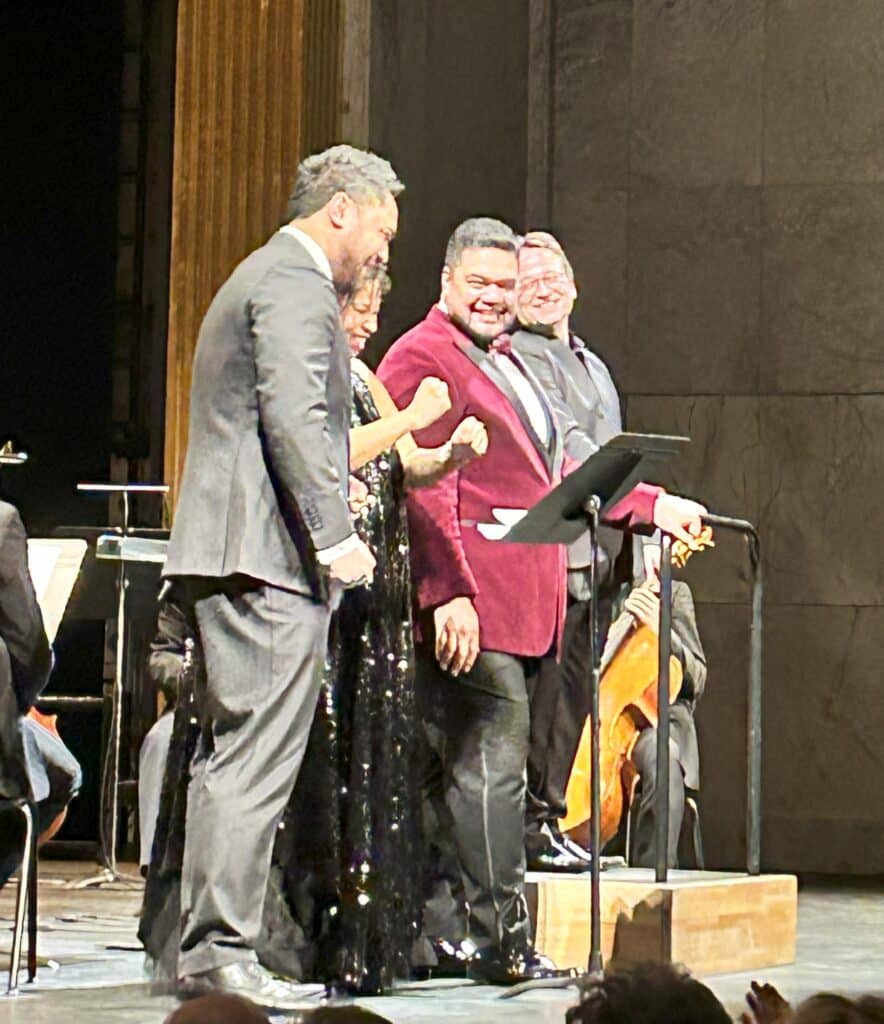 Après un alerte Charleston de Reynaldo Hahn dont on relève l’effet heureux des vents, nous sommes déjà dans le domaine des bis : « Be my love », joliment interprété par Amitai Pati ; « The Glamorous Life », rendu par la seule voix de Golda Schultz, manquant quand même d’un zeste d’entrain ; « Dein ist mein ganzes herz », proposé encore à deux par les frères Pati, bien que Pene soit prépondérant au début, créant un beau contraste entre la tonalité claironnante de ce dernier et les résonnances plus graves de son cadet ; les deux chansons de Charles Trenet, entonnées à trois, mettant de l’ambiance et réjouissant les spectateurs. Entre rythmes et chansons traditionnelles, accompagnées à la guitare hawaïenne – Juan Diego Flórez docet –, la soirée se conclut dans une atmosphère quelque peu exotique, planant entre la méditation d’un amoureux transi des îles Samoa et les cris guerriers de Nouvelle Zélande, récupérés par le monde du rugby. Le public est aux anges !!!