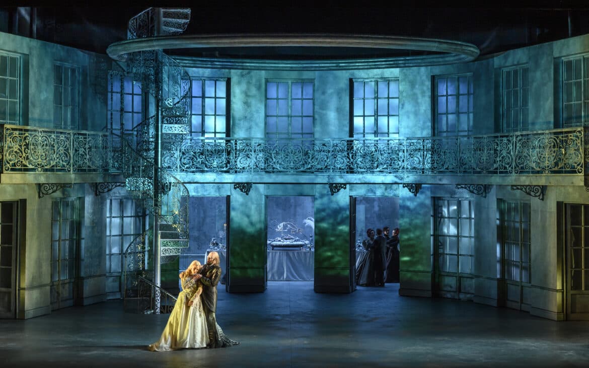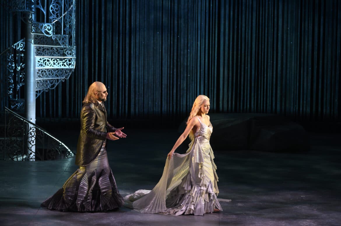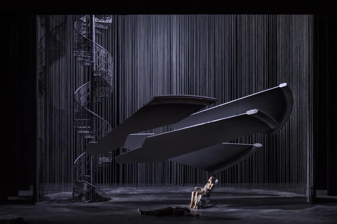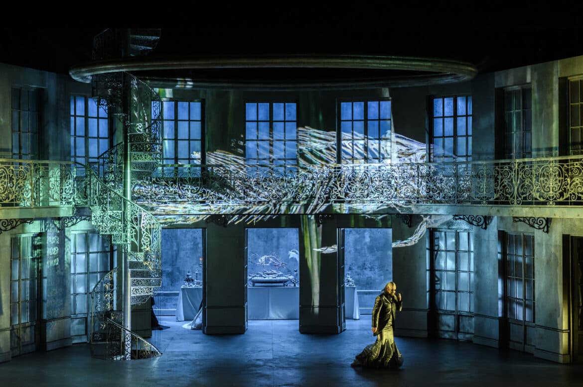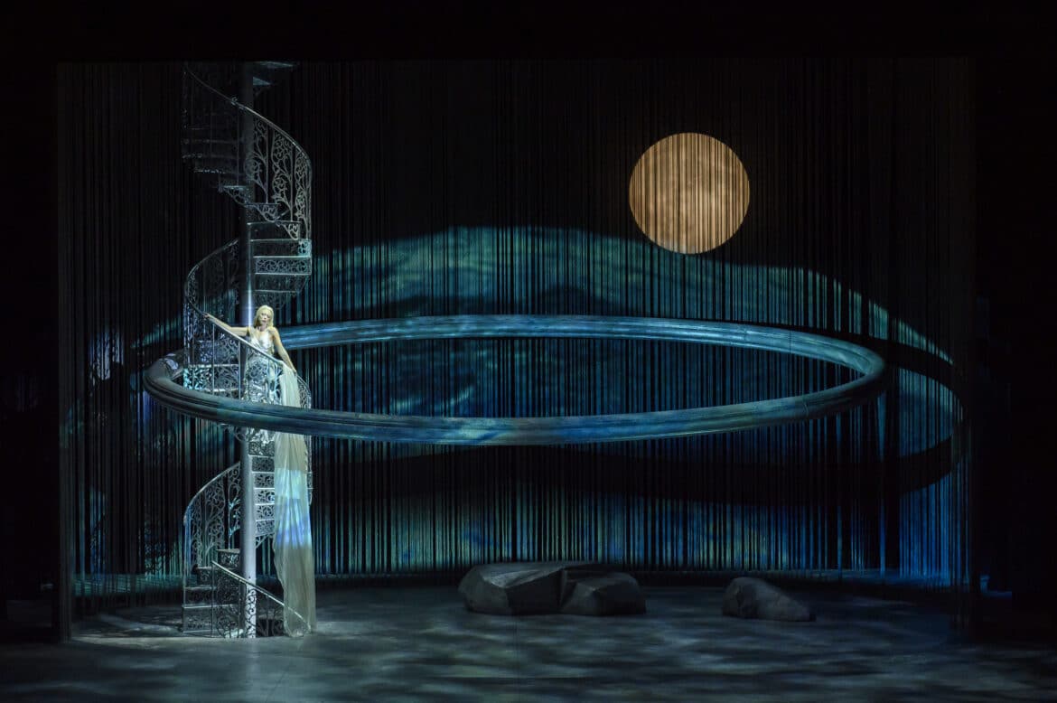 L’Opéra Royal de Wallonie-Liège a pour sa part fait appel à Rodula Gaitanou, jeune metteuse en scène membre du Jette Parker Young Artists Programme du Royal Opera House de Londres, et nommée en 2019 dans la catégorie « metteur en scène de l’année » aux International Opera Awards. À rebours des relectures transposant les œuvres dans un contexte contemporain et tentant avec plus ou moins de succès d’actualiser les problématiques qu’elles recèlent, Rodula Gaitanou s’en tient aux enjeux dramatiques présents dans le texte de Jaroslav Kvapil : passion amoureuse, sacrifice, tentation de l’infidélité, remords, rédemption, sans renoncer (il faut lui en savoir gré !) aux dimensions fantastique et si profondément romantique dont sont imprégnés le livret et la musique. Le fantastique réside dans la volonté affichée de respecter la scission entre le monde réel des humains et celui des ondins où évoluent les nymphes, l’Esprit du lac et Ježibaba, qui conserve bel et bien ici son statut de sorcière (Nino Surguladze en traduit parfaitement l’étrangeté, physique – étonnant maquillage – et vocale, grâce à une projection sans faille et certaines sonorités gutturales dans le registre grave). La séparation entre les deux univers est symbolisée d’une part par un rideau de fines lanières, d’autre part par une grande ellipse figurant la frontière entre le monde aquatique et le monde terrestre, une ellipse qui peut au gré des tableaux descendre vers le plateau ou monter vers les cintres. L’idée est simple mais habile : en fonction de la position de l’ellipse, nous nous trouvons soit au fond des eaux, soit à la surface de l’eau, soit sur terre. Un procédé esthétiquement séduisant et qui fonctionne parfaitement, sauf peut-être à l’acte II où, bien que l’action se déroule sur la terre ferme, dans le palais du Prince, l’ellipse se trouve située en hauteur… Le spectacle, quoi qu’il en soit, progresse efficacement, avec une bonne dose de poésie. Tous les tableaux n’ont pas, cependant, la même force, et n’emportent pas forcément l’adhésion : ainsi, le ballet des invités du Prince, s’il est clair dans ses intentions (traduire la vulgarité des êtres humains par-delà leurs apparentes bonnes manières et leurs élégants costumes), convainc moyennement ; de même, il est dommage que, pour traduire la concupiscence de la Princesse étrangère, Rodula Gaitanou ait cédé à certains procédés assez éculés (la princesse plaque ostensiblement sa main sur l’entrejambe du Prince avant de le chevaucher lascivement..). Mais certaines scènes sont réellement marquantes, telles celles de Rusalka mélancoliquement figée sur son grand escalier, laissant tomber vers le sol sa longue traîne, telle une petite sœur de Mélisande… ; celle où elle découvre, émerveillée, ses nouvelles jambes et essaie maladroitement quelques pas ; ou encore la très émouvante scène finale, avec un jeu d’acteurs subtil, très travaillé. Bravo également à Cordelia Chisholm pour ses élégants costumes et surtout sa très belle scénographie.