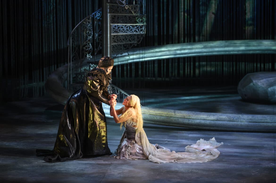 Excellent, l’Esprit du lac d’Evgeny Stavinsky, qui se révèle ici l’un des tout premiers éléments du plateau : la jeune basse propose de Vodnik un portrait plein de noblesse et d’’humanité, porté par un chant raffiné et très émouvant (superbe « Bĕda ! Bĕda ! » au deuxième acte !). Anton Rositskiy avait fait sensation sur cette même scène en remplaçant au pied levé, dans l’Otello de Rossini, Sergey Romanovsky, devenu subitement aphone après quelques minutes de spectacle seulement. Il revient cette fois-ci « par la grande porte », et met sa belle voix souple et agréablement colorée, moins légère qu’il n’y parait (il surmonte aisément les tutti de l’orchestre, par exemple à la fin du premier acte) au service du rôle du Prince, assez éprouvant par sa longueur et par la densité orchestrale à laquelle il doit faire face. Quant à Corinne Winters, elle remporte un tel triomphe qu’on hésite presque à émettre un léger bémol ; cette voix, ample, dense, au médium et aux graves richement colorés, manque peut-être légèrement de transparence dans les pages de pur lyrisme et de poésie, tel le célèbre « Chant à la lune » du premier acte ; elle est en revanche parfaitement adaptée aux éclats plus dramatiques du second acte et, quoi qu’il en soit, son engagement (vocal et scénique) est tel qu’il balaie in fine toute réserve : ne reste que la force d’une interprétation très travaillée et hautement émouvante.