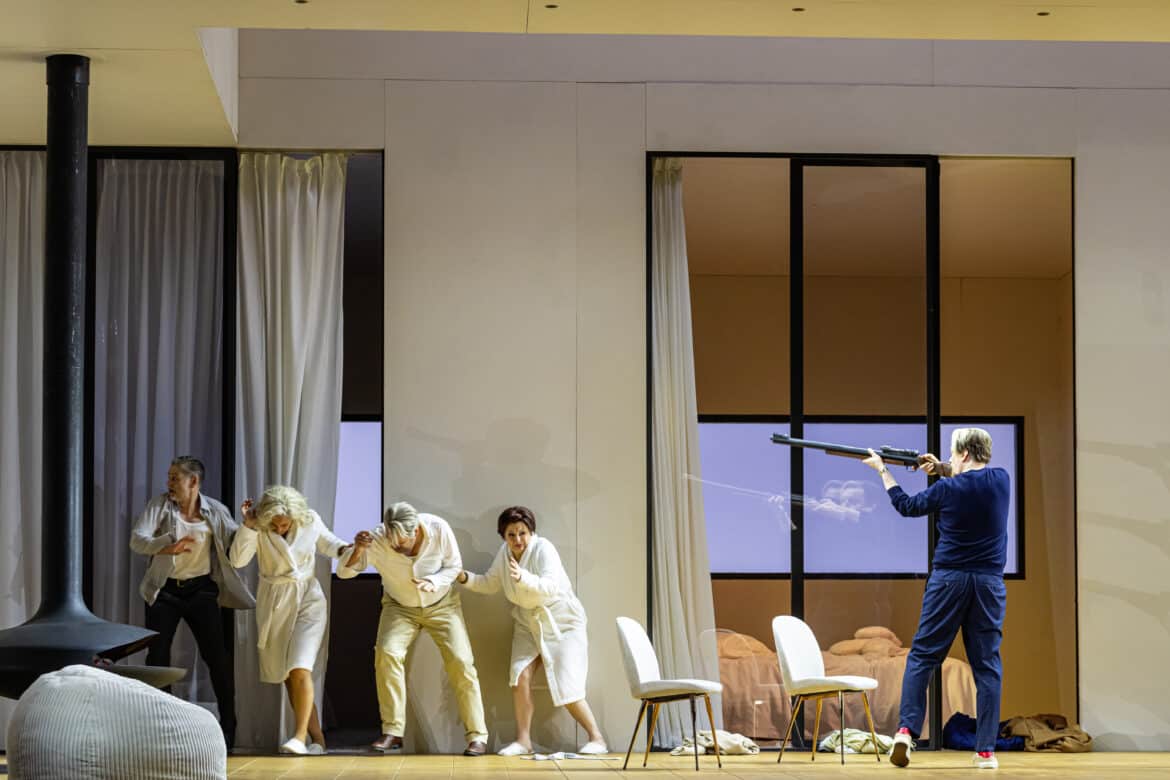 Donnée en juillet dernier au Festival d’Aix-en-Provence, coproducteur, la mise en scène de Così fan tutte conçue par Dmitri Tcherniakov est l’exemple type de spectacle à programme : au lieu de partir de l’œuvre afin de bâtir une narration scénique, elle part d’un concept et adapte le titre à ses besoins. Le réalisateur russe ne s’en cache d’ailleurs pas, son propos étant bien explicité dans le programme de salle : nous nous trouvons donc « dans une maison un peu mystérieuse » où ont lieu des « séances d’échangisme ». Don Alfonso et Despina en sont les propriétaires et deux couples « âgés de cinquante ans » s’y rendent en tant que clients. La scénographie du même Tcherniakov prévoit alors un grand espace assez cossu, aux allures très contemporaines, composé d’un séjour avec cheminée en fonte, une table et des chaises confortables pour les dîners. Deux grandes baies vitrées cachent des chambres à coucher où trônent des lits matrimoniaux. Les deux aubergistes se chamaillent pendant l’ouverture pour enfin s’embrasser avant l’arrivée des hôtes. Les paris entre les hommes se font d’ailleurs en présence des femmes. Don Alfonso s’adonne régulièrement à des éclats de rire assez convulsifs. Bien que le metteur en scène dise avoir renoncé aux « travestissements traditionnels », il a cependant recours à des masques dorés afin de représenter l’arrivée des nobles albanais – même s’ils doivent vite tomber. Lors de la supposée tentative d’empoisonnement des deux soupirants, on se demande pourquoi Despina, censée être déguisée en médecin, pointe un fusil, alors qu’elle doit toujours recourir à ces mains, en guise d’aimant salutaire, afin de les ramener à la vie. L’arme se révèle alors n’être qu’un jouet de clown d’où ressort une ombrelle quand on tire enfin. Quitte à être véritablement chargée à l’issue de l’opéra, et c’est Don Alfonso qui en sera la victime, peut-être expiatoire.