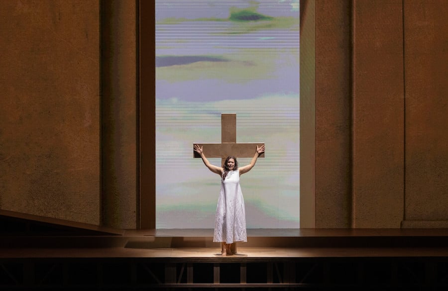 « Un grand triptyque fermé, avec un beau cadre sculpté et doré, repose sur trois marches devant un mur de tissu violet. Deux anges vêtus de blanc, élancés, émergent du mur, de part et d’autre du tableau : légers et silencieux, ils ouvrent les portes du triptyque et disparaissent ». C’est ainsi que commence le livret imprimé par Ricordi pour la première au Teatro Goldoni le 10 août 1932, et l’on aurait pu s’attendre avec un certain plaisir coupable à ce qu’un maître de la scène comme Pier Luigi Pizzi pouvait faire de ces didascalies, avec peut-être une touche irrévérencieuse. Au lieu de quoi… c’est une grande déception : le metteur en scène/scénographe/costumier a pris l’histoire tout à fait au sérieux et si la pantomime des deux anges, prévue dans le prélude introductif, apportait un certain espoir, la clé de l’interprétation qui nous est donnée est très platement illustrative. Le doyen du théâtre italien s’est tourné cette fois vers le graphisme vidéo et, à la place de son élégante architecture, nous avons un mur en led sur lequel sont projetées des images marines, des bâtiments anciens qui semblent avoir été construits par une intelligence artificielle dans un style quelque peu surréaliste, des symboles christologiques, y compris une forêt de croix semblable à celle de Thaïs que le Maestro a présentée à La Fenice en 2007. Le seul élément tridimensionnel sur scène est un bateau en bois stylisé sur lequel, accompagné de trois braves marins, monte joyeusement notre pécheur entreprenant. Dans les intermèdes orchestraux, une danseuse (Maria Novella Della Martira) prend la place de Maria dans des mouvements chorégraphiques prévisibles.