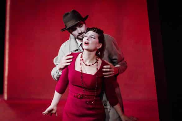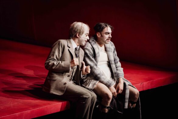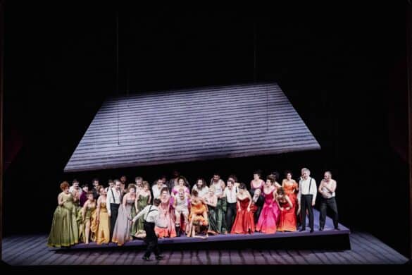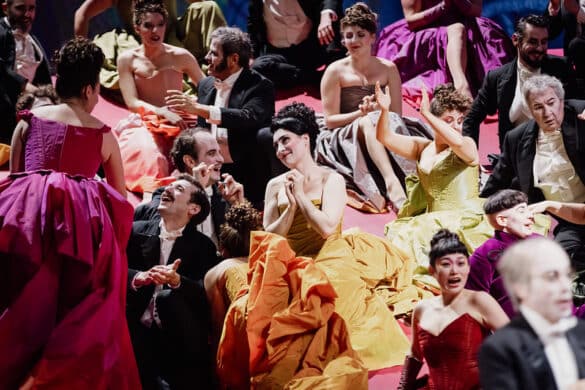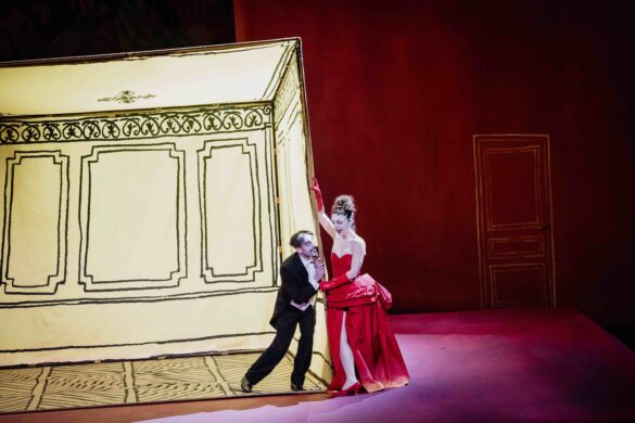 En attendant, un public nombreux s’est pressé pour se délecter des bulles de champagne de la musique pétillante de Strauss, dont le chef-d’œuvre lyrique émerveille toujours autant par sa capacité à enchainer les « tubes », en une ivresse mélodique revigorante. Le plateau vocal réuni met certes un peu de temps à se chauffer au début, particulièrement les deux premiers rôles féminins dévolus à Camille Schnoor et Marie-Eve Munger : leurs voix puissantes sont ainsi mises à mal par la rapidité des sauts de registre, occasionnant quelques faussetés et stridences. Fort heureusement, les deux chanteuses trouvent finalement le juste tempo dès le tourbillonnant deuxième acte, où les esprits et les corps s’échauffent, en même temps que la farce devient de plus en plus savoureuse. On se réjouit ainsi de découvrir une adaptation en français, avec des dialogues modernisés, nécessaires pour apprécier toutes les subtilités des accentuations comiques : à ce titre, l’ensemble du casting se montre à la hauteur, en adoptant avec un plaisir manifeste les réparties volontairement affectées, qui lorgnent vers le vaudeville, de Labiche à Feydeau.
