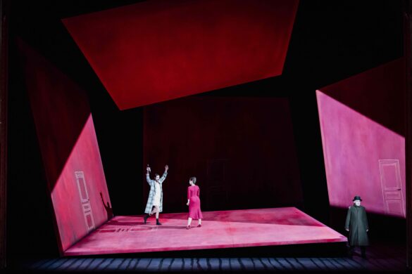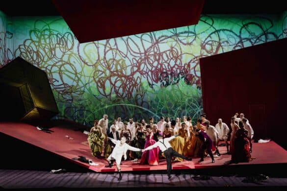 Le spectacle de Laurent Pelly met un peu de temps à se mettre en place en déconstruisant patiemment les faux-semblants bourgeois : pour cela, la scénographie épurée fait évoluer la structure étriquée dans laquelle évolue le couple volage, en lui donnant peu à peu des allures cubistes. Les murs éclatés symbolisent ainsi la liberté retrouvée des époux en mal de sensation, avant que la fête ne prenne corps dans l’énergie débridée des mouvements du chœur. Comme à son habitude, c’est dans le domaine de la direction d’acteurs que Laurent Pelly apporte ces petits détails savoureux qui donnent tant de crédibilité à la farce, avec un recours fréquent aux pantomimes. Particulièrement, on aime cette capacité à faire vivre cette folle soirée d’un réalisme encore si actuel, quand les vapeurs d’alcool font basculer les freins sociaux pour mieux délivrer les désirs, irrépressibles et sous-jacents, entre les sexes.