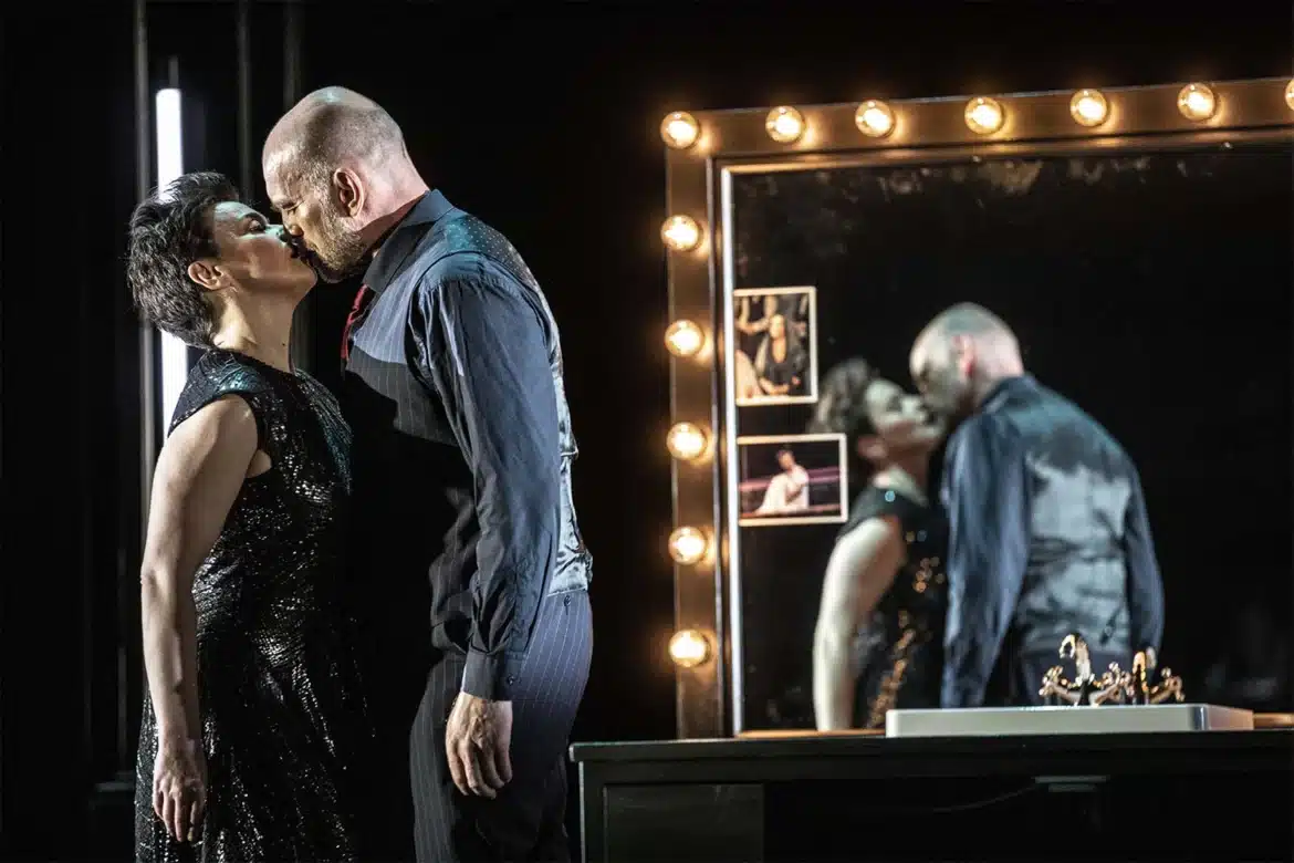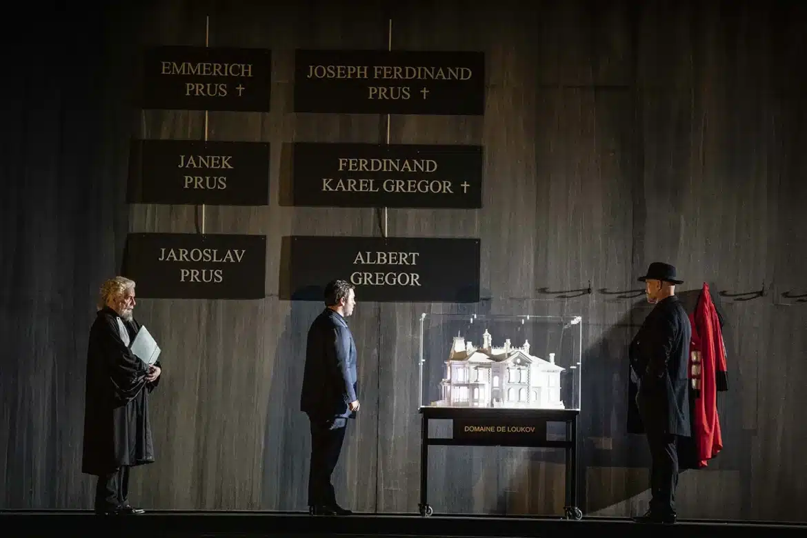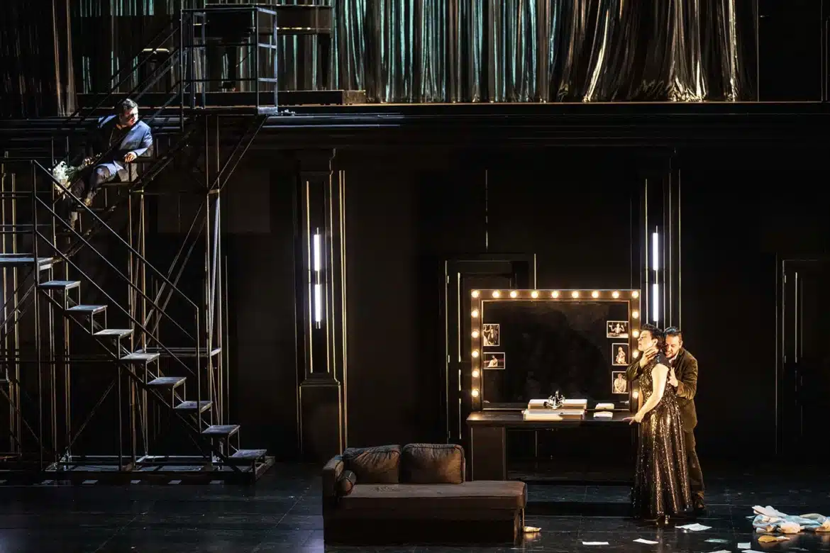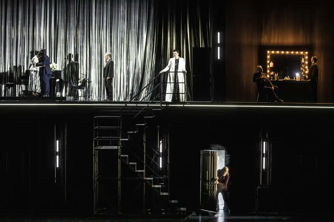 La réflexion sur l’éternelle jeunesse, sur le trouble identitaire, qui peut faire penser à Pirandello ou Oscar Wilde, se double d’une réflexion méta-musicale sur la voix, sa durée et sa performance. Richard Brunel relie ainsi ces deux thèmes majeurs dans sa lecture de l’œuvre à travers un dispositif scénique qui confronte Emilia Marty et sa concurrente Krista, une admiratrice qui voudrait bien lui succéder. On comprend mieux ainsi l’omniprésence des pianos sur scène, ou les tables de maquillages. La scène est ingénieusement divisée en deux niveaux, avec décors coulissants, des meubles qui bougent, symboles d’un univers instable, et des rideaux qui permettent de créer des zones de hors-champs (comme pour le suicide de Janek), tout en respectant les changements de décor (la scène de théâtre au début du deuxième acte). Les costumes élégants début XXe de Bruno de Lavenère (qui signe également les très beaux décors) et les lumières efficaces de Laurent Castaingt contribuent à la réussite totale de la production. La direction d’acteurs, en tout point remarquable, nous donne à chaque instant d’authentiques moments de théâtre, dans un respect scrupuleux de l’œuvre.