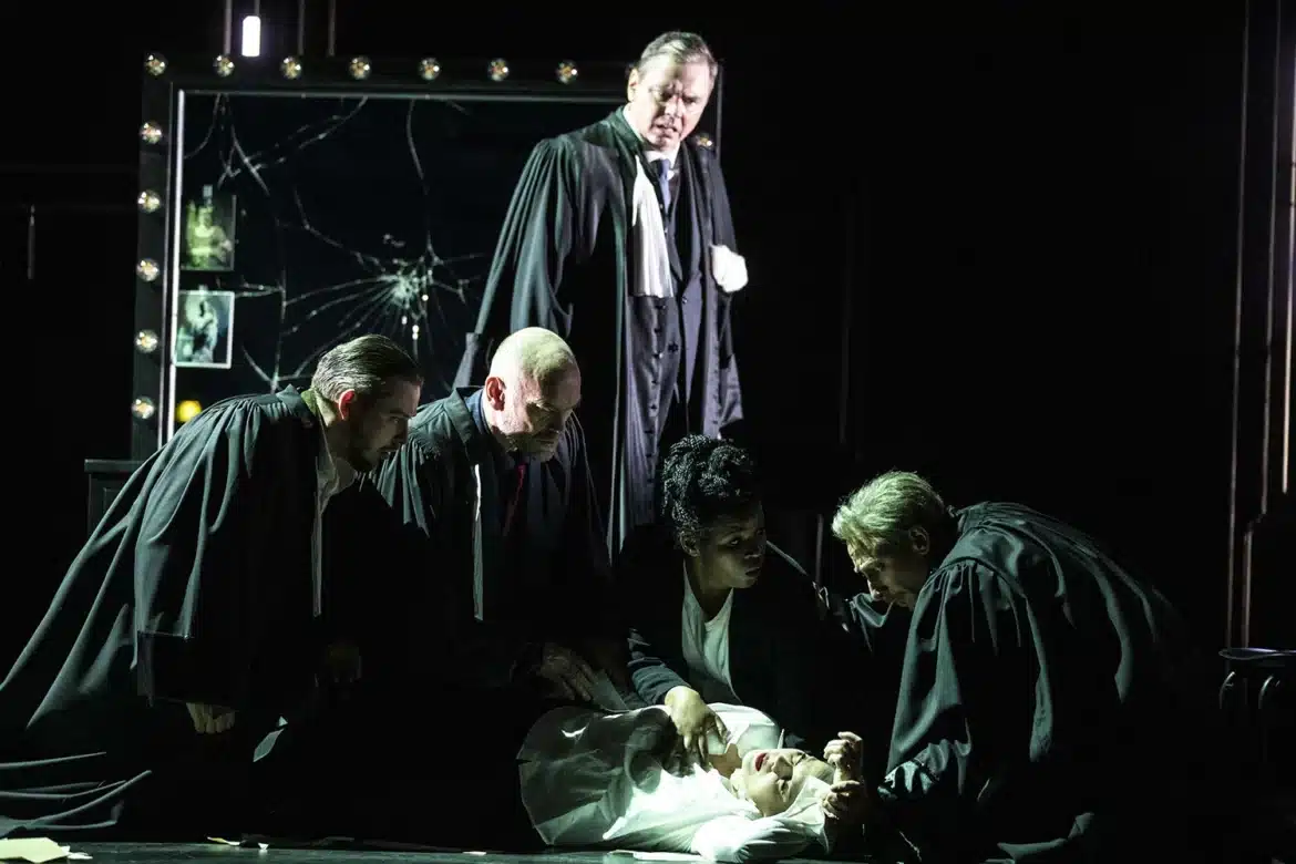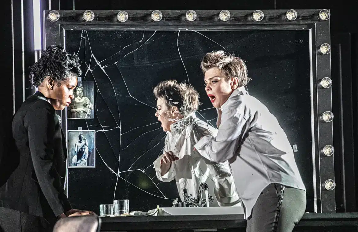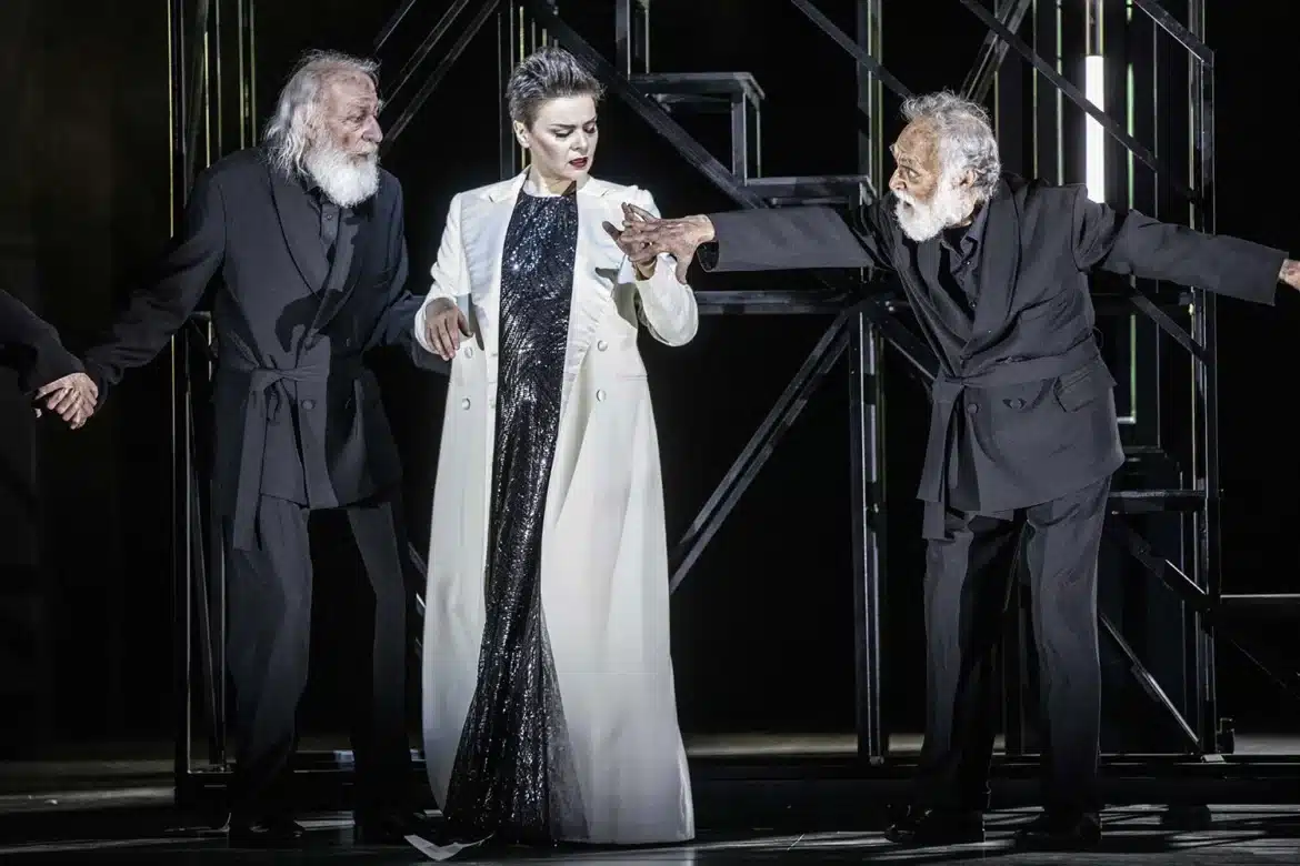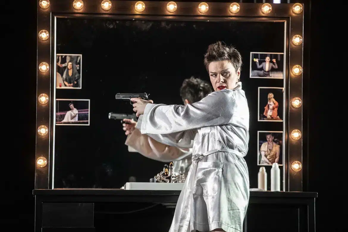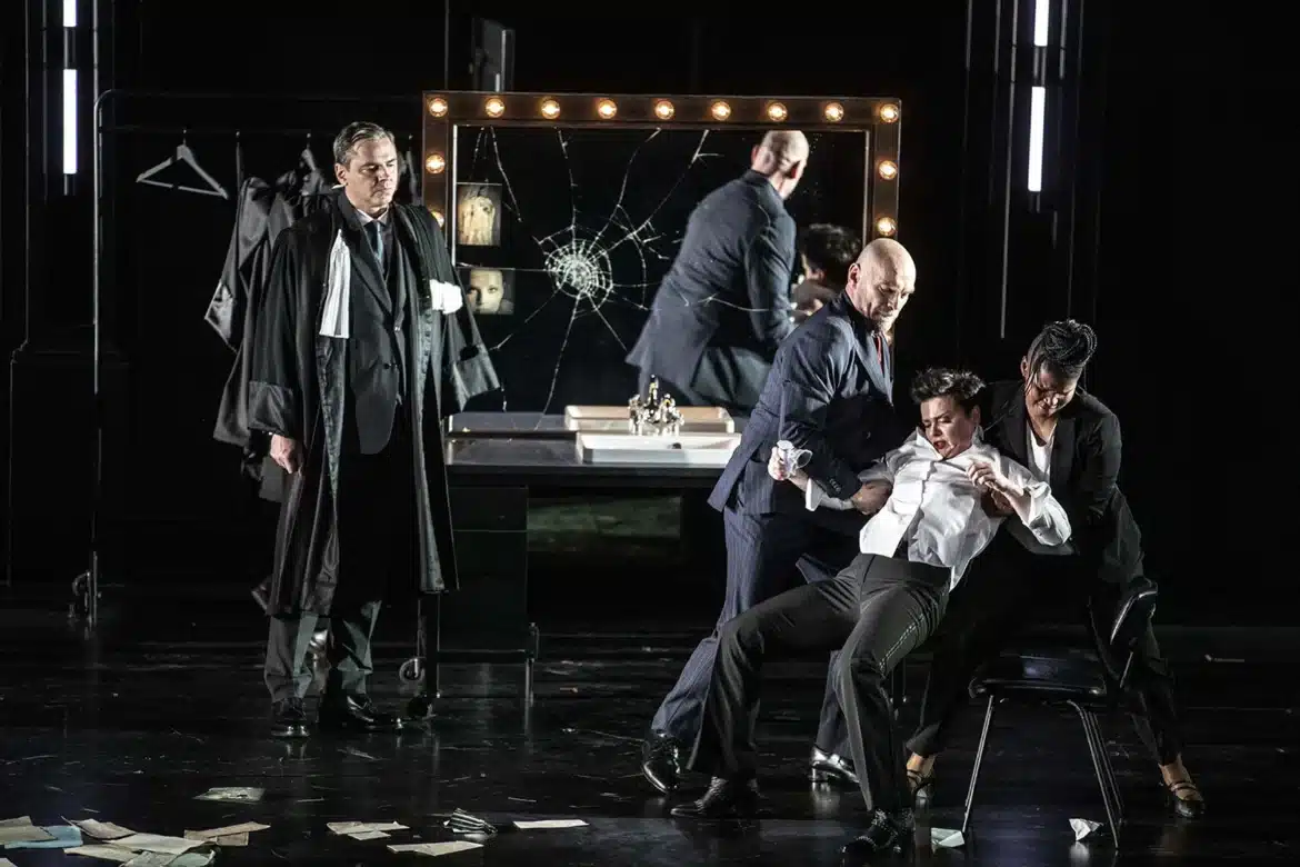 La réflexion sur l’éternelle jeunesse, sur le trouble identitaire, qui peut faire penser à Pirandello ou Oscar Wilde, se double d’une réflexion méta-musicale sur la voix, sa durée et sa performance. Richard Brunel relie ainsi ces deux thèmes majeurs dans sa lecture de l’œuvre à travers un dispositif scénique qui confronte Emilia Marty et sa concurrente Krista, une admiratrice qui voudrait bien lui succéder. On comprend mieux ainsi l’omniprésence des pianos sur scène, ou les tables de maquillages. La scène est ingénieusement divisée en deux niveaux, avec décors coulissants, des meubles qui bougent, symboles d’un univers instable, et des rideaux qui permettent de créer des zones de hors-champs (comme pour le suicide de Janek), tout en respectant les changements de décor (la scène de théâtre au début du deuxième acte). Les costumes élégants début XXe de Bruno de Lavenère (qui signe également les très beaux décors) et les lumières efficaces de Laurent Castaingt contribuent à la réussite totale de la production. La direction d’acteurs, en tout point remarquable, nous donne à chaque instant d’authentiques moments de théâtre, dans un respect scrupuleux de l’œuvre.