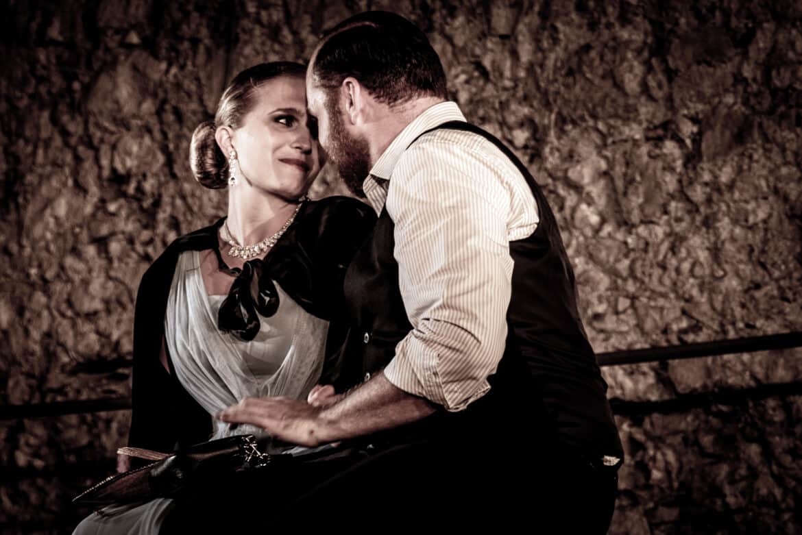 Saluons, en outre, dans un projet reposant essentiellement sur la conjonction d’un ensemble de volontés individuelles mises en commun, la beauté simple, élégante et totalement adaptée des costumes dont certains ont été loués à l’Opéra de Nice (les lumières sont également coordonnées par Barbero), collaborateur artistique de tout premier plan dans cette entreprise, et d’autres (les robes de soirée) sont personnels aux artistes. C’est également le cas des éléments du décor qui viennent évidemment s’inscrire dans le cadre apaisant de la place Grimaldi du village, environnement naturel de tous les spectacles montés à Gattières.