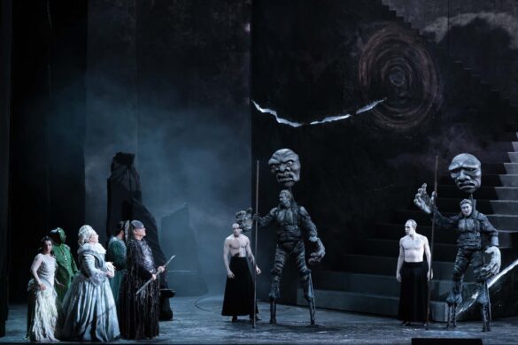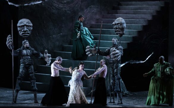 Dans la lecture de McVicar, le mythe des légendes nordiques se transforme en un univers fantastique plutôt kitsch dans les costumes d’Emma Kingsbury, qui met des jupes à tous les dieux, dont les formes sont agrandies hors de toute proportion, avec des effets (in)volontairement ridicules dans le cas de Froh, un croisement entre une grenouille et un joyeux compère de Windsor de taille XXXL. Le metteur en scène écossais rate également sa cible en ce qui concerne le jeu des acteurs, se reposant presque exclusivement sur les compétences individuelles des chanteurs et la présence de serviteurs/danseurs muets (la chorégraphie est signée Gareth Mole) qui meublent les merveilleux intermèdes orchestraux par des mouvements offensants devant le rideau, ou qui accompagnent les évolutions des personnages, entravés dans leurs mouvements de géants. Essentiel, dans un tel spectacle, est le rôle de l’éclairage, ici bien réalisé par David Finn. Les vidéos de Katy Tucker, en revanche, sont banales : avant le coup porté par Donner – qui fait vibrer son marteau sur l’escalier qui vient d’être achevé -, on voit des nuages immédiatement suivis de lueurs boréales évoquant un arc-en-ciel.