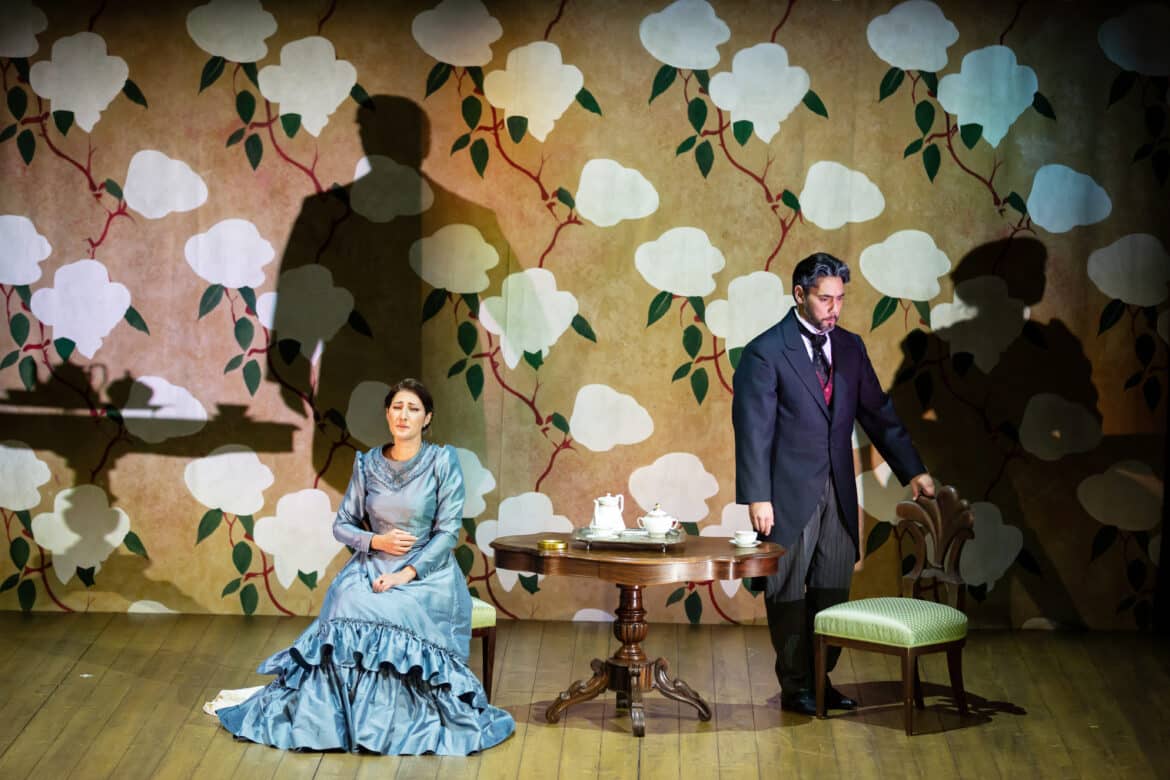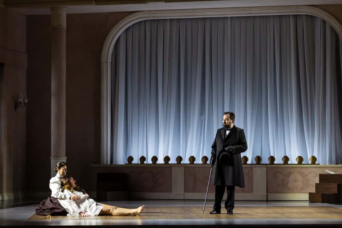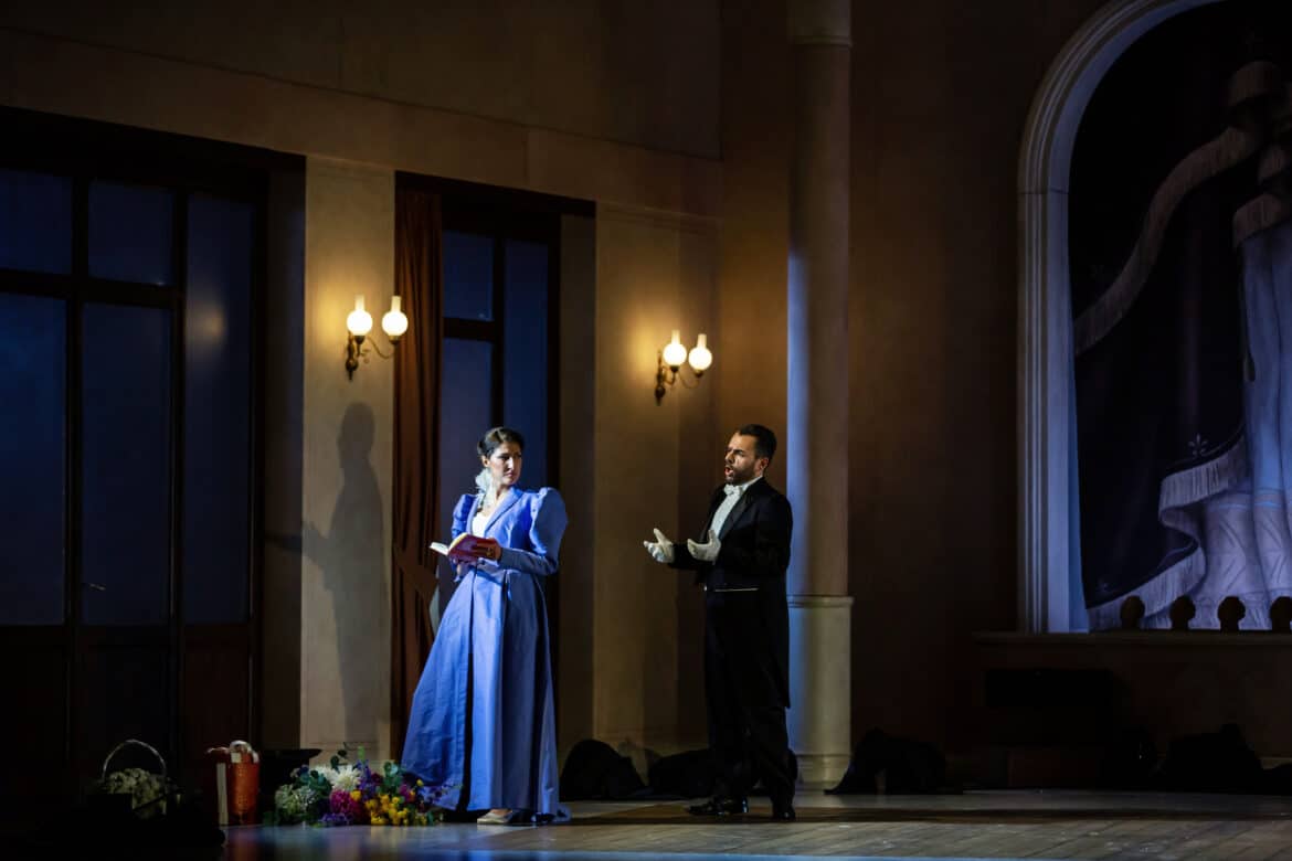 Autour d’elle évolue une belle équipe de chanteurs : Dionysios Sourbis est un Germont un peu « raide » vocalement dans ses premières interventions (mais cela convient bien à la conception du personnage, absolument « monolithique », voulue par la metteuse en scène) ; le baryton parvient cependant à « arrondir les angles » pour le cantabile d’un « Di Provenza » de bonne tenue. Giulio Pelligra met un peu de temps à prendre ses marques (il ne nous a pas semblé au mieux de sa forme : peut-être était-il légèrement souffrant[1] ?), mais il gagne en assurance au fil du second acte et campe in fine un Alfredo attachant malgré le rôle détestable qu’on lui fait jouer. Des comprimari, tous parfaitement impliqués, se distinguent tout particulièrement Aurore Ugolin, qui donne à Flora un relief inaccoutumé, le Marquis d’Obigny de Stavros Mantis, déjà très remarqué en octobre dernier dans Il piccolo Marat, ou encore le Docteur très noble de Jean-Vincent Blot, ici sous-employé et à qui il serait temps, après ses derniers succès (sur cette même scène, à Orange ou à Metz) de confier des emplois plus importants !