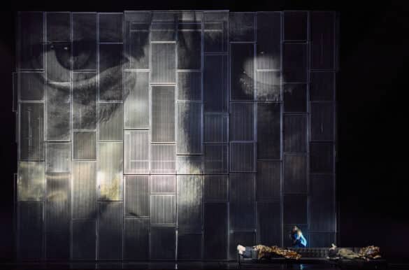 Pourtant, le résultat s’avère in fine bien terne, pour ne pas dire décevant. On attendait de Calixto Bieito une lecture qui, à tout le moins, nous surprenne, nous interpelle, nous choque… Au lieu de quoi nous avons eu, dans cet Or du Rhin, une direction d’acteurs paresseuse, devant un rideau métallique ne s’ouvrant que rarement sur d’autres éléments scénographiques tout aussi peu séduisants et agrémenté de temps à autre par d’inévitables et attendues projections filmiques. On retiendra de la mise en scène deux ou trois idées (l’anneau / collier que ses possesseurs se passent au cou, rendant ainsi visibles leur asservissement au pouvoir de l’anneau ; le fait qu’Alberich pallie son « renoncement à l’amour » par des plaisirs qu’il trouve dorénavant entre les bras de créatures artificielles)… mais deux ou trois idées ne suffisent pas à donner une ligne directrice forte au spectacle (nous y avons cherché en vain la dénonciation d’« un contexte dominé par la virtualité numérique », annoncé par le metteur en scène), surtout lorsqu’il est entaché de procédés agaçants (l’agitation permanente de Fricka lors de ses premières apparitions), attendus (les filles du Rhin équipées de palmes en plastique) ou déjà vus (le corps de Freia traîné sur une grande bâche en plastique, comme celui de Maria dans le Boccanegra de Bieito sur cette même scène).
