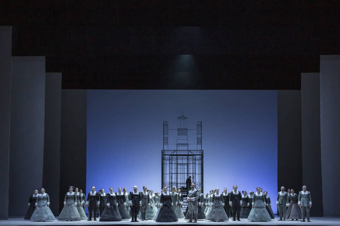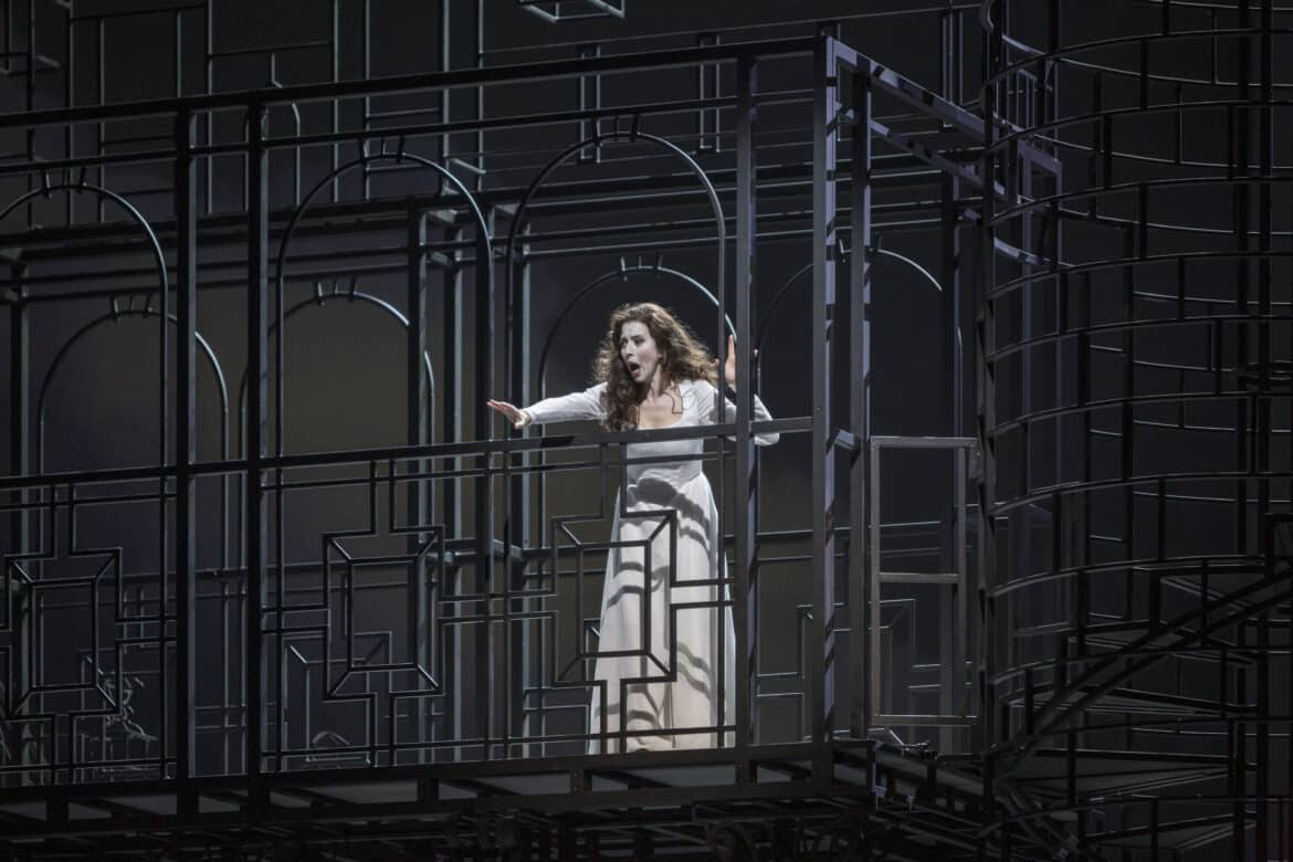 Créée à l’automne 2013, reproposée en septembre-octobre 2019, la production des Puritani de l’Opéra national de Paris est suffisamment connue du public parisien pour que l’on ne s’y attarde pas outre mesure. Rappelons juste ce beau décor réduit à l’essentiel (Chantal Thomas), les angles et les arêtes d’un château, comme le rappelle Laurent Pelly dans le programme de salle, enfermant les acteurs dans une atmosphère cauchemardesque, afin de « raconter l’histoire à travers le regard d’Elvira », énième personnage féminin qui faillit être sacrifié. De même pour des costumes d’époque revisités, crayonnés par le metteur en scène lui-même. Et encore les jolies silhouettes noires de l’héroïne et de son oncle descendant l’escalier et parcourant la scène dans l’obscurité. Puis, cette tour-cage dorée où se démène la jeune fille atteinte de démence.