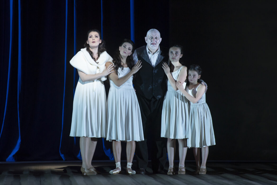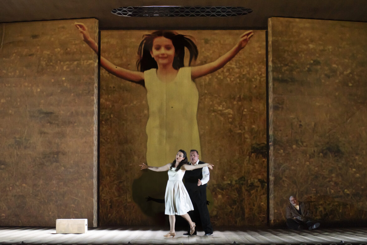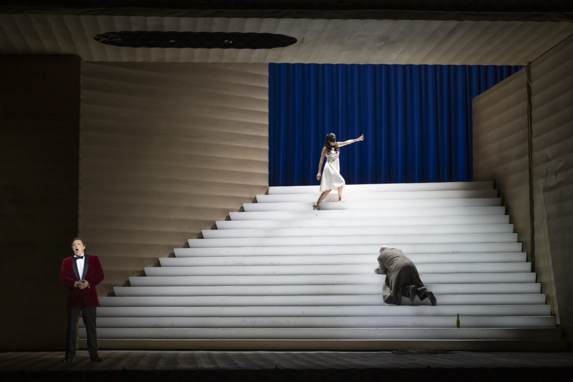Constamment doublé par le comédien Henri Bernard Guizirian, nous savons que ce Rigoletto a aussi son double chez Sparafucile, ce soir interprété par un Alexander Tsymbalyuk au beau timbre caverneux, parfaitement assorti à celui de son compère, aussi bien à l’acte I qu’à l’acte III. De même, Maddalena devient une sorte de miroir de Gilda, lorsqu’elle se replie dans les bras du figurant, formant un tableau qui suggère quelque peu Antigone auprès d’Œdipe, sinon Cordelia au secours de Lear. Question de rappeler que le drame hugolien, prenant ses distances de la tragédie classique, avait bien assimilé la leçon shakespearienne. Comme à l’automne 2021, Justina Gringytė défend avec espièglerie la sœur complice, tout en apparaissant légèrement en retrait dans un trio du coup de grâce dominé par Gilda.