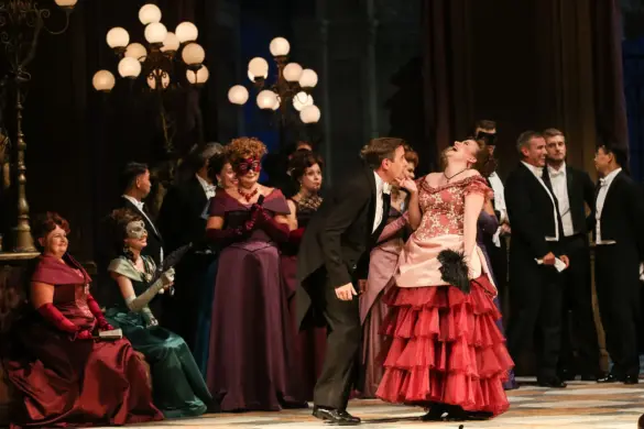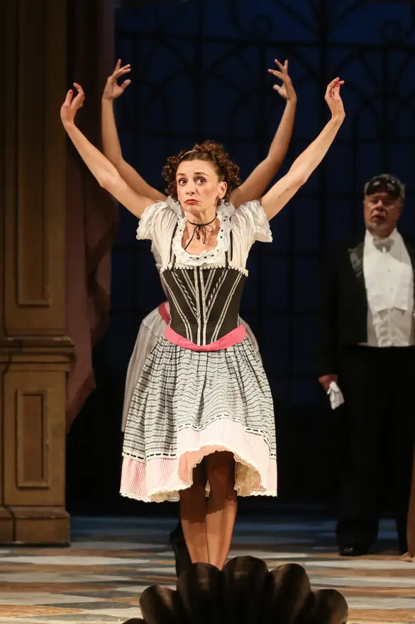 Saluons aussi l’effort en direction de la diversité. Est-ce le hasard de la distribution ou une volonté de la direction, toujours est-il que l’équipe rassemble un grand nombre de chanteurs non occidentaux, tous aussi intéressants les uns que les autres. Le Malgache Michael Arivony interprète un magnifique Falke. JunHo You vocifère un Alfred infatigable, Seiyoung Kim est hilarant dans le rôle de l’avocat incapable, et Gemma Nha a le tempérament qu’il faut pour la soubrette Adele, même si son air du rire, à l’acte II, pourrait être amélioré. L’excellence de l’école coréenne est bien représentée. Enfin, chapeau bas pour les deux rôles principaux. Anita Götz (Rosalinde) est une grande voix, avec une considérable extension dans le registre aigu de même que des agilités impeccables. Son csárdás dévoile, dans le registre forte, un timbre qui rappelle Julia Varady, pour notre plus grand bonheur. Quant au Suisse Alexandre Beuchat (Eisenstein), il a tout : il est beau, son aisance scénique est impressionnante, on ne voit que lui sur scène, il est tantôt drôle, tantôt intimidant (scène de la prison), et la voix est superbe. Indiscutablement, il s’agit du Gabriel du moment !