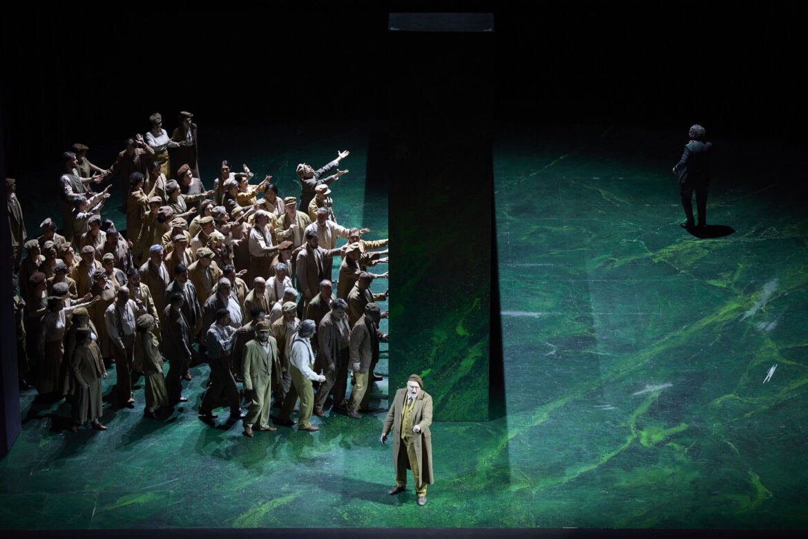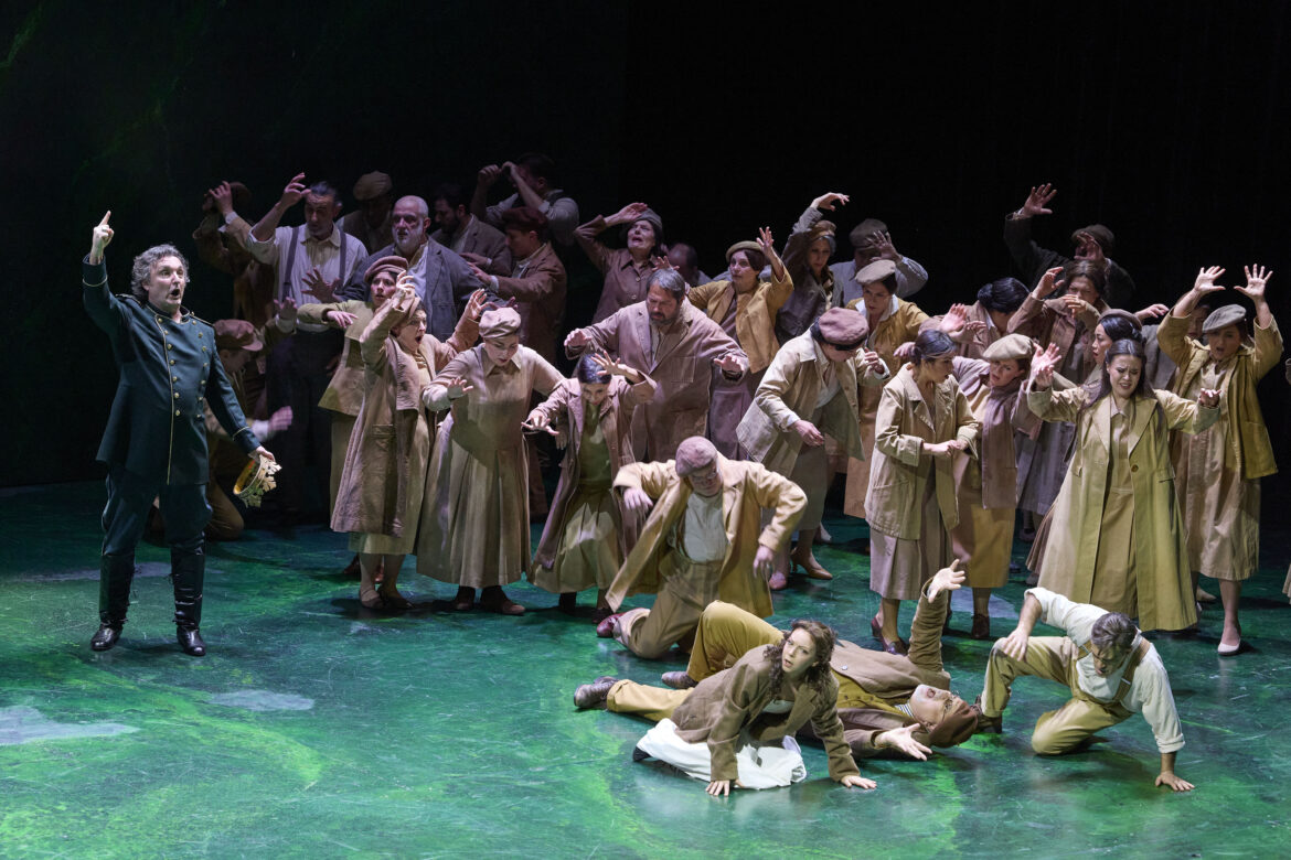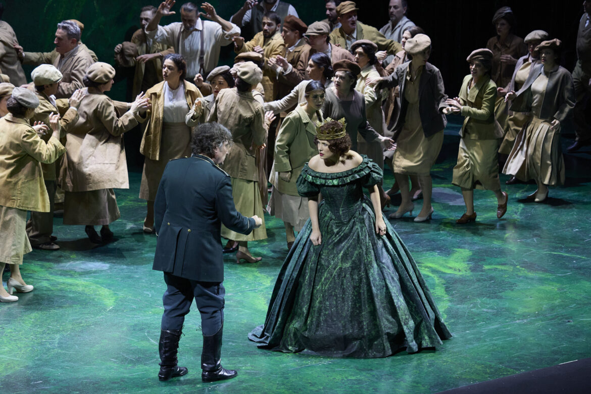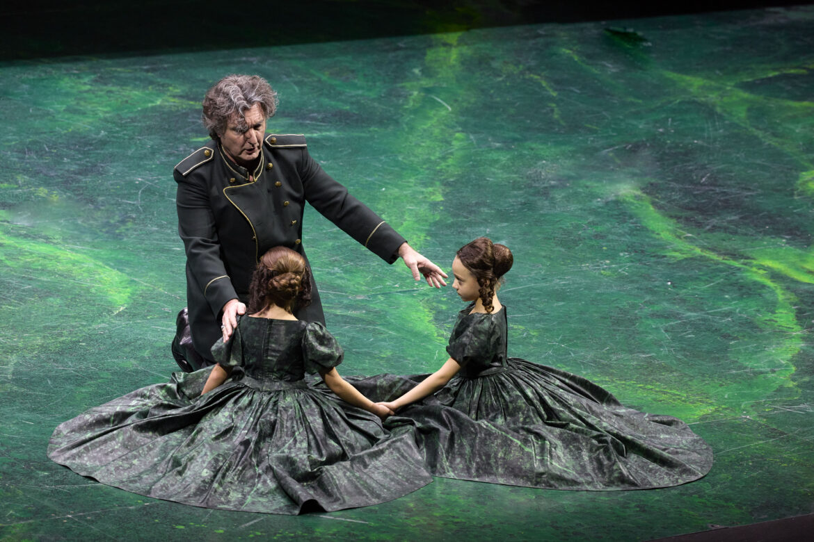 Après une absence d’un peu plus de sept ans – il s’agissait de la mise en scène de Jean-Paul Scarpitta, avec Anna Pirozzi dans le rôle d’Abigaille –, Nabucco revient au San Carlo de Naples et fait salle comble dans la conception de l’Opéra de Zurich – déjà revue à Amsterdam en 2020 et à Madrid, théâtre coproducteur, en 2022 –, signée par Andreas Homoki. Dans le programme de salle, ce dernier souligne l’opposition entre la nouvelle bourgeoisie et une aristocratie qu’à l’époque de Verdi l’on pouvait percevoir comme une alliée de la domination étrangère. En réalité, il s’agit d’une transposition à une époque vaguement 1900, ne serait-ce que par les costumes (Wolfgang Gussmann et Susana Mendoza) des choristes et des personnages, à l’exception de l’uniforme militaire du roi de Babylone et de la belle robe 1850 qu’endossent d’abord les deux princesses, bien que la cadette en soit vite dévêtue pour rejoindre son statut de captive, laissant à son aînée l’exclusivité d’un accoutrement qui la rapproche davantage de Violetta que d’une jeune femme de Mésopotamie. Le vert domine : la tenue du héros, la toilette des sœurs et surtout une sorte de parallélépipède marbré et mouvant en guise de décor unique (Wolfgang Gussmann). Une fois n’est pas coutume, l’ouverture donne l’occasion d’un retour à l’enfance, convoquant les deux fillettes qui se disputent déjà une couronne. Nabucco s’en empare et simule la mort. Présage ?
