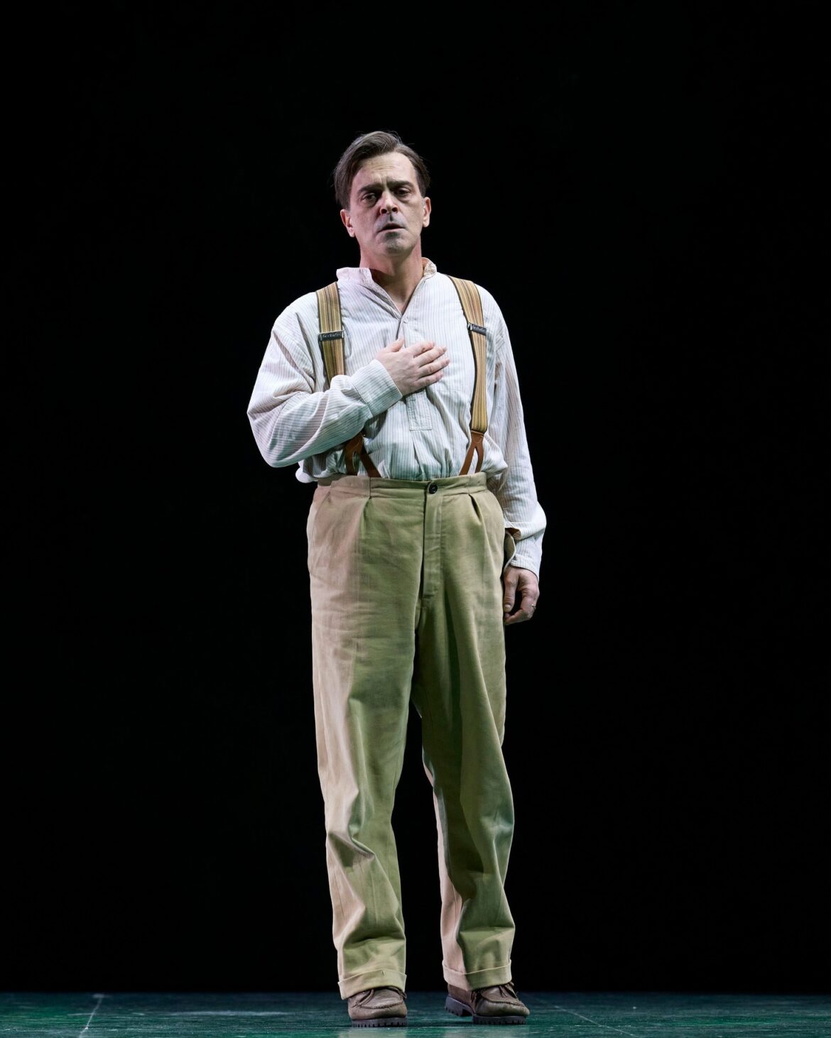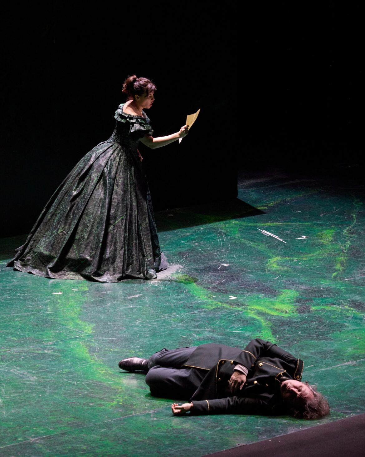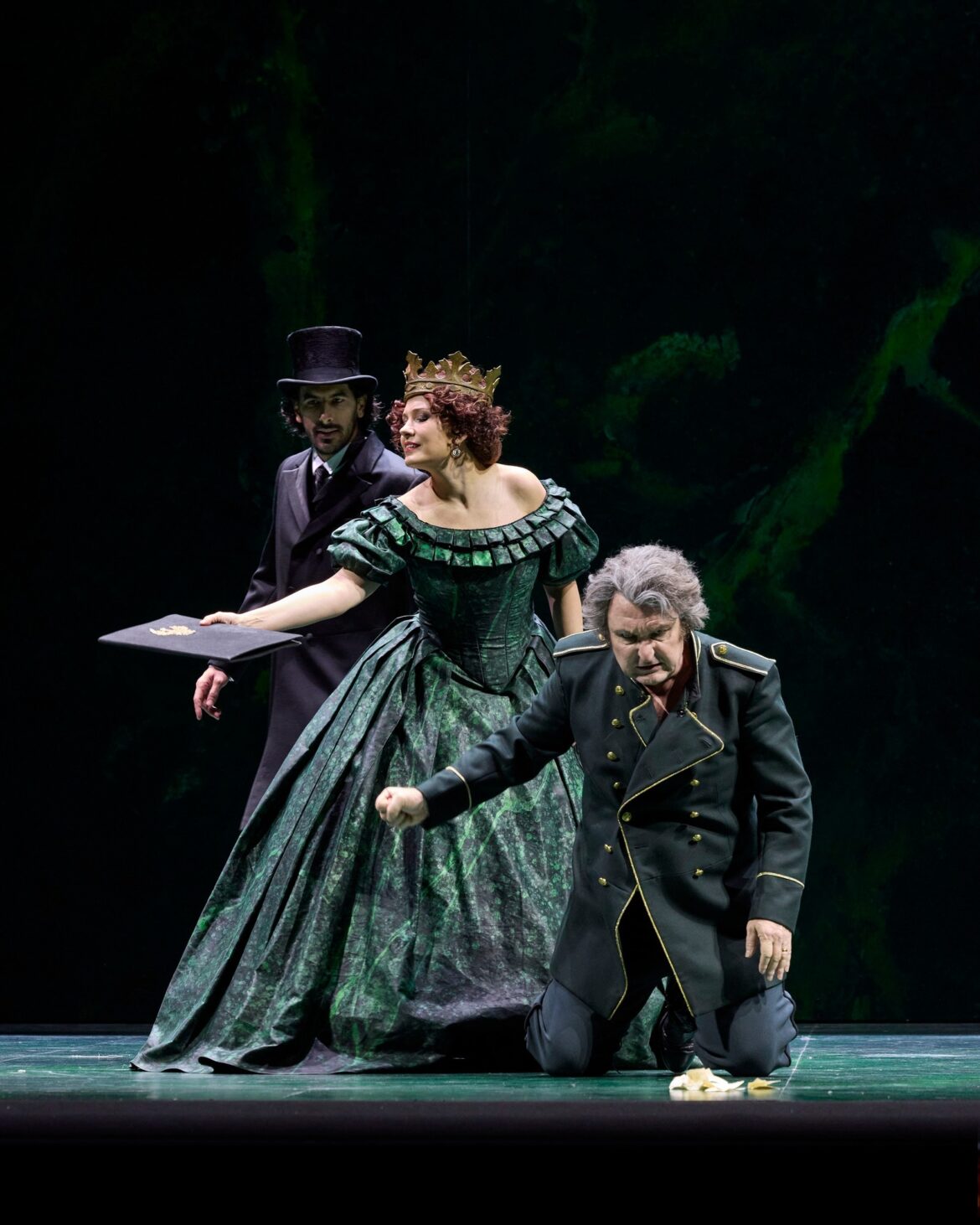 Après une absence d’un peu plus de sept ans – il s’agissait de la mise en scène de Jean-Paul Scarpitta, avec Anna Pirozzi dans le rôle d’Abigaille –, Nabucco revient au San Carlo de Naples et fait salle comble dans la conception de l’Opéra de Zurich – déjà revue à Amsterdam en 2020 et à Madrid, théâtre coproducteur, en 2022 –, signée par Andreas Homoki. Dans le programme de salle, ce dernier souligne l’opposition entre la nouvelle bourgeoisie et une aristocratie qu’à l’époque de Verdi l’on pouvait percevoir comme une alliée de la domination étrangère. En réalité, il s’agit d’une transposition à une époque vaguement 1900, ne serait-ce que par les costumes (Wolfgang Gussmann et Susana Mendoza) des choristes et des personnages, à l’exception de l’uniforme militaire du roi de Babylone et de la belle robe 1850 qu’endossent d’abord les deux princesses, bien que la cadette en soit vite dévêtue pour rejoindre son statut de captive, laissant à son aînée l’exclusivité d’un accoutrement qui la rapproche davantage de Violetta que d’une jeune femme de Mésopotamie. Le vert domine : la tenue du héros, la toilette des sœurs et surtout une sorte de parallélépipède marbré et mouvant en guise de décor unique (Wolfgang Gussmann). Une fois n’est pas coutume, l’ouverture donne l’occasion d’un retour à l’enfance, convoquant les deux fillettes qui se disputent déjà une couronne. Nabucco s’en empare et simule la mort. Présage ?